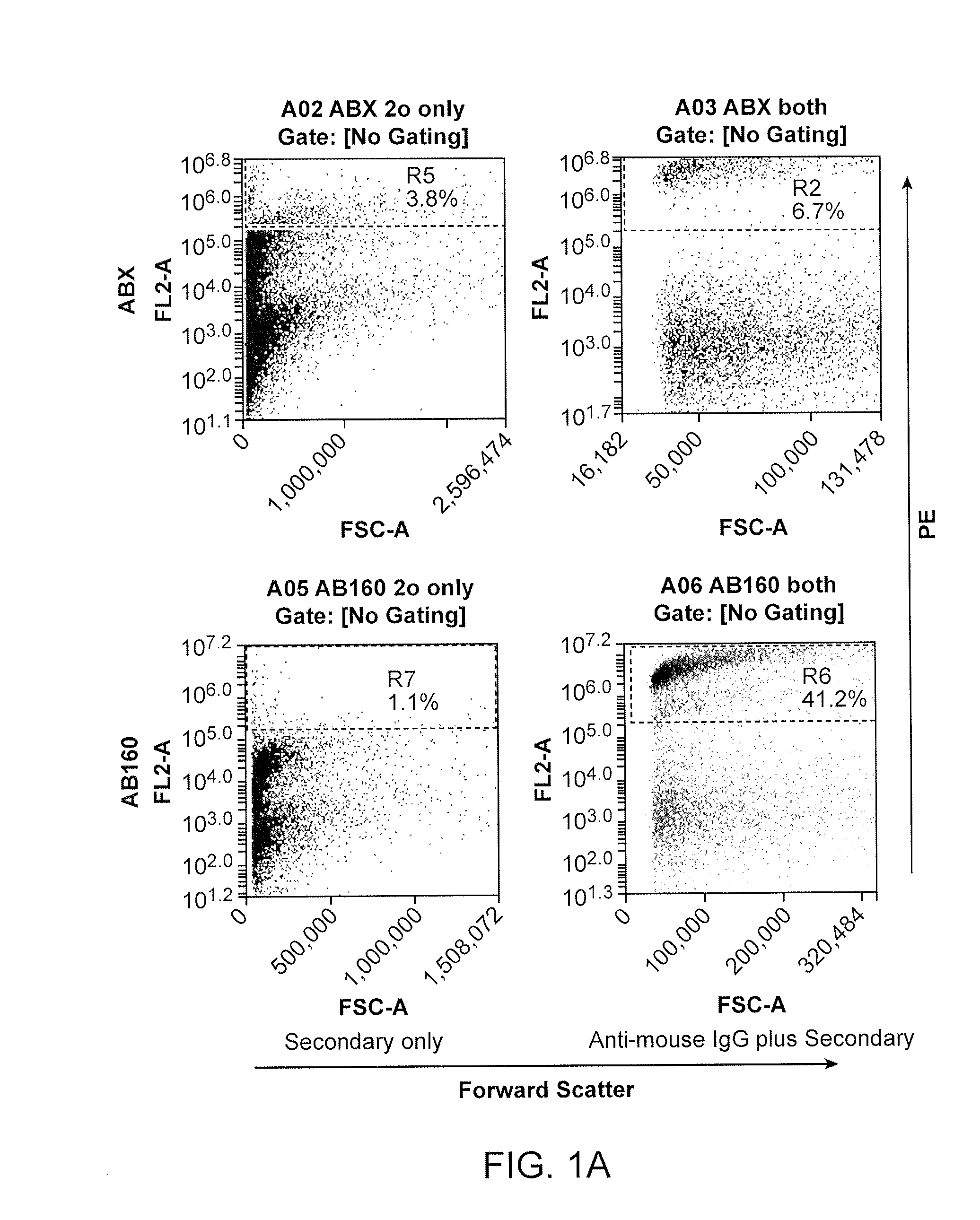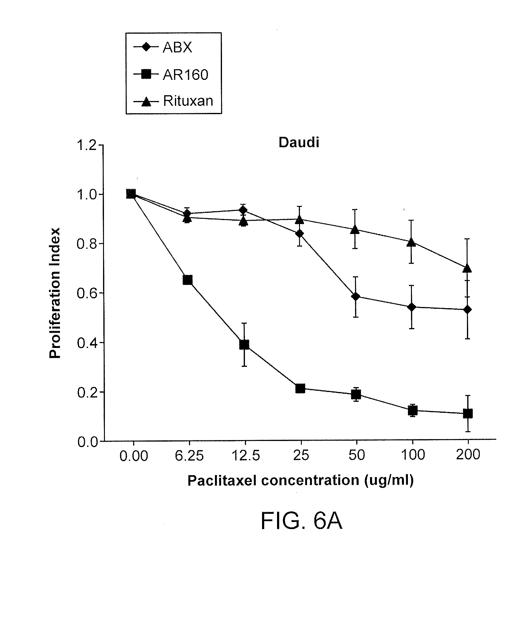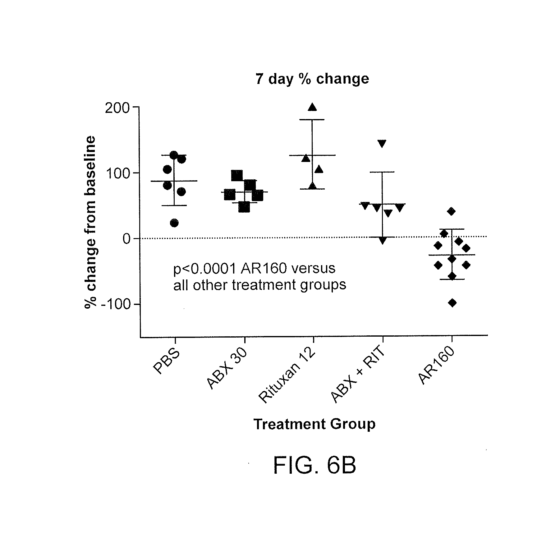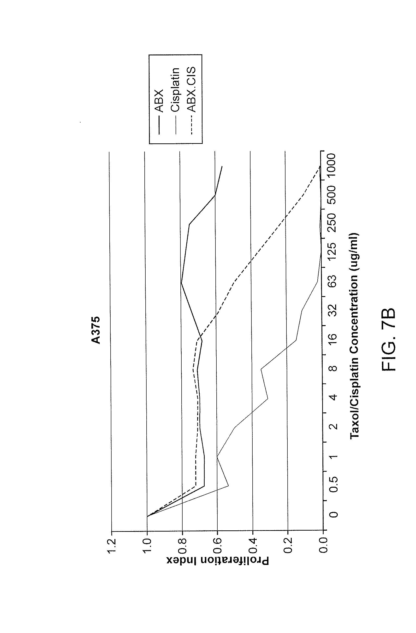 Following the general protocol above, athymic nude mice were injected with 1×106A375 human melanoma cells in the right flank and then treated with PBS, 12 mg/kg BEV, 30 mg/kg ABX, AB160, or pretreated with 1.2 mg/kg BEV and, 24 hr later, AB160. Data is represented at day 7-post and day 10-post treatment as tumor volume in mm3. FIGS. 11A-E track tumor size over 10 days. Only mice treated with AB160 (with or without pretreatment with BEV) showed a reduction in average tumor volume. See also FIG. 11F and FIG. 11G.