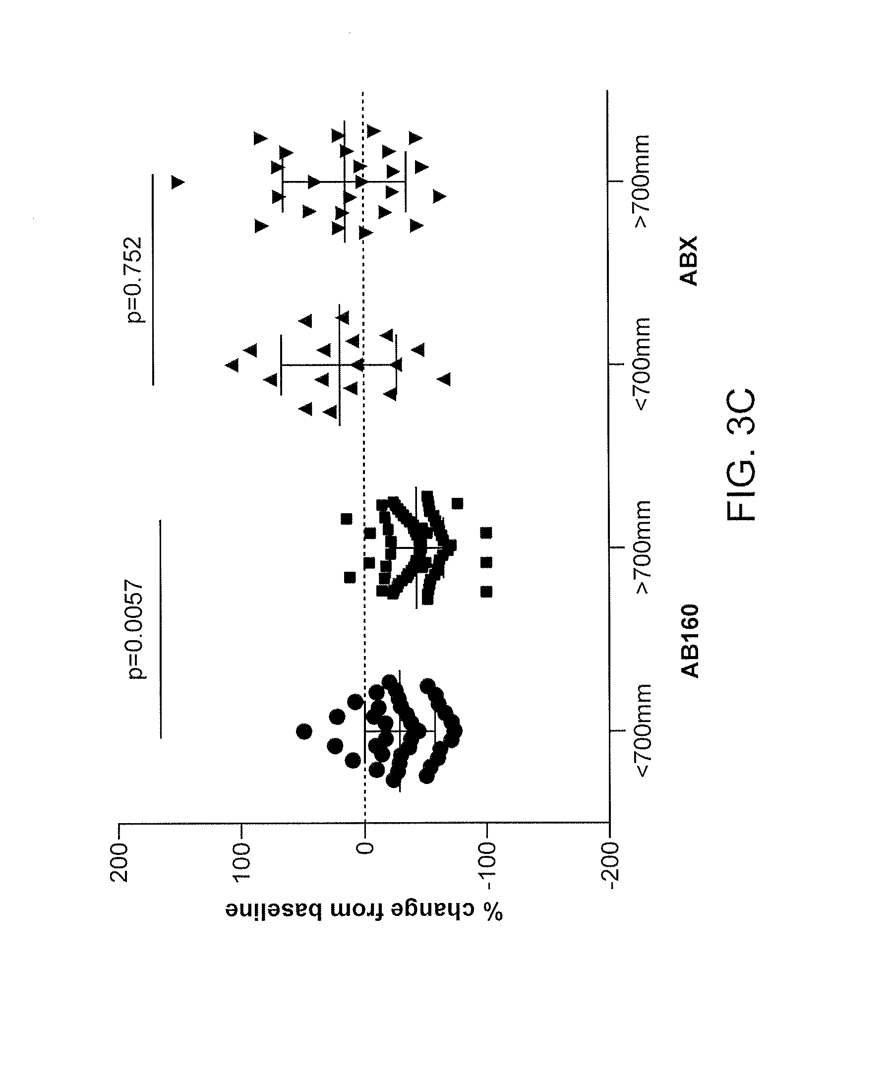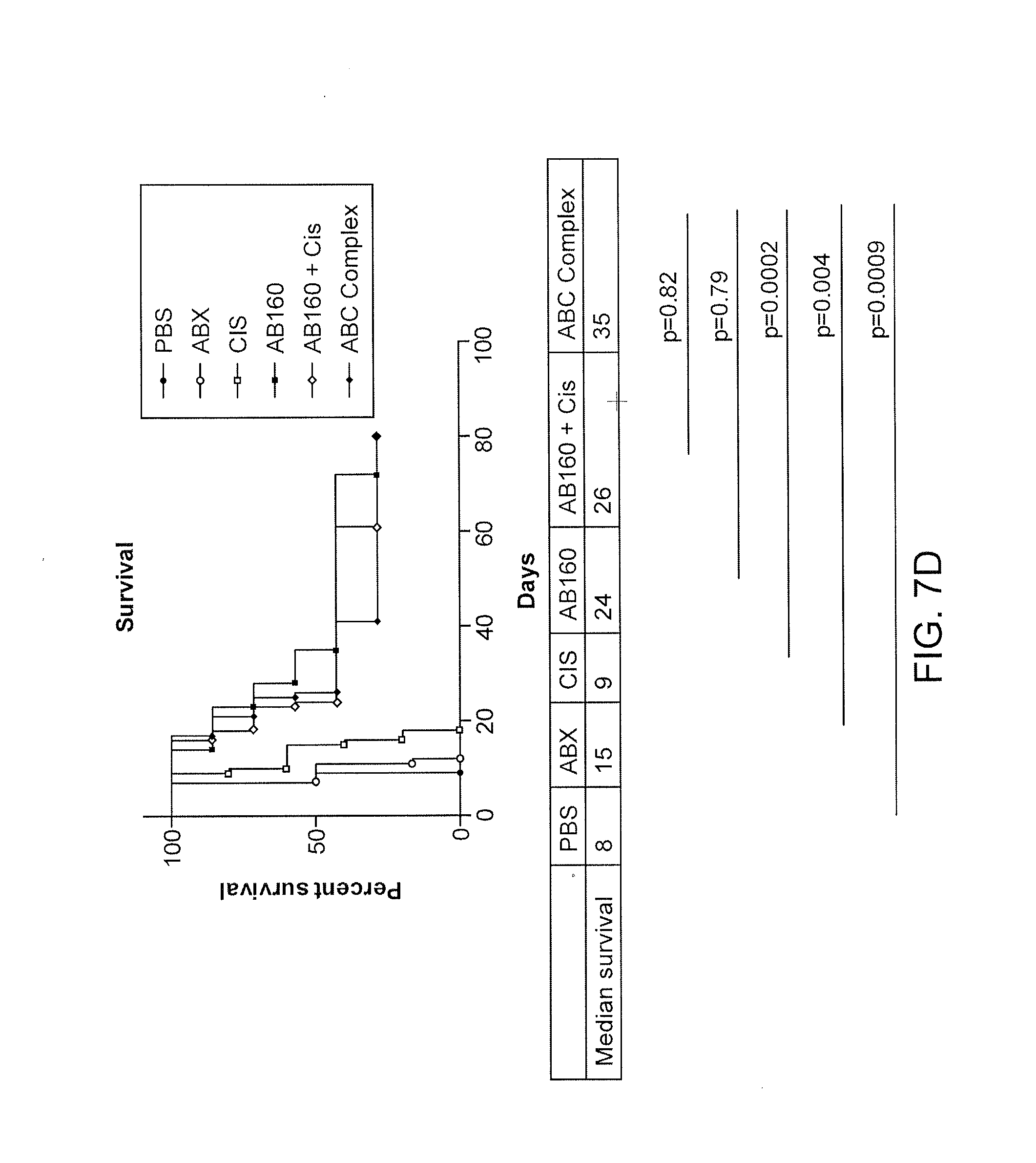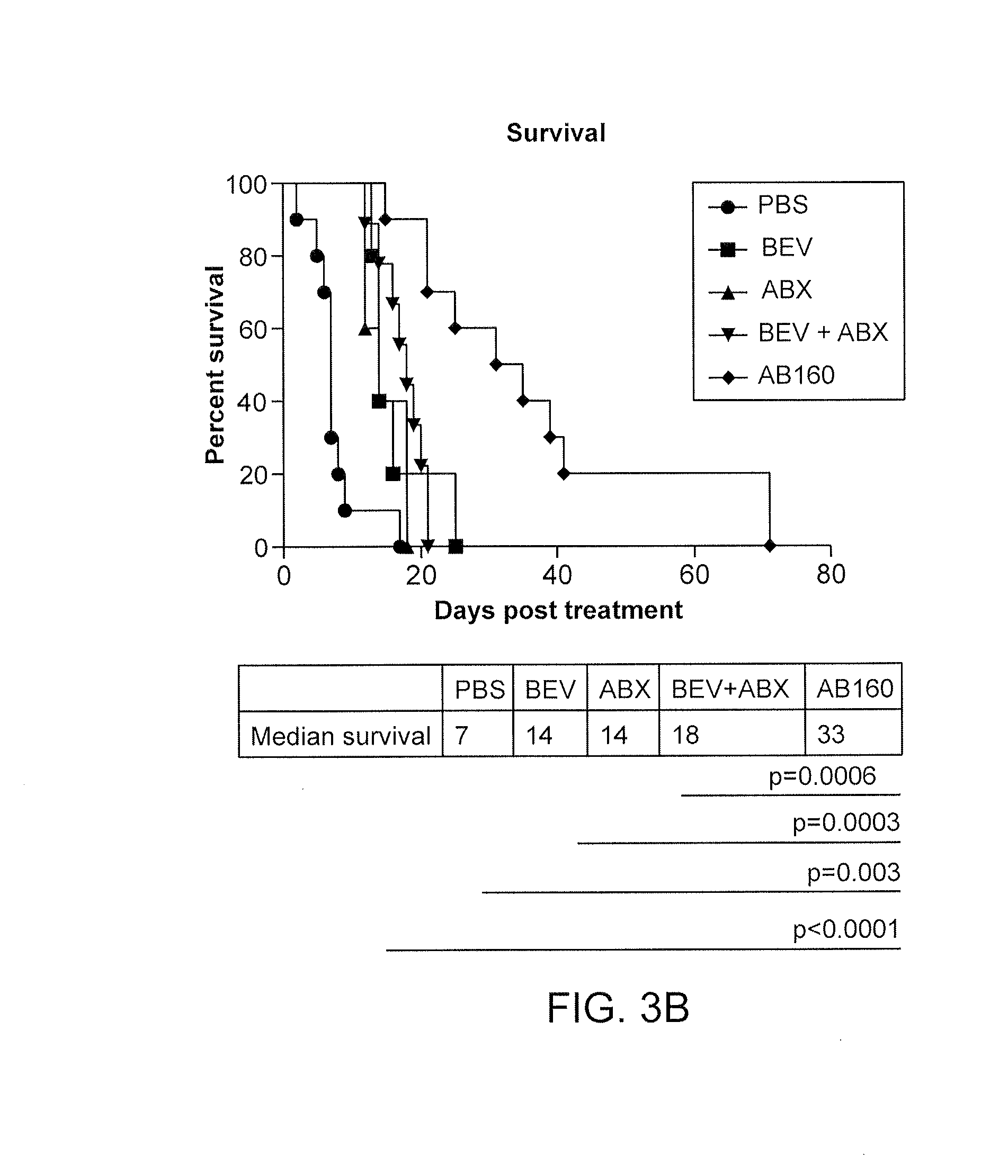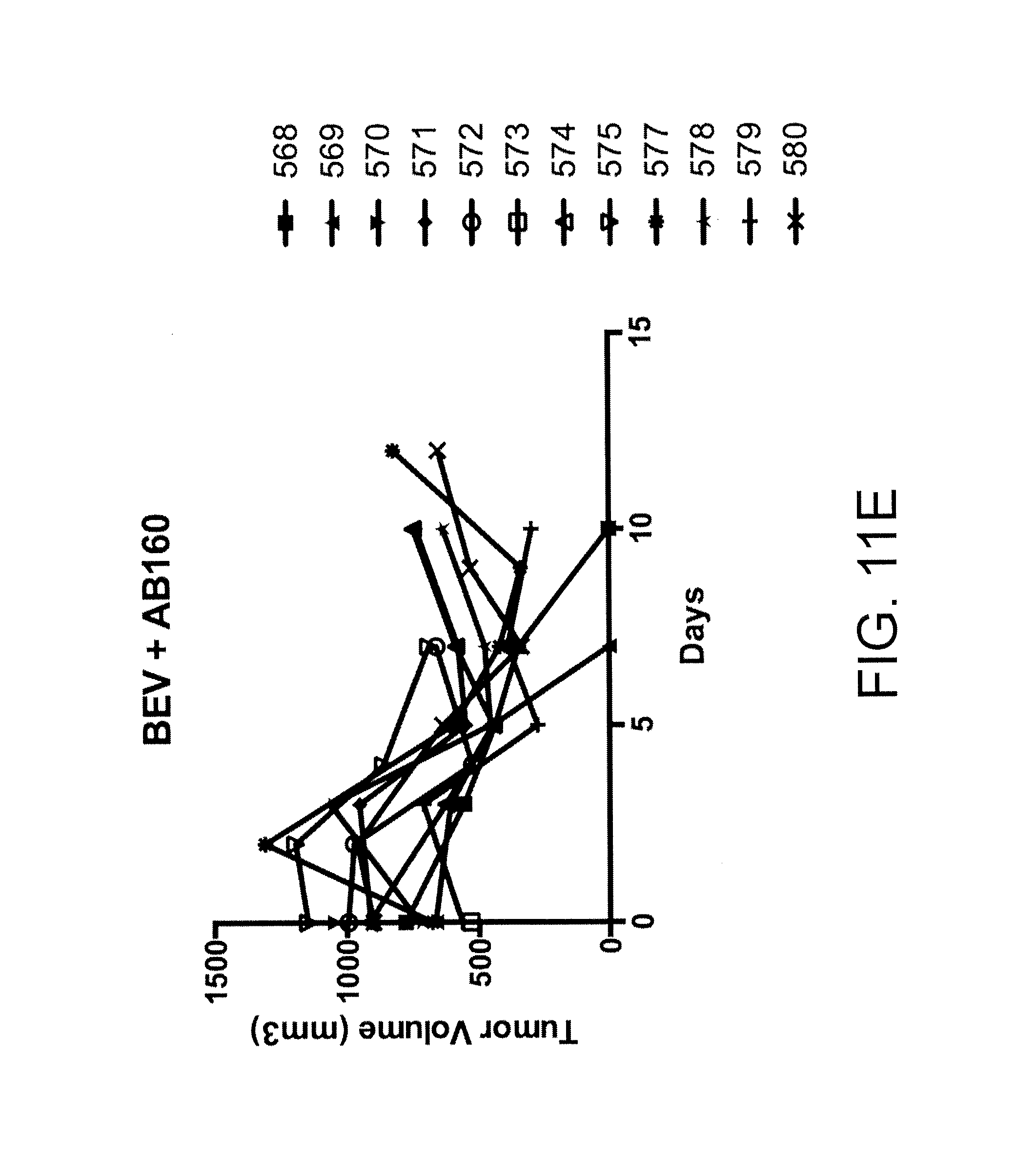 The day 10-post treatment data, as summarized in FIG. 11G, again show that pretreatment with BEV was associated with a stastically significant reduction in tumor volume over control or BEV alone (p≦0.0001), or ABX alone (p≦0.0001). Pretreatment with BEV before AB160 was also associated with a reduction in tumor volume over AB160 alone (p=0.02), with complete response in two mice.