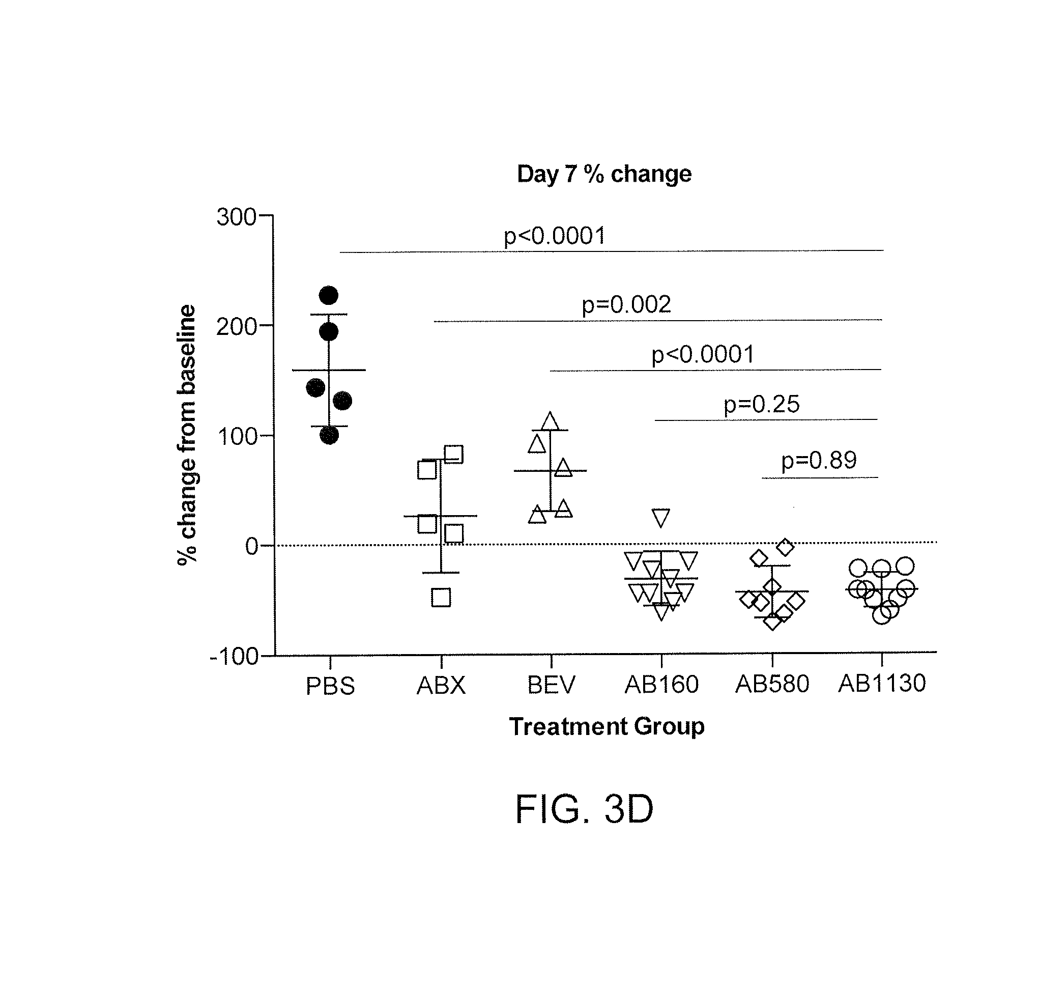 The day 7-post treatment data, as summarized in FIG. 11F, show that pretreatment with BEV was associated with a stastically significant reduction in tumor volume over control or BEV alone (p≦0.0001), or ABX alone (p≦0.0001).