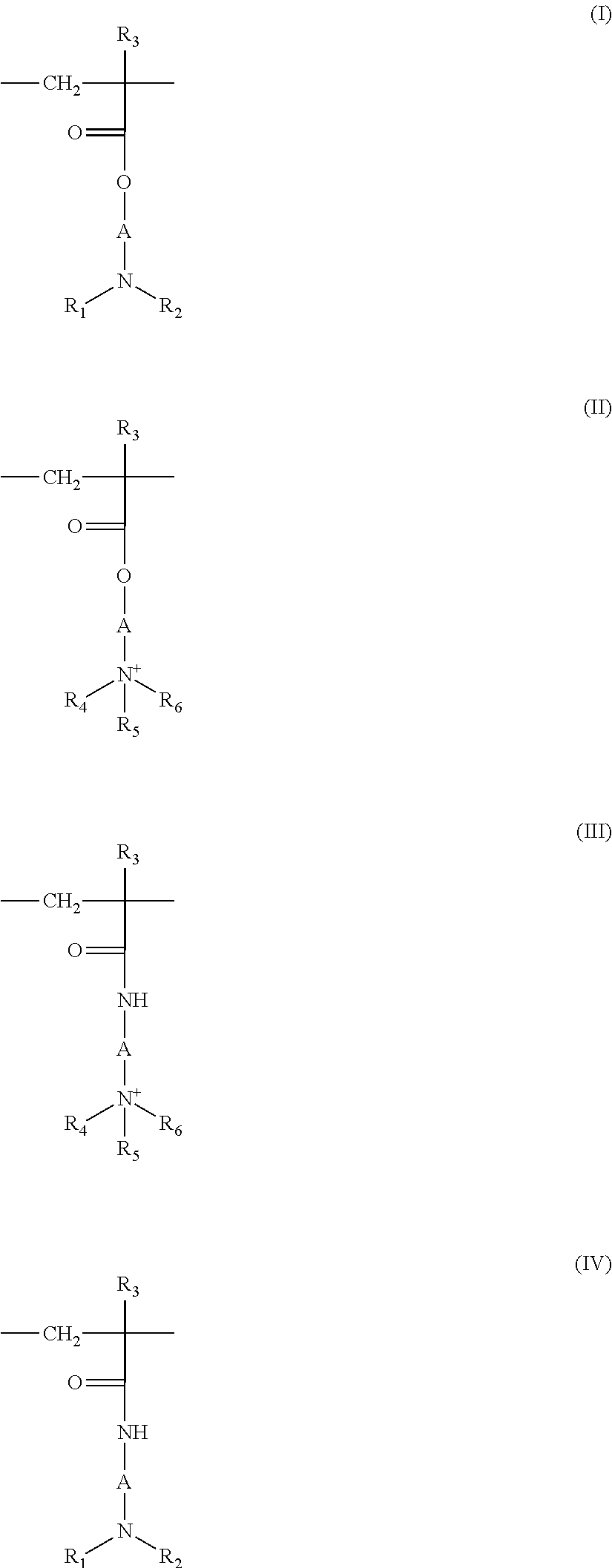 in which R, R1and R2are each chosen from a hydrogen atom, a C1-C20alkyl group, an aryl group and an alkylaryl group in which the alkyl part comprises from 1 to 20 carbon atoms. In particular, said monomer may be chosen from N-vinylformamide, N-methyl-N-vinylacetamide and N-vinylacetamide. Preferably, poly(vinylamine/N-vinylformamide) is used, as sold under the name Catiofast VMP by the company BASF or under the name Lupamin 9030 by the company BASF. These polymers may be formed, for example, by radical polymerization of a vinylamide monomer followed by partial acidic or basic hydrolysis of the amide functions to quaternizable amine functions, as described in patent applications WO 2007/005 577, U.S. Pat. Nos. 5,374,334, 6,426,383 and 6,894,110. (13) Cationic polyurethanes consisting essentially: