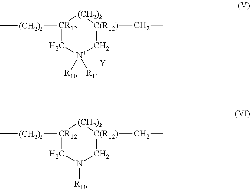Among the polymers defined above, mention may be made of dialkyldiallylammonium chloride homopolymers, more particularly dimethyldiallylammonium chloride homopolymer (INCI name: Polyquaternium-6) sold under the name Merquat® 100 by the company Nalco (and homologues thereof of low weight-average molecular weights) and dialkyldiallylammonium chloride copolymers, more particularly the copolymer of dimethyldiallylammonium chloride and of acrylamide sold under the name Merquat® 550. (8) Diquaternary ammonium polymers containing repeating units corresponding to formula (VII): in which: