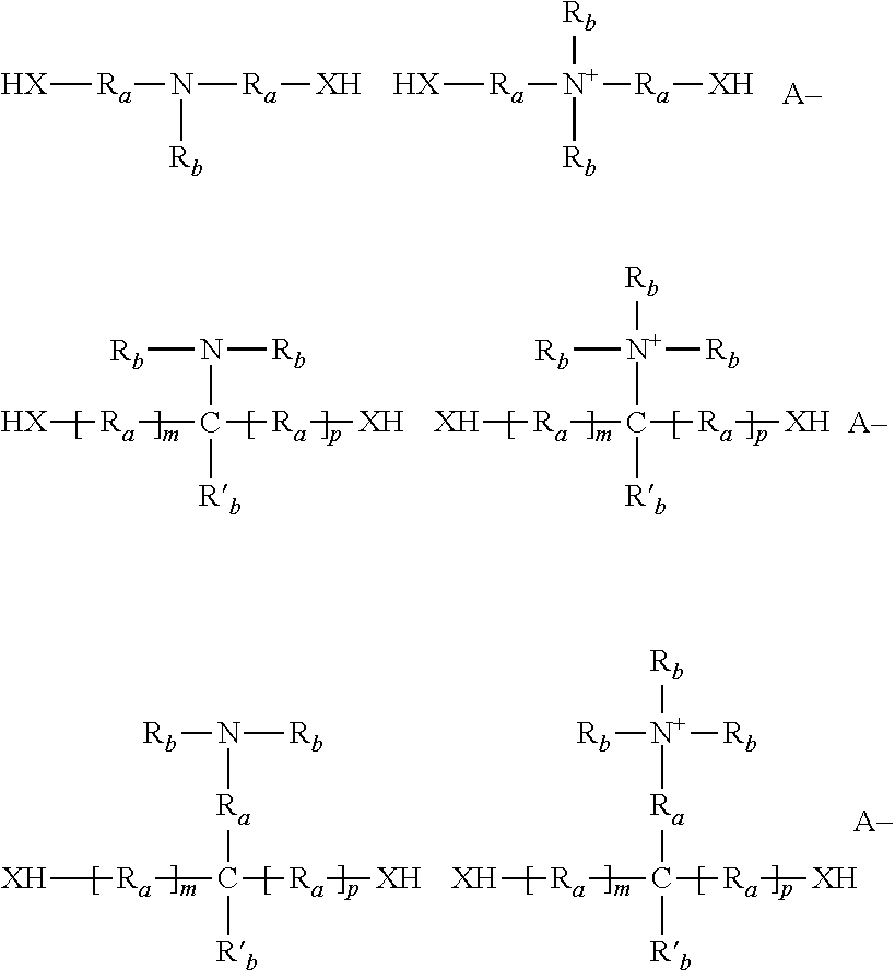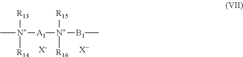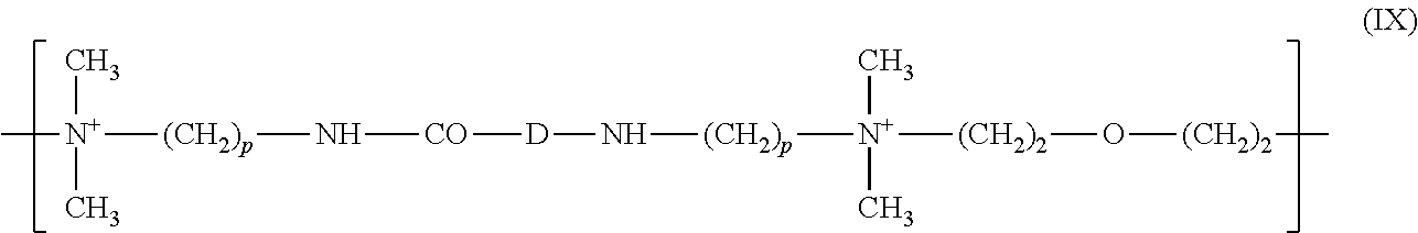 Preferably, X− is an anion such as chloride or bromide. Polymers of this type are described in particular in French patents 2 320 330, 2 270 846, 2 316 271, 2 336 434 and 2 413 907 and U.S. Pat. Nos. 2,273,780, 2,375,853, 2,388,614, 2,454,547, 3,206,462, 2,261,002, 2,271,378, 3,874,870, 4,001,432, 3,929,990, 3,966,904, 4,005,193, 4,025,617, 4,025,627, 4,025,653, 4,026,945 and 4,027,020. Use may more particularly be made of the polymers which consist of repeating units corresponding to formula (VIII): in which R13, R14, R15and R16, which are identical or different, each denote an alkyl or hydroxyalkyl group having from 1 to 4 carbon atoms approximately, n and p are integers ranging from 2 to 20 approximately, and X− is an anion derived from an organic or mineral acid. Preferably, R13, R14, R15and R16each denote a methyl group. As an example of a polymer that may be used corresponding to formula (VIII), mention may be made of hexadimethrine chloride, sold under the name Mexomer PO by the company Chimex. (9) Polyquaternary ammonium polymers consisting of units of formula (IX): in which: