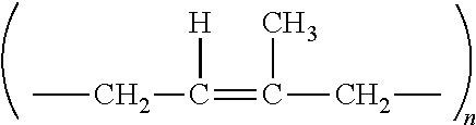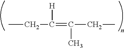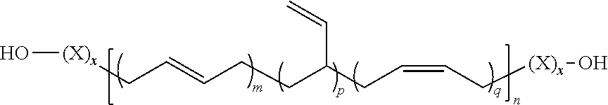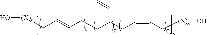 which are random copolymers, in particular of 1,4-cis-butadiene and of 1,4-trans-butadiene with m=0.17, p=0.65 and q=018 (mole fractions) and n is such that the number-average molecular weight Mn ranges from 1000 to 10 000, in particular from 2000 to 6000 (g·mol−1). Mention may in particular be made of the commercial products Krasol LBH-P 2000, 3000 or 5000 from Sartomer;