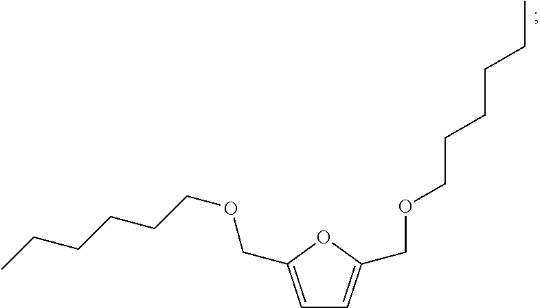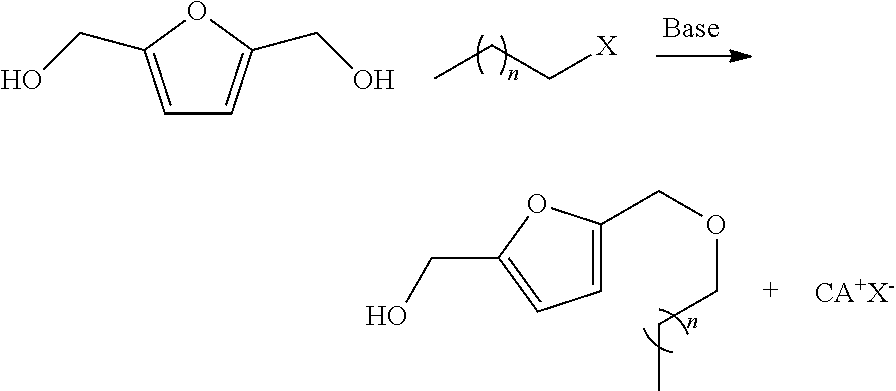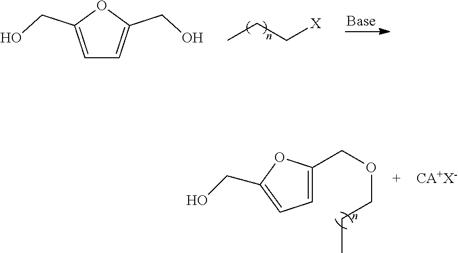 a. (5-((hexyloxy)methyl)furan-2-yl)methanol 23. A method of preparing a di-ether comprising: contacting FDM with a Brønsted base and a minimum of 2 molar equivalents of an alkyl-X species according to the following: wherein: “X” is the leaving group, “n” is an integer from 5 to 25, and “CA” is a conjugate acid of the base. 24. A di-ether of FDM prepared according to a. 2,5-bis((hexyloxy)methyl)furan b. 2,5-bis((dodecyloxy)methyl)furan and