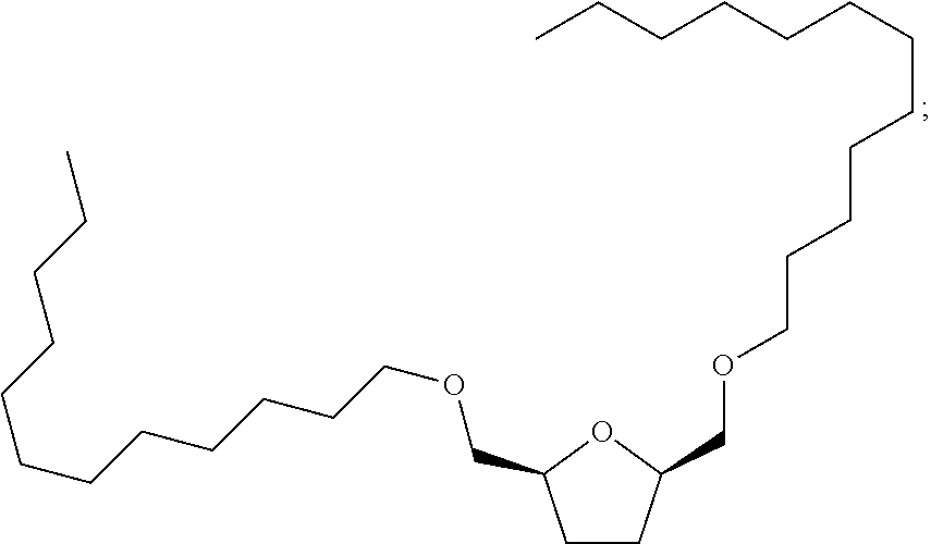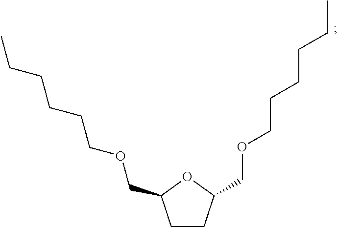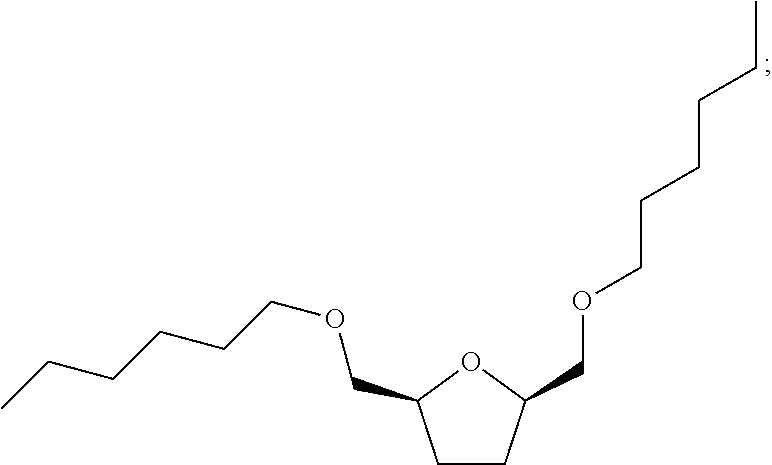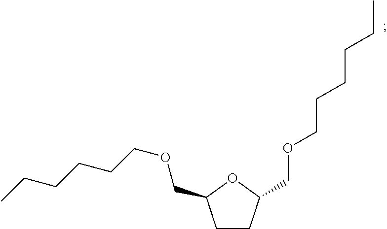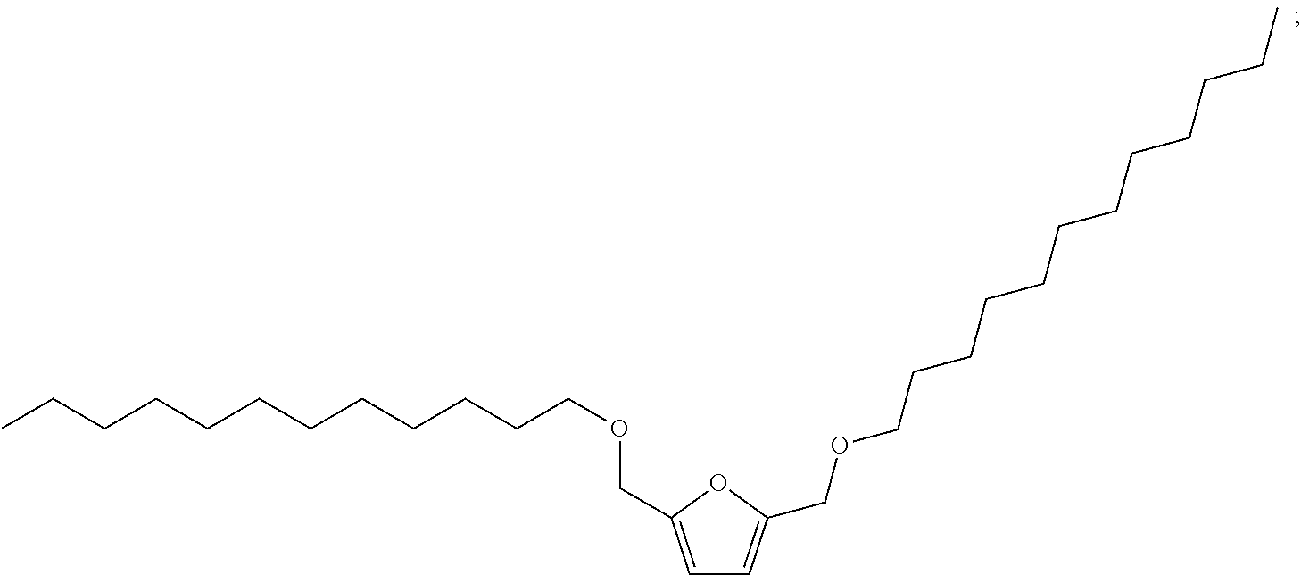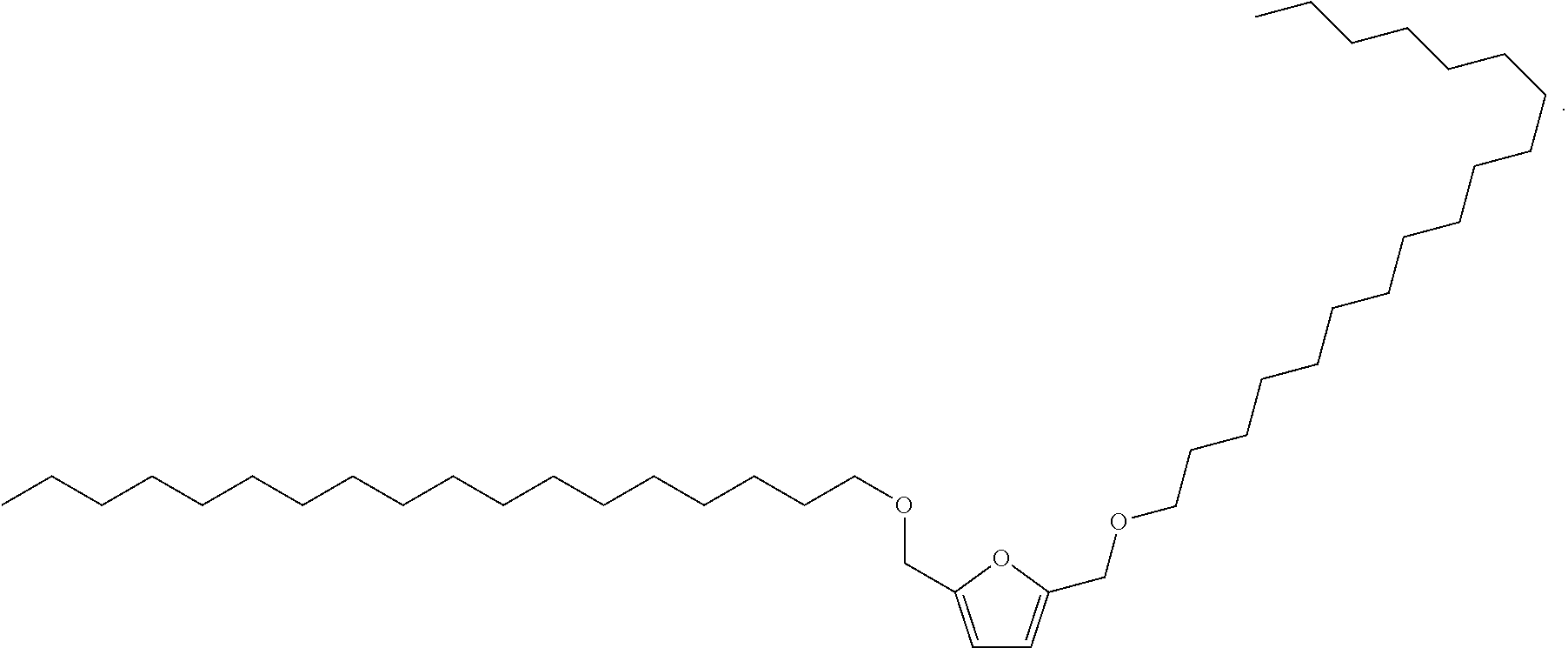 According to another embodiment, a primary amine derivative that is prepared using FDM mono-ether as the starting material can be, for example, the following: (5-((hexyloxy)methyl)furan-2-yl)methanamine Alternatively, one can also prepare a quaternary trimethylammonium salt such as: 1-(5-((hexyloxy)methyl)furan-2-yl)-N,N,N-trimethylmethanaminium iodide The present synthesis system is further illustrated in the following examples for making: A) bHMTHF di-ethers; B) bHMTHF mono-ethers; C) derivatives of bHMTHF mono-ethers; D) FDM di-ethers; E) FDM mono-ethers; and F) amphiphilic derivatives of FDM mono-ethers. An oven dried, single neck 10 mL round bottomed flask equipped with a PTFE coated magnetic stir bar was charged with 50 mg of a 9:1 mixture of ((2R,5S)-tetrahydrofuran-2,5-diyl)dimethanol and ((2S,5S)-tetrahydrofuran-2,5-diyl)dimethanol (0.378 mmol) and 5 mL of anhydrous DMSO. The flask was then immersed in an ice-brine bath (˜−10° C.) and, while stirring, 106 mg of potassium t-butoxide (0.946 mmol) added in portions and the mixture stirred for 30 minutes at this temperature. At this time, the neck was stoppered with a rubber septum and an argon gas inlet affixed via a 14″ needle. While vigorously stirring and under an argon blanket, 117 μL of 1-bromohexane (0.832 mmol) was added via syringe. The mixture was then warmed to room temperature and continued to react overnight. After this time, an aliquot was removed and spotted on a silica gel TLC plate, which exhibited a single band (cerium molybdate stain) after developing in 9:1 hexanes/ethyl acetate. The signature band for A (baseline) was patently absent, suggesting this reagent had fully converted. Here, the mixture was diluted with 5 mL of water and 5 mL of methylene chloride and partitioned and the aqueous layer extracted with 3-5 mL volumes of methylene chloride. The organic phases were combined, dried with anhydrous magnesium sulfate, filtered and concentrated under vacuum. The oily residue was dissolved in a minimum amount of methylene chloride and added to 20 g of silica gel, which was then dried under vacuum, furnishing product adsorbed silica gel. This material was added to a pre-fabricated silica gel column, where flash chromatography with hexanes to 10% ethyl acetate in hexanes afforded 64 mg of a B as light yellow oil after inspissation (56% of theoretical).1H NMR (400 MHz, CDCl3, salient peaks corresponding to the cis (meso) derivative in large excess) δ (ppm) 4.21 (m, 2H), 3.64 (m, 2H), 3.40-3.36 (m, 4H), 2.11 (m, 2H), 1.61 (m, 2H), 1.47 (t, J=6.2 Hz, 4H), 1.40 (m, 4H), 1.35-1.30 (m, 10H), 0.94 (t, J=7.0 Hz, 6H);13C NMR (100 MHz, CDCl3salient peaks corresponding to the cis (meso) derivative in large excess) δ (ppm) 87.1, 78.3, 68.9, 33.2, 31.2, 29.8, 25.4, 23.1, 13.3. An oven dried, single neck 10 mL round bottomed flask equipped with a PTFE coated magnetic stir bar was charged with 50 mg of a 9:1 mixture of ((2R,5S)-tetrahydrofuran-2,5-diyl)dimethanol and ((2S,5S)-tetrahydrofuran-2,5-diyl)dimethanol (0.378 mmol) and 5 mL of anhydrous DMSO. The flask was then immersed in an ice-brine bath (˜−10° C.) and, while stirring, 106 mg of potassium t-butoxide (0.946 mmol) added in portions and the mixture stirred for 30 minutes at this temperature. At this time, the neck was stoppered with a rubber septum and an argon gas inlet affixed via a 14″ needle. While vigorously stirring and under an argon blanket, 200 μL of 1-bromododecane (0.832 mmol) was added via syringe. The mixture was then warmed to room temperature and continued to react overnight. After this time, an aliquot was removed and spotted on a silica gel TLC plate, which exhibited a single band (cerium molybdate stain) after developing in 10:1 hexanes/ethyl acetate. The signature band for A (baseline) was noticeably absent, suggesting this reagent had fully converted. Here, the mixture was diluted with 5 mL of water and 5 mL of methylene chloride and partitioned and the aqueous layer extracted with 3-5 mL volumes of methylene chloride. The organic phases were combined, dried with anhydrous magnesium sulfate, filtered and concentrated under vacuum. The oily residue was dissolved in a minimum amount of methylene chloride and added to 20 g of silica gel, which was then dried under vacuum, furnishing product adsorbed silica gel. This material was added to a pre-fabricated silica gel column, where flash chromatography with hexanes to 7% ethyl acetate in hexanes afforded 118 mg of a B as a beige solid after concentration (65% of theoretical).1H NMR (400 MHz, CDCl3, salient peaks corresponding to the cis (meso) derivative in large excess) δ (ppm) 4.20 (m, 2H), 3.63 (m, 2H), 3.41-3.38 (m, 4H), 2.09 (m, 2H), 1.59 (m, 2H), 1.49 (t, J=6.2 Hz, 4H), 1.42 (m, 4H), 1.38-1.30 (m, 34H), 0.92 (t, J=6.8 Hz, 6H);13C NMR (100 MHz, CDCl3salient peaks corresponding to the cis (meso) derivative in large excess) δ (ppm) 87.4, 78.1, 69.1, 33.0, 31.2, 30.9, 29.8, 28.7, 26.2, 25.4, 24.9, 24.1, 23.3, 22.1, 13.3. An oven dried, single neck 10 mL round bottomed flask equipped with a PTFE coated magnetic stir bar was charged with 50 mg of a 9:1 mixture of ((2R,5S)-tetrahydrofuran-2,5-diyl)dimethanol and ((2S,5S)-tetrahydrofuran-2,5-diyl)dimethanol (0.378 mmol) and 5 mL of anhydrous DMSO. The flask was then immersed in an ice-brine bath (˜−10° C.) and, while stirring, 106 mg of potassium t-butoxide (0.946 mmol) added in portions and the mixture stirred for 30 minutes at this temperature. At this time, the neck was stoppered with a rubber septum and an argon gas inlet affixed via a 14″ needle. While vigorously stirring and under an argon blanket, 277 μL of 1-bromooctadecane (0.832 mmol) was added via syringe. The mixture was then warmed to room temperature and continued to react overnight. After this time, an aliquot was removed and spotted on a silica gel TLC plate, which exhibited a single band (cerium molybdate stain) after developing in 11:1 hexanes/ethyl acetate. The sign