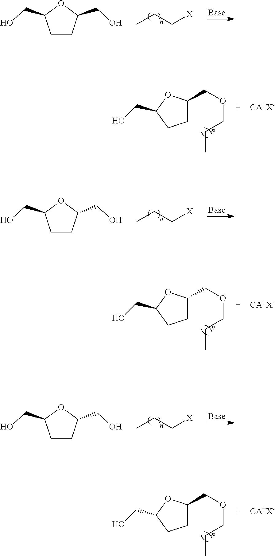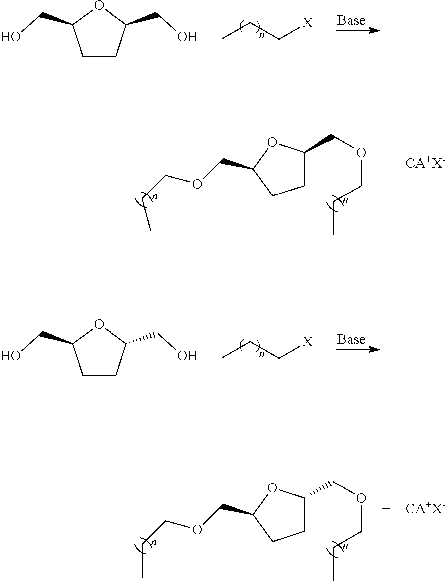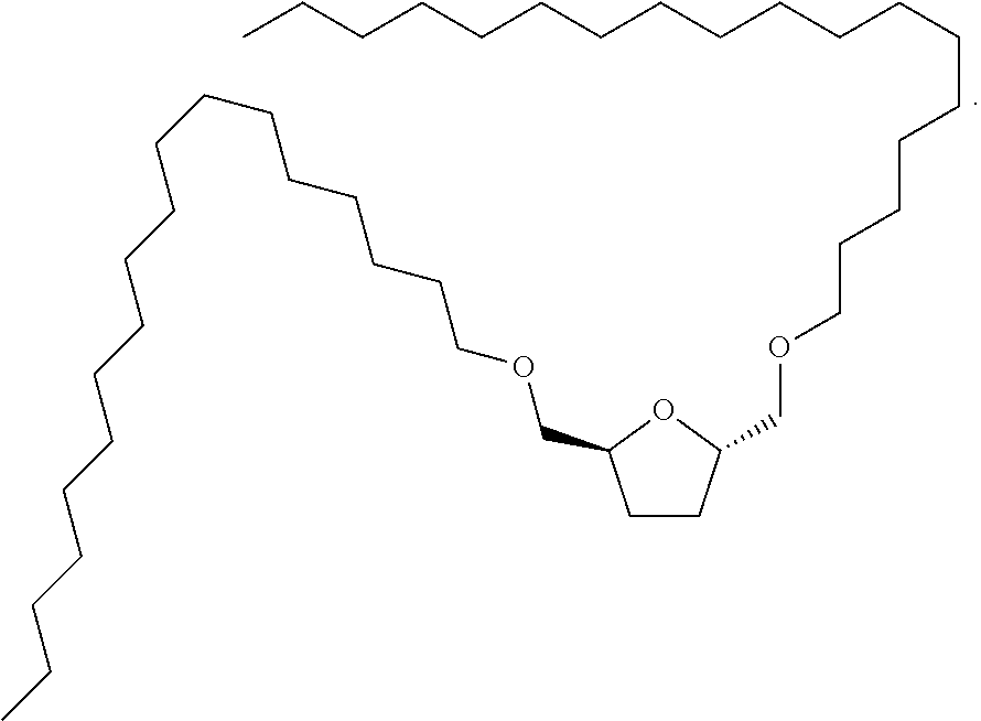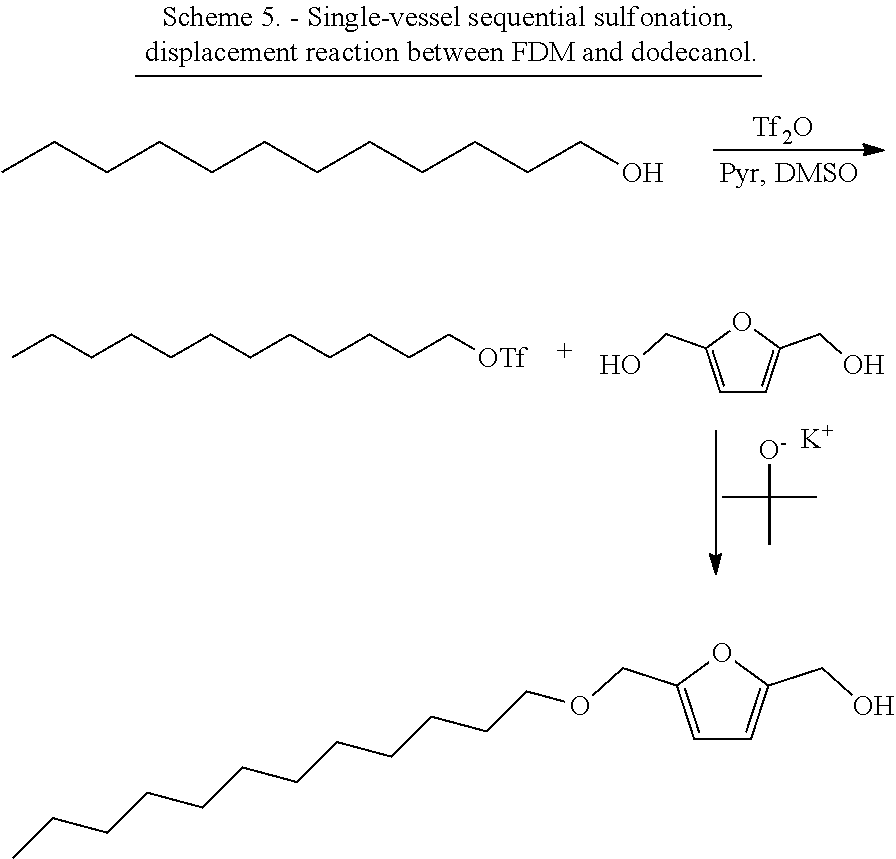 According to another embodiment, a primary amine derivative that is prepared using FDM mono-ether as the starting material can be, for example, the following: (5-((hexyloxy)methyl)furan-2-yl)methanamine Alternatively, one can also prepare a quaternary trimethylammonium salt such as: 1-(5-((hexyloxy)methyl)furan-2-yl)-N,N,N-trimethylmethanaminium iodide The present synthesis system is further illustrated in the following examples for making: A) bHMTHF di-ethers; B) bHMTHF mono-ethers; C) derivatives of bHMTHF mono-ethers; D) FDM di-ethers; E) FDM mono-ethers; and F) amphiphilic derivatives of FDM mono-ethers. An oven dried, single neck 10 mL round bottomed flask equipped with a PTFE coated magnetic stir bar was charged with 50 mg of a 9:1 mixture of ((2R,5S)-tetrahydrofuran-2,5-diyl)dimethanol and ((2S,5S)-tetrahydrofuran-2,5-diyl)dimethanol (0.378 mmol) and 5 mL of anhydrous DMSO. The flask was then immersed in an ice-brine bath (˜−10° C.) and, while stirring, 106 mg of potassium t-butoxide (0.946 mmol) added in portions and the mixture stirred for 30 minutes at this temperature. At this time, the neck was stoppered with a rubber septum and an argon gas inlet affixed via a 14″ needle. While vigorously stirring and under an argon blanket, 117 μL of 1-bromohexane (0.832 mmol) was added via syringe. The mixture was then warmed to room temperature and continued to react overnight. After this time, an aliquot was removed and spotted on a silica gel TLC plate, which exhibited a single band (cerium molybdate stain) after developing in 9:1 hexanes/ethyl acetate. The signature band for A (baseline) was patently absent, suggesting this reagent had fully converted. Here, the mixture was diluted with 5 mL of water and 5 mL of methylene chloride and partitioned and the aqueous layer extracted with 3-5 mL volumes of methylene chloride. The organic phases were combined, dried with anhydrous magnesium sulfate, filtered and concentrated under vacuum. The oily residue was dissolved in a minimum amount of methylene chloride and added to 20 g of silica gel, which was then dried under vacuum, furnishing product adsorbed silica gel. This material was added to a pre-fabricated silica gel column, where flash chromatography with hexanes to 10% ethyl acetate in hexanes afforded 64 mg of a B as light yellow oil after inspissation (56% of theoretical).1H NMR (400 MHz, CDCl3, salient peaks corresponding to the cis (meso) derivative in large excess) δ (ppm) 4.21 (m, 2H), 3.64 (m, 2H), 3.40-3.36 (m, 4H), 2.11 (m, 2H), 1.61 (m, 2H), 1.47 (t, J=6.2 Hz, 4H), 1.40 (m, 4H), 1.35-1.30 (m, 10H), 0.94 (t, J=7.0 Hz, 6H);13C NMR (100 MHz, CDCl3salient peaks corresponding to the cis (meso) derivative in large excess) δ (ppm) 87.1, 78.3, 68.9, 33.2, 31.2, 29.8, 25.4, 23.1, 13.3. An oven dried, single neck 10 mL round bottomed flask equipped with a PTFE coated magnetic stir bar was charged with 50 mg of a 9:1 mixture of ((2R,5S)-tetrahydrofuran-2,5-diyl)dimethanol and ((2S,5S)-tetrahydrofuran-2,5-diyl)dimethanol (0.378 mmol) and 5 mL of anhydrous DMSO. The flask was then immersed in an ice-brine bath (˜−10° C.) and, while stirring, 106 mg of potassium t-butoxide (0.946 mmol) added in portions and the mixture stirred for 30 minutes at this temperature. At this time, the neck was stoppered with a rubber septum and an argon gas inlet affixed via a 14″ needle. While vigorously stirring and under an argon blanket, 200 μL of 1-bromododecane (0.832 mmol) was added via syringe. The mixture was then warmed to room temperature and continued to react overnight. After this time, an aliquot was removed and spotted on a silica gel TLC plate, which exhibited a single band (cerium molybdate stain) after developing in 10:1 hexanes/ethyl acetate. The signature band for A (baseline) was noticeably absent, suggesting this reagent had fully converted. Here, the mixture was diluted with 5 mL of water and 5 mL of methylene chloride and partitioned and the aqueous layer extracted with 3-5 mL volumes of methylene chloride. The organic phases were combined, dried with anhydrous magnesium sulfate, filtered and concentrated under vacuum. The oily residue was dissolved in a minimum amount of methylene chloride and added to 20 g of silica gel, which was then dried under vacuum, furnishing product adsorbed silica gel. This material was added to a pre-fabricated silica gel column, where flash chromatography with hexanes to 7% ethyl acetate in hexanes afforded 118 mg of a B as a beige solid after concentration (65% of theoretical).1H NMR (400 MHz, CDCl3, salient peaks corresponding to the cis (meso) derivative in large excess) δ (ppm) 4.20 (m, 2H), 3.63 (m, 2H), 3.41-3.38 (m, 4H), 2.09 (m, 2H), 1.59 (m, 2H), 1.49 (t, J=6.2 Hz, 4H), 1.42 (m, 4H), 1.38-1.30 (m, 34H), 0.92 (t, J=6.8 Hz, 6H);13C NMR (100 MHz, CDCl3salient peaks corresponding to the cis (meso) derivative in large excess) δ (ppm) 87.4, 78.1, 69.1, 33.0, 31.2, 30.9, 29.8, 28.7, 26.2, 25.4, 24.9, 24.1, 23.3, 22.1, 13.3. An oven dried, single neck 10 mL round bottomed flask equipped with a PTFE coated magnetic stir bar was charged with 50 mg of a 9:1 mixture of ((2R,5S)-tetrahydrofuran-2,5-diyl)dimethanol and ((2S,5S)-tetrahydrofuran-2,5-diyl)dimethanol (0.378 mmol) and 5 mL of anhydrous DMSO. The flask was then immersed in an ice-brine bath (˜−10° C.) and, while stirring, 106 mg of potassium t-butoxide (0.946 mmol) added in portions and the mixture stirred for 30 minutes at this temperature. At this time, the neck was stoppered with a rubber septum and an argon gas inlet affixed via a 14″ needle. While vigorously stirring and under an argon blanket, 277 μL of 1-bromooctadecane (0.832 mmol) was added via syringe. The mixture was then warmed to room temperature and continued to react overnight. After this time, an aliquot was removed and spotted on a silica gel TLC plate, which exhibited a single band (cerium molybdate stain) after developing in 11:1 hexanes/ethyl acetate. The sign