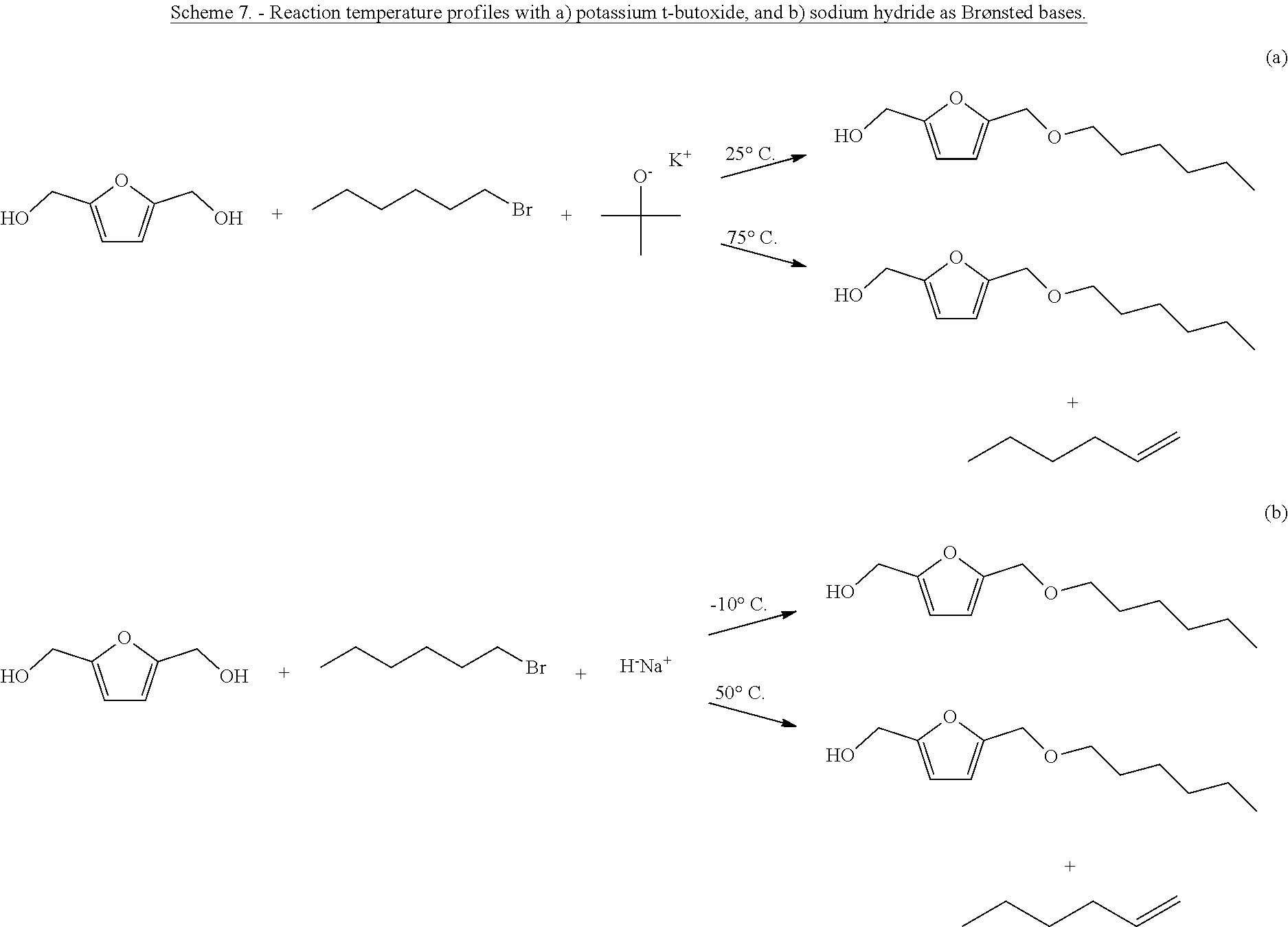 Additionally, in another aspect, the present disclosure pertains to derivative compounds from the linear mono-ethers of FDM and bHMTHF described above and methods for making the derivatives. These derivative compounds are amphiphilic variants of the mono-ethers and are valued as precursors or plausible bio-based surfactants, dispersants, and/or hydrophiles. Additional features and advantages of the present process will be disclosed in the following detailed description. It is understood that both the foregoing summary and the following detailed description and examples are merely representative of the invention, and are intended to provide an overview for understanding the invention as claimed. The present synthetic processes opens a pathway for direct preparation of linear alkyl ethers from the glycols FDM and/or bHMTHF, molecules that arise from the reduction of fructose derived 5-(hydroxymethyl)furfural (HMF) under mild conditions, and their derivative chemical compounds. (Although not necessary, in certain embodiments, the process may also include either first partially reducing HMF to FDM or fully reducing HMF to bHMTHFs in hydrogenation steps prior to selective etherification according to the present reaction process described herein.) The alkyl ethers, in turn, are valuable precursors with bio-based amphiphilic properties that can be used in surfactants, dispersants, and plasticizers. In general, the process for generating alkyl ethers can be implemented in a single reaction step, in which the FDM or bHMTHF glycol is reacted with either one or two equivalents of a halogenated or sulfonated (leaving group) alkane, depending respectively on whether a mono- or di-ether product is desired. A hindered Brønsted base with a minimum pKa of about 10, preferably about 16, or an unhindered Brønsted base having a difference in pKa (ΔpKa) of ≧15 relative to the pKa of a hydroxyl group of either the FDM or bHMTHF is used to deprotonate the —OH moieties of the glycols, enhancing their nucleophilicities by several orders of magnitude towards nucleofuge displacement. (It is believed that with a pronounced difference in the pKa between the Brønsted base and the —OH moieties of the FDM and/or bHMTHF glycols, the Brønsted base should have a limited propensity to react with an alkyl halide or sulfonate in a nucleophilic substitution and/or elimination.) A polar aprotic organic solvent with a dielectric constant of ≧10, preferably ≧30, is employed to augment the basicity of the Brønsted base via charge separation capacities. Typically, the reaction is conducted at a temperature in a range from about −20° C. to about 100° C., over a period of about 2 or 3 hours. In some other iterations the time may involve about 4 or 8 hours up to about 12 or 24 hours, as conditions may dictate. As stated, the Brønsted base in the reaction serves to deprotonate the —OH moieties of the glycols. This helps to enhance the corresponding nucleophilicity of the glycols FDM and bHMTHF by about at least 6 or more orders of magnitude (e.g., 8-10-12) and drives halide/sulfonate displacement on the alkyl reagent. The relative strength of a Brønsted base used in the reaction is of essence in furnishing high conversions of the glycols to, in particular, mono-alkyl ethers. For some Brønsted bases that have a pKa of at least 10 to about 15, the synthesis reaction usually requires the addition of heat to proceed; hence, reaction temperatures of about 45° C.-50° C. or greater. This, however, can increase the risk of generating side-products (e.g., product of Brønsted base-nucleophilic substitution with the alkyl halide/sulfonate and/or alkenes formed from Brønsted base-mediated elimination of the alkyl halide/sulfonate) and reducing the overall yield of the desired synthesis. To minimize the generation of side products and counteract this phenomenon, a Brønsted base that has a pKa of at least ˜≧16, typically ≧20, is favored according to certain embodiments of the present process. Brønsted bases with a greater pKa more easily reacts with the —OH moieties of the glycols. This is an advantage that helps one operate effectively the reaction at about ambient room temperatures (e.g., ˜18° C.-22° C.) or lower temperatures. Some suitable Brønsted bases may include, for example, hydroxides (e.g., methoxide, ethoxide, t-butoxide, and benzyl oxide). Preferably, Brønsted bases having pKa's ≧30 are used, as the equilibrium for deprotonation favors generation of the desired products, such as illustrated in the examples in Scheme 3. Certain favored Brønsted bases of this type may include, for example, metallic hydrides (e.g., lithium, potassium, or sodium hydrides); metal amides (e.g., potassium or sodium amides); lithium diisopropylamide (LDA); organometallic compounds (e.g., alkyl lithium (e.g., methyl-lithium, n-butyl-lithium, or phenyl-lithium), alkyl magnesium, or alkyl cuprate) and Grignard reagents (e.g., ethylmagnesium bromide, phenylmagnesium bromide). In contrast, certain disfavored Brønsted bases may include, for example, nitrogen-centered bases (e.g., tertiary amines, aryl amine), because of low-pKa-favoring reactants and nucleophilic propensities. Reaction (a) shows when using a Brønsted base having a pKa˜16, the reaction tends to be at equilibrium between product and reactants. In Reaction (b), when using a Brønsted base having a pKa˜20, the reaction tend to favor the product more, whereas in Reaction (c) when using a Brønsted base having pKa≧30, the reaction is driven completely towards product formation. Another factor according to an embodiment of the present invention is to employ a Brønsted base that has molecular bulk. Propitiously, the bulky Brønsted base impedes undesired nucleophilic substitutions of the Brønsted base with the alkyl halide/sulfonate. Hence, a more sterically hindered Brønsted base enhances more effectively the reaction to produce predominantly the ether 