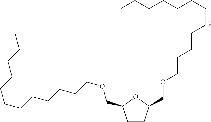c. 2,5-bis((octadecyloxy)methyl)furan 25. A method of preparing a mono-ether comprising: contacting bHMTHFs with a Brønsted base and 1 or less molar equivalents of an alkyl-X species according to at least one of the following: wherein: “X” is the leaving group, “n” is an integer from 5 to 25, and “CA” is a conjugate acid. 26. A mono-ether of bHMTHF prepared according to a. ((2S,5R)-5-((hexyloxy)methyl)tetrahydrofuran-2-yl)methanol b. ((2S,5S)-5-((hexyloxy)methyl)tetrahydrofuran-2-yl)methanol c. ((2S,5S)-5-((hexyloxy)methyl)tetrahydrofuran-2-yl)methanol d. ((2S,5R)-5-((dodecyloxy)methyl)tetrahydrofuran-2-yl)methanol e. ((2S,5S)-5-((dodecyloxy)methyl)tetrahydrofuran-2-yl)methanol f. ((2S,5S)-5-((dodecyloxy)methyl)tetrahydrofuran-2-yl)methanol g. ((2S,5R)-5-((octadecyloxy)methyl)tetrahydrofuran-2-yl)methanol h. ((2S,5S)-5-((octadecyloxy)methyl)tetrahydrofuran-2-yl)methanol i. ((2S,5S)-5-((octadecyloxy)methyl)tetrahydrofuran-2-yl)methanol 27. A method of preparing a di-ether comprising: contacting bHMTHFs with a Brønsted base and a minimum of 2 molar equivalents of an alkyl-X species according to the following: wherein: “X” is the leaving group, “n” is an integer from 5 to 25, and “CA” is a conjugate acid. 28. A di-ether of bHMTHF prepared according to a. (2R,5S)-2,5-bis((hexyloxy)methyl)tetrahydrofuran b. (2S,5S)-2,5-bis((hexyloxy)methyl)tetrahydrofuran c. (2R,5S)-2,5-bis((dodecyloxy)methyl)tetrahydrofuran d. (2S,5S)-2,5-bis((dodecyloxy)methyl)tetrahydrofuran e. (2R,5S)-2,5-bis((octadecyloxy)methyl)tetrahydrofuran and