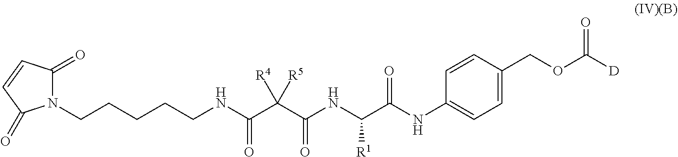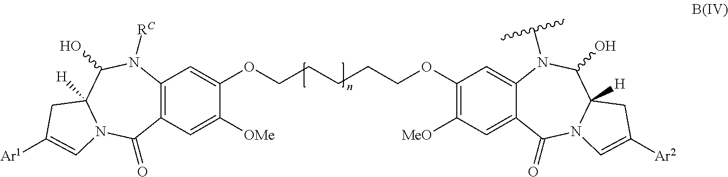 D is a drug moiety of formula A or of formula B: