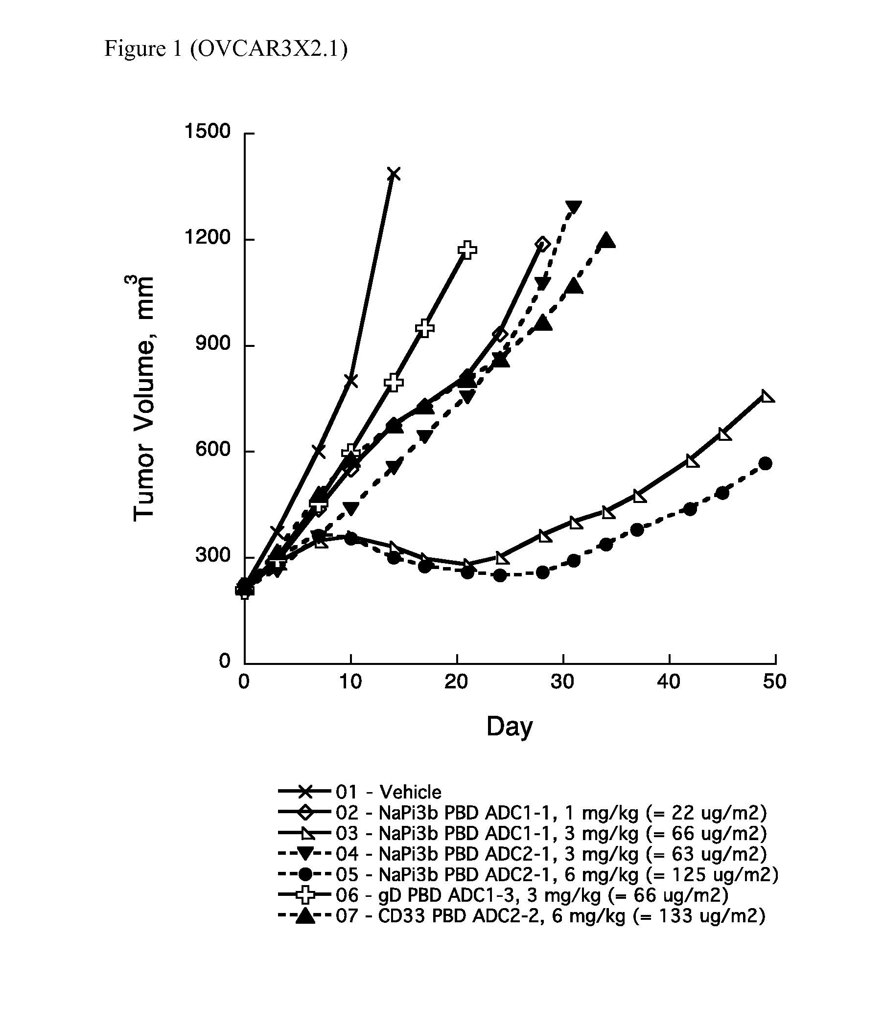 FIG. 1 shows efficacy comparison of NaPi3b ADCs in SCID-beige mice with OVCAR3X2.1 human ovarian tumors. NaPi3b PBD ADC1-1 and ADC2-1 both showed dose-dependent inhibition of tumor growth compared with vehicle group. The non-targeting control gD or CD33 PBD ADCs had a noticeable effect on the tumor growth; however, the effect of the corresponding NaPi3b PBD ADCs at the matching dose was superior.