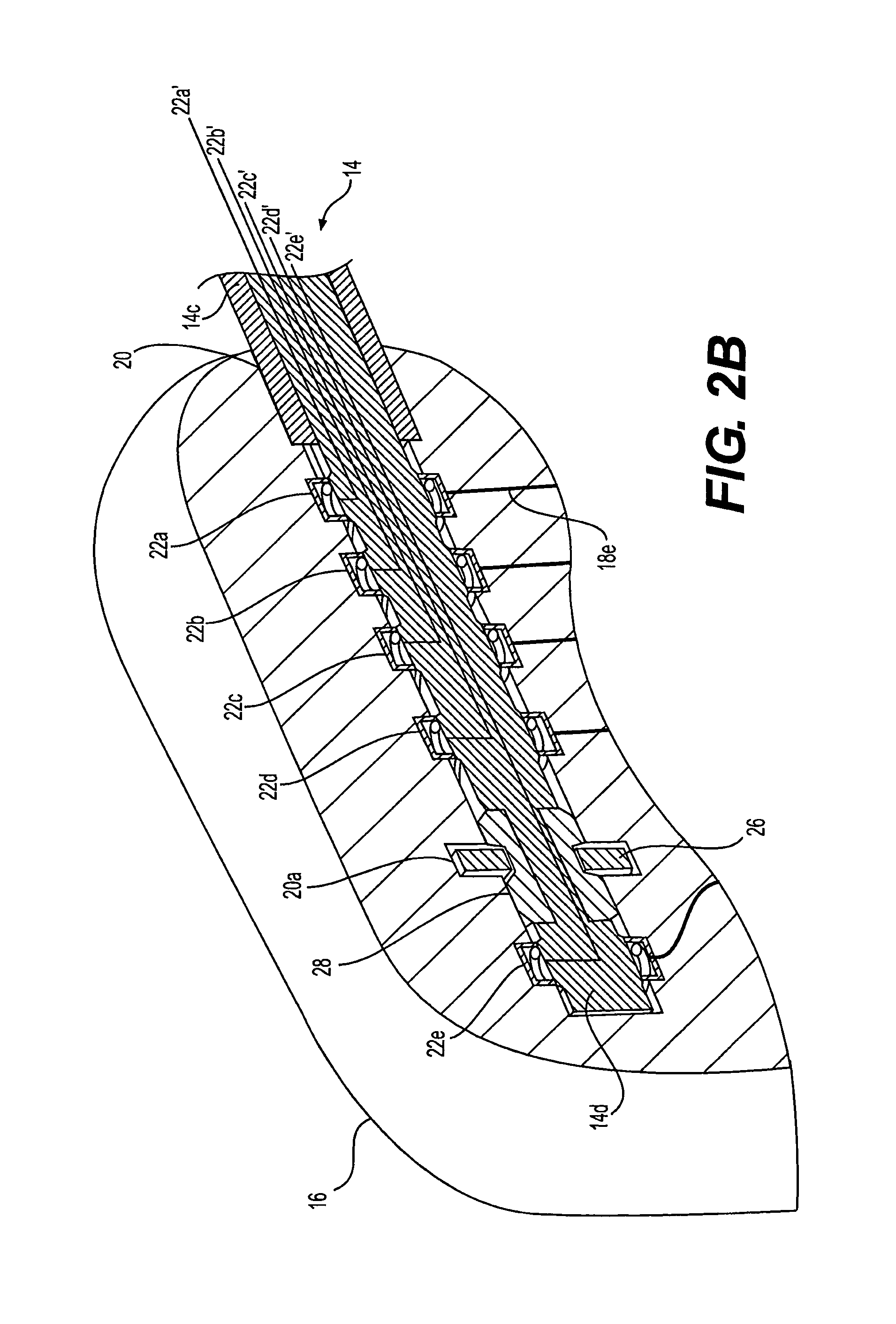 [0047]FIG. 2B is an illustration of another embodiment of the proximal end of a lead 14 disposed within a bore 20 of a header 16, shown in an isometric cross-section view that provides additional details regarding the interaction between the lead 14 and the interior of the bore 20. As illustrated, the header 16 supports the contacts 22a-22e that are dispose to provides an electrical connection between the wiring 18e and the exterior surfaces of the proximal end of lead 14. As can be appreciated, the proximal end of the lead 14 may include multiple surfaces configured to align with each the contacts 22a-22e so as to provide a collective or separate electrical connection between the contacts 22a-22e and one or more interface components (not shown) disposed at the distal end of the lead 14 (not shown). The electrical connection between the contacts 22a-22e and the proximal end of the lead 14 is shown schematically by electrical pathways 22a′-22e′, each of which corresponds to an electrical connection made with the contacts 22a-22e.