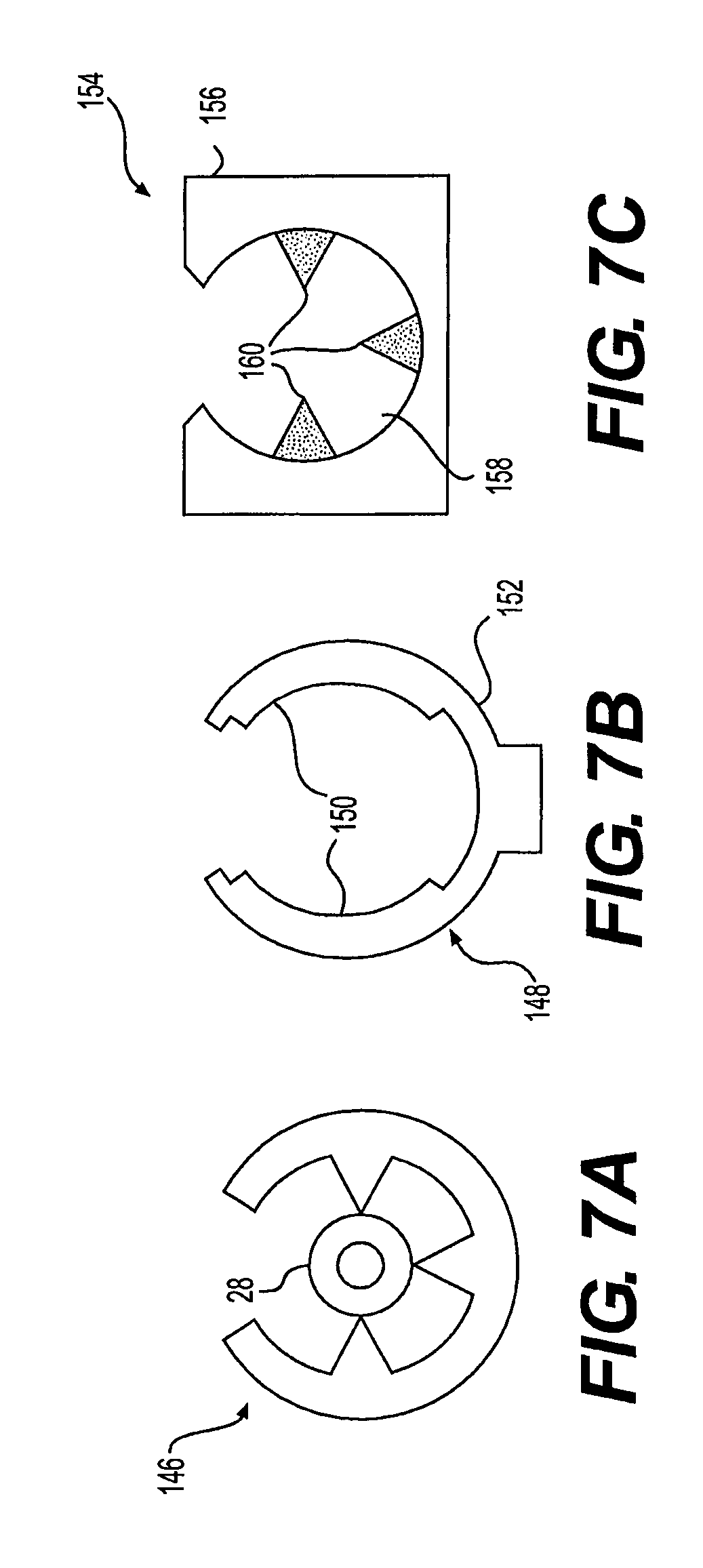 [0082]With reference to FIGS. 7A-7C, retainer device 26 may include one or more of the features described in connection with the exemplary embodiments illustrated in those figures. In one exemplary embodiment illustrated in FIG. 7A, a retainer device 146 may be similar to retainer device 112, except retainer device 146 may not include hub 122. In such an embodiment, retainer device 146 may be received in an annular recess or groove (not shown) surrounding bore 20 of header 16. Portions of axially-facing surfaces of retainer device 146 may engage portions of axially-facing surfaces of the annular recess or groove, which may limit or prevent movement of retainer device 146 relative to header 16 in a longitudinal direction of bore 20. However, retainer device 146 may have the ability to rotate within the annular recess, groove, or cavity 20a and/or about a central longitudinal axis of bore 20. Thus, retainer device 146 may secure engagement device 28 and lead 14 to header 16, while permitting lead 14 to rotate relative to header 16 and thereby prevent torsional stress from developing in lead 14 due to twisting of distal portions of lead 14. Retainer device 146 is shown in securing engagement with engagement device 28 in FIG. 7A.
