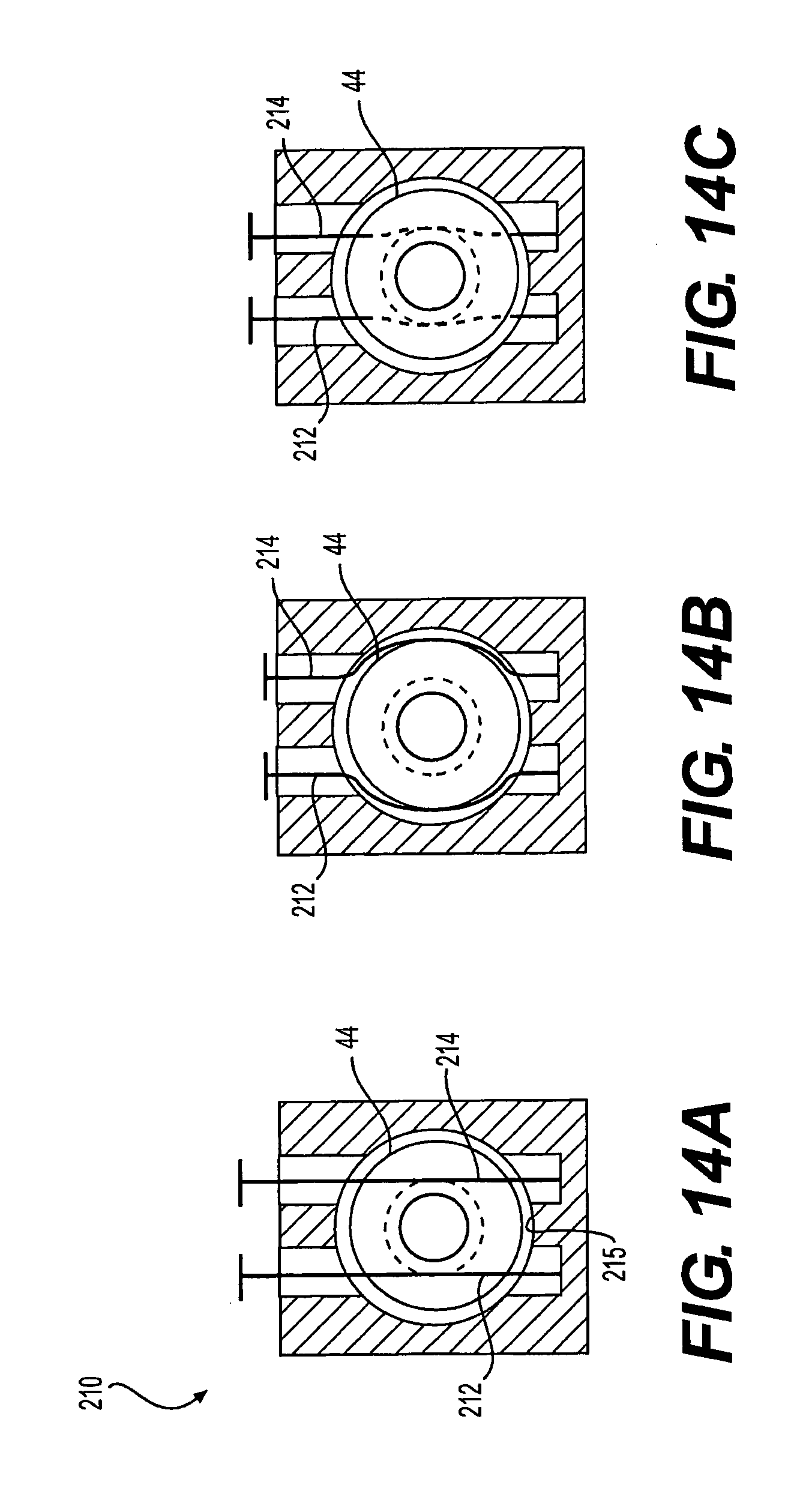 [0097]With reference to FIGS. 14A-14C, engagement device 44 and a retaining mechanism 210 are depicted at progressive stages of insertion of engagement device 44 into retaining mechanism 210. FIG. 14A depicts a front view of engagement device 44 prior to insertion, FIG. 14B depicts a front view of engagement device 44 during insertion, and FIG. 14C depicts a front view of engagement device 44 after having been secured with retaining mechanism 210. Retaining mechanism 210 may include a wire member 212 similar to wire member 172 (FIGS. 9A-9F). Like retaining mechanism 204, retaining mechanism 210 may also include at least one additional wire member 214, also similar to wire member 172. However, wire members 212 and 214 may be positioned at the same longitudinal position along a bore 215, along opposing sides of bore 215. In some embodiments, wire members 212 and 214 may be parallel. In other embodiments, wire members 212 and 214 may be angled relative to each other (i.e., non-parallel). Additionally or alternatively, more than two wire members 212 and 214 may be provided, each of the wire members being configured to contact a different portion of engagement device 44.