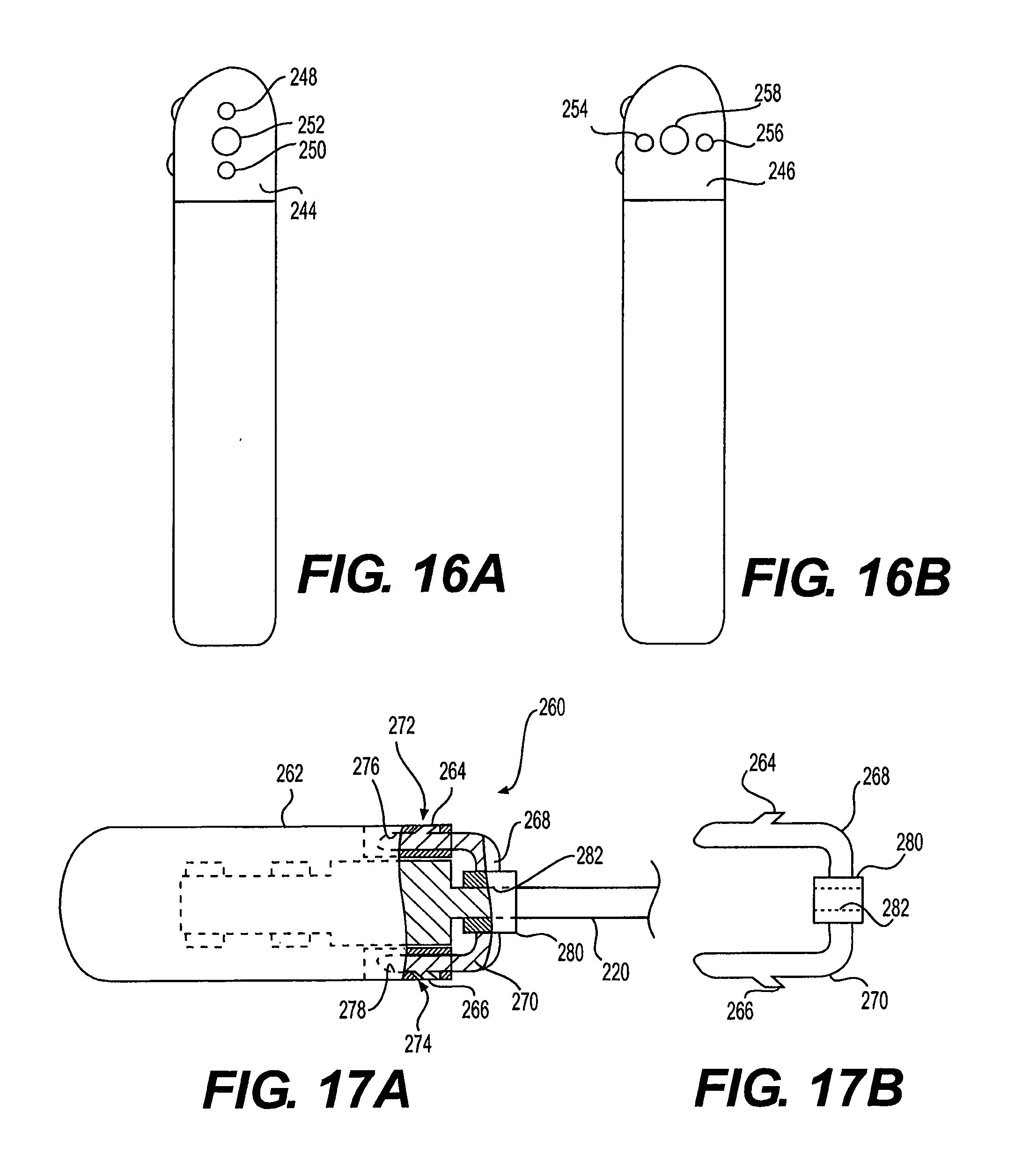 [0101]Still referring to FIG. 15, lead 220 may include an enlarged portion 242. Enlarged portion 242 may be useful for helping to secure lead 220 to header 218. For example, enlarged portion 242 may have a width greater than a width of bore 240 of ring 238. The distal end of enlarged portion 242 may abut the proximal end of ring 238, preventing extraction of enlarged portion 242 distally through ring 238. In one example, ring 238 may be flush with the outer surface of header 218 to keep lead 220 in place.