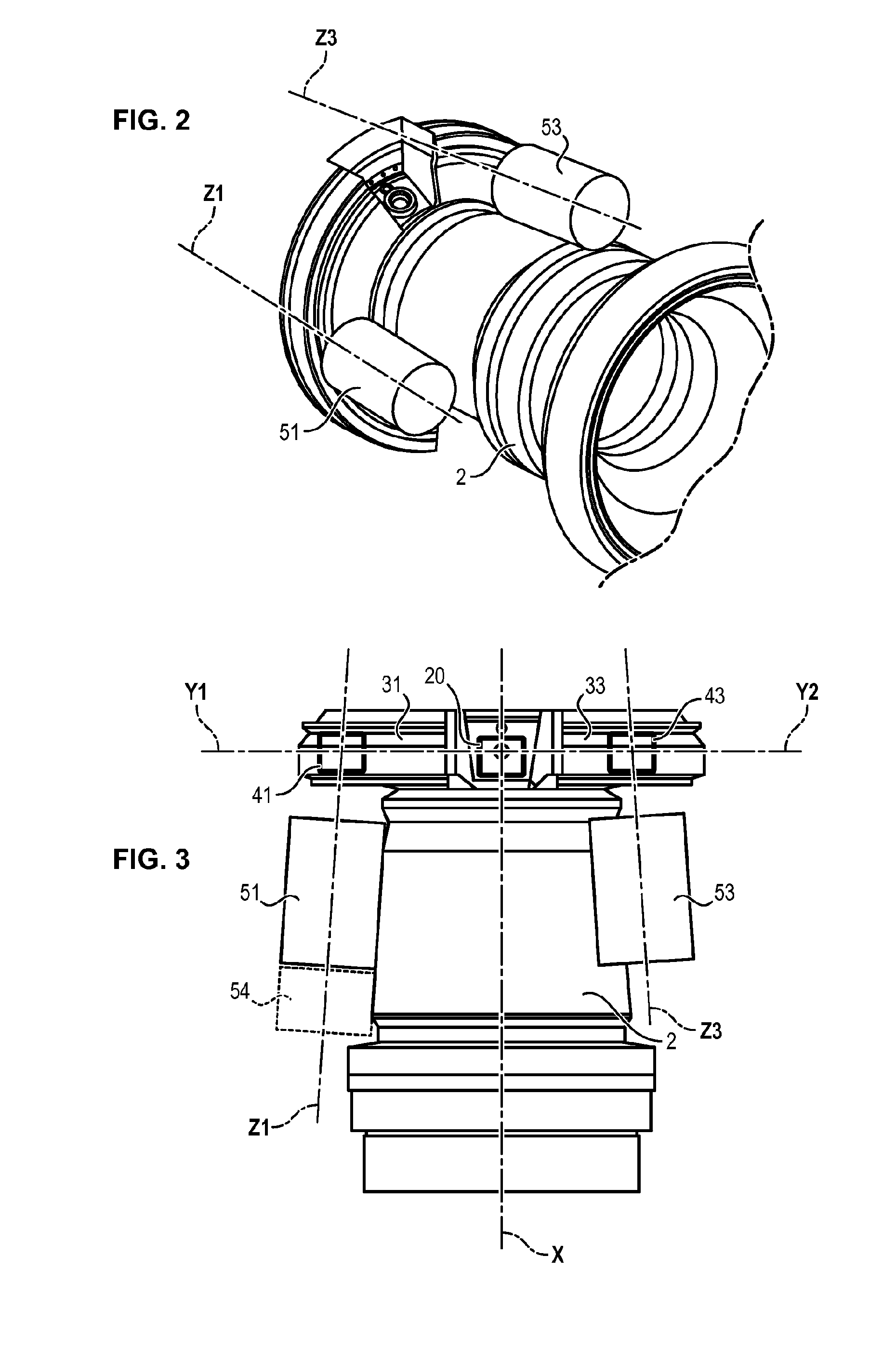 The turbine engine can comprise an engine casing in which are housed the turbine, the compressor and the compressor shaft, the accessory(ies) extending around the engine casing. Other features and advantages will be revealed in the description that follows, which is purely illustrative and not limiting and must be read with reference to the appended figures, among which: In The low-pressure spool 4 comprises a low-pressure compressor 7, a low-pressure turbine 8 and a low-pressure transmission shaft 9 connecting the low-pressure compressor 7 to the low-pressure turbine 8. The low-pressure transmission shaft 9 extends along a longitudinal axis X of the turbojet 1. The low-pressure turbine 8 is suitable for driving in rotation the low-pressure compressor 7 via the low-pressure transmission shaft 9. The entire low-pressure spool 4 is thus driven in rotation around the axis X with respect to the engine casing 2. The high-pressure spool 5 comprises a high-pressure compressor 10, a high-pressure turbine 11 and a high-pressure transmission shaft 12 connecting the high-pressure compressor 10 to the high-pressure turbine 11. The high-pressure transmission shaft 12 extends around the low pressure transmission shaft 9, concentrically with it (in other words, centered on the axis X). The high-pressure turbine 11 is suitable for driving in rotation the high-pressure compressor 10 via the high-pressure transmission shaft 12. The entire high-pressure spool 5 is thus driven in rotation around the axis X with respect to the casing 2. The turbine engine also comprises an inter-compressor casing 16 extending between the low-pressure compressor 7 and the high-pressure compressor 10. In operation, the low-pressure 4 and high-pressure 5 spools are driven in rotation with respect to the casing 2 independently of one another. Thus, the low-pressure transmission shaft 9 and the high-pressure transmission shaft 12 are driven in rotation independently of one another around the longitudinal axis X of the turbojet 1. When the turbojet 1 is operating, the air 13 is aspirated by the fan 3 and is divided into a primary airflow 14 and a secondary airflow 15, which circulate from upstream to downstream in the turbojet. The primary airflow 14 flows through the turbojet 1 from upstream to downstream, passing in succession through the low-pressure compressor 7, the high-pressure compressor 10, the combustion chamber 6 where it is mixed with fuel to be burned, the high-pressure turbine 11 and the low pressure turbine 8. The passage of the primary airflow 14 through the high-pressure turbine 11 and the low-pressure turbine 8 causes rotation of the turbines 11 and 8 which in their turn drive in rotation the high pressure compressor 10 and the low-pressure compressor 7, as well as the fan 3, via the transmission shaft 9 and the transmission shaft 12. Moreover, as illustrated in The inlet gearbox 20 comprises an input bevel gear 22 and several output bevel gears 23. The input bevel gear 22 is attached to the high pressure transmission shaft 12. Each output bevel gear 23 is attached to one end of a respective radial drive shaft 31 to 33. The input bevel gear 22 meshes with each output bevel gear 23, thus forming an angle drive. Each radial drive shaft 31 to 33 is housed inside a radial arm of the inter-compressor casing 16. Each radial drive shaft 31 to 33 is rotatably mounted around a respective axis of rotation Y1 to Y3 with respect to the inter-compressor casing 16. The axes of rotation Y1 to Y3 extend substantially perpendicularly to the axis X. Thanks to the cooperation of the bevel gears 22 and 23, rotation of the high-pressure spool 5 around the axis X causes rotation of each radial drive shaft, 31 to 33 about its axis of rotation Y1 to Y3 with respect to the inter-compressor casing 16. Each transfer gearbox 41 to 43 comprises an input bevel gear 45 and an output bevel gear 46. The bevel gears 45 and 46 can be housed inside the inter-compressor casing. The output bevel gear 46 meshes with the input bevel gear 45 forming an angle drive. The transfer gearboxes 41 to 43 transmit the rotation movement of the radial drive shafts 31 to 33 respectively to the auxiliary equipment 51 to 53. The auxiliary equipment 51 and 52 are for example accessories, while the auxiliary piece of equipment 53 is an accessory gearbox supporting other accessories. The accessories 51 and 52 can comprise for example a fuel pump, an electrical generator, a lubricant pump, a hydraulic pump, a starter, a constant speed drive (CSD) or a tachometer. Each accessory 51 and 52 comprises a stator attached to the inter compressor casing 16 and a rotor rotatably mounted with respect to the stator. In each transfer gearbox 41 and 42, the input bevel gear 45 is attached to one end of the radial drive shaft 31, respectively 32, by means of splines for example, and the output bevel gear 46 is attached to the rotor of the accessory 51, respectively 52, by means of splines for example, so that rotation of the radial drive shaft 31, 32 drives rotation of the rotor of the accessories 51, 52 with respect to the stator. In the transfer gearbox 43, the input bevel gear 45 is connected to one end of the radial drive shaft 33, and the output bevel gear 46 is attached to an input shaft of the accessory gearbox 53. The accessory gear box 53 comprises a box to which accessories can be attached and a gear train housed inside the box, the gear train transmitting the movement of the input shaft of the accessory gearbox 53 to different accessories supported by the accessory gearbox 53. The pieces of equipment 51 to 53 are distributed around the engine casing 2 on the periphery thereof, being angularly spaced away from one another. Moreover, the rotor of each accessory 51 and 52 has its axis of rotation Z1 and Z2 extending substantially parallel to an outer surface of the engine casing 2, in a substantially longitudinal direction of the turbine engine. Likewise, the input shaft of th