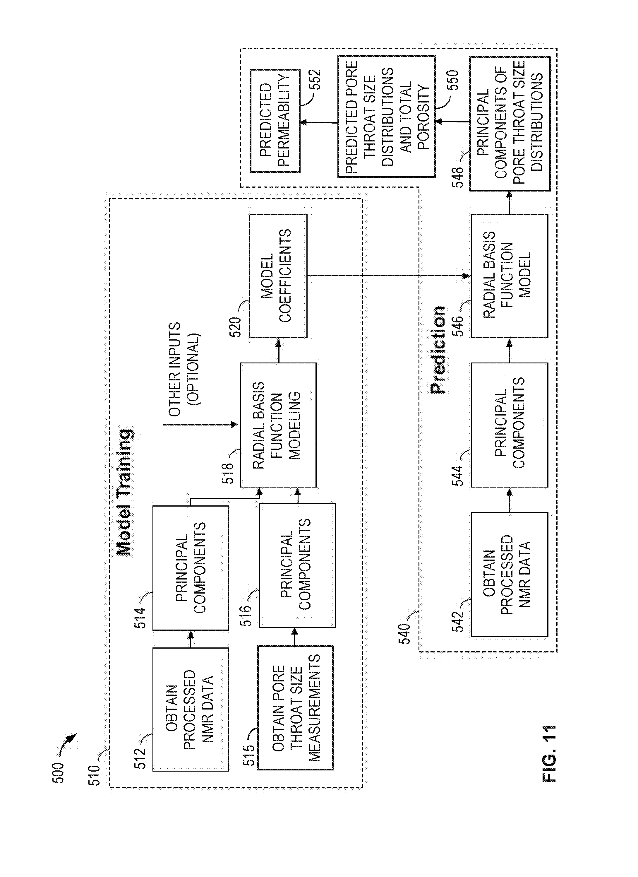 at least one processor; a memory in communication with the at least one processor and storing instructions that, when executed, cause the at least one processor to: obtain a nuclear magnetic resonance (NMR) relaxation-time distribution data set; train a radial basis function (RBF) model based on the NMR relaxation-time distribution data set and a measured pore throat size distribution data set; obtain a subsequent NMR relaxation-time distribution data set; employ the trained RBF model to predict a pore throat size distribution data set based at least in part on the subsequent NMR relaxation-time distribution data set; and store or display a predicted pore throat size distribution corresponding to the predicted pore throat size distribution data set, wherein the predicted pore throat size distribution is associated with a rock sample or subsurface formation volume. 13. The system of 14. The system of 15. The system of 16. The system of 17. The system of 18. The system of 19. The system of 20. The system of