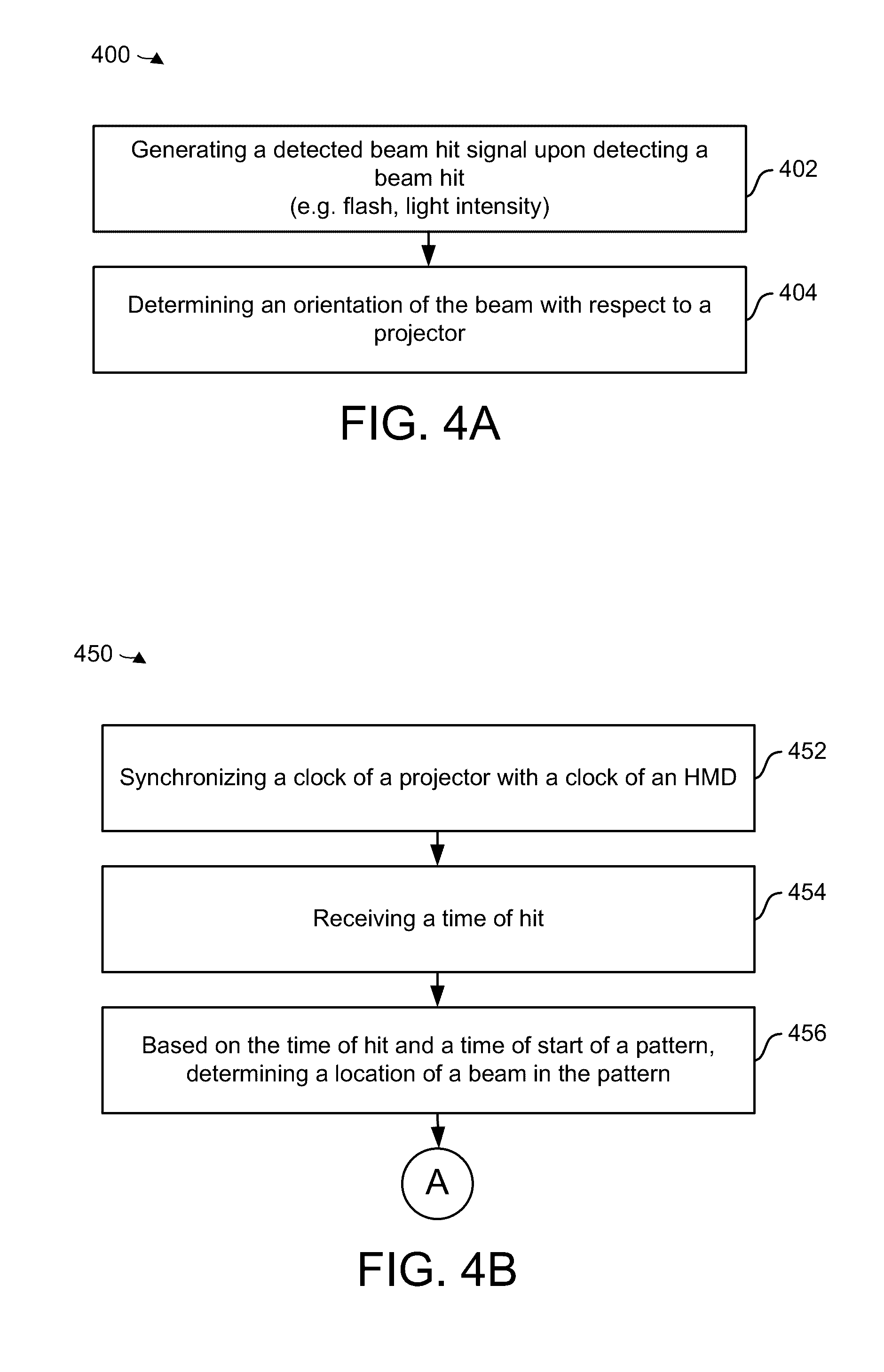 This application claims priority, under 35 U.S.C. §119(e), from U.S. Provisional Patent Application No. 62/202,766, filed on Aug. 7, 2015, and entitled “Systems And Methods For Using MEMS Projectors To Determine Position Of A Controller”, which is incorporated herein by reference in its entirety for all purposes. The present disclosure relates to systems and methods for using Micro-Electro-Mechanical Systems (MEMS) mirror to determine an orientation of a photosensor of a controller. The video gaming industry is gaining traction. With the advancement of time, more people are playing video games using gadgets, e.g., controllers, cell phones, head-mounted displays, etc. To play the video games, a position of a user is determined. It is within this context that embodiments described in the present disclosure arise. In one embodiment, a system including a Micro-Electro-Mechanical Systems (MEMS) mirror is used to trace a beam across a measurement space. Many patterns of beam steering are possible using the MEMS mirror. However, as an example, a Lissajous variant pattern is applied. The Lissajous variant pattern is to drive the MEMS mirror in a resonant mode of operation, e.g., move the MEMS mirror along a y axis of the MEMS mirror below a resonant frequency of the MEMS mirror and to move the MEMS mirror along an x axis of the MEMS mirror above the resonant frequency. Criteria for repetition of the Lissajous variant pattern are set. When the MEMS mirror is a rotating mirror, measurements, e.g., pulses of a detected beam hit signal, etc., are limited to a pre-determined frequency, e.g., 60 hertz, a range between 55 hertz and 65 hertz, etc., of the Lissajous variant pattern. By using the beam, an entire measurement space, e.g., volume, etc., is swept with one or two rotating MEMS mirrors at this rate. The beam moves more quickly than a line to scan the entire measurement space. By driving the MEMS mirror close to its resonant frequency, the beam is used and desired update rates are achieved for tracking the beam. The MEMS mirror moves in the resonant mode as long as frequencies of movement of the MEMS mirror along the x and y axes are within a few percentage of a resonant peak. A slight difference in the frequencies of movement of the MEMS mirror along the x and y axes in an order of, e.g., 1/180th, 1/200th, 1/170th, etc., generates the Lissajous variant pattern that fills the entire measurement space. By using the beam instead of the line, a synchronized timing of the system is used to determine an orientation of the beam. The system further includes a receiver, e.g., a head-mounted display, a hand-held controller, etc., which includes one or more photosensors and the system includes a projector having the MEMS mirror to determine the orientation of the beam. Clock signals of both the projector and the receiver are synchronized to determine the beam orientation. In an embodiment, multiple photosensors in a rigid topology or multiple projectors with a known baseline facilitates a method of triangulation or Perspective-n-Point to determine a three-dimensional (3D) pose of the photosensor(s) with respect to the projector(s). The Lissajous variant pattern is executed to facilitate a derivation of the orientation of the beam from a timing of the photosensor detected beam hit signal. With a configuration of a width of the beam and the frequencies, of the MEMS mirror, associated with the Lissajous pattern, the photo sensor detects intensity peaks of the beam several times per measurement period, e.g., a frequency of the Lissajous pattern repeat, etc. The timings of the intensity peaks allow for good overall averaging of the orientation of the beam. So even if there is noise in precision of the timings of the intensity peaks, by having a pre-determined number, e.g. 3 to 5, etc. of the intensity peaks per measurement period of the frequency of the Lissajous pattern, the noise is reduced to obtain the orientation of the beam. In one embodiment, the projector generates infra-red light or visible light as the beam. In an embodiment, multiple projectors are configured to perform time division multiplexing. For example, two projectors have alternate emission of beams so that one of the projectors does a sweep of the Lissajous variant pattern and then another one of the projectors performs a sweep of the Lissajous variant pattern. In one embodiment, the time division multiplexing is performed at a finer grain, e.g., a period of the resonance mode of operation, etc. In an embodiment, to achieve the synchronization, a global strobe illumination is used during each sweep of the Lissajous pattern or during fractions of the sweep. In one embodiment, to achieve the synchronization, wired communication or radio frequency (RF) communication is used. In one embodiment, a beam is modulated by embedding a repeating bit code into the beam. In this way, the photo sensor detects several bits of the repeating bit code to differentiate between multiple uniquely coded projectors. In an embodiment, a correlation to determine the repeating bit code is used to improve the time synchronization and consequently improve the measurement of the beam orientation when detected by the photosensor. As an alternative to time division multiplexing, frequency multiplexing is used. For example, two different light frequencies are used and then filters are placed on photosensors so that one of the photosensors detects one of the frequencies from a first one of the projectors but not a second one of the projectors and another one of the photosensors detects another one of the frequencies from the second projector but not the first projector. Both the first and second projectors are on simultaneously. The computing device 107 is coupled to the HMD 102 via a link 109. An example of a link, as used herein, includes a wired link, e.g., a cable, etc. Another example of a link includes a wireless link. For example, a wireless communication devic