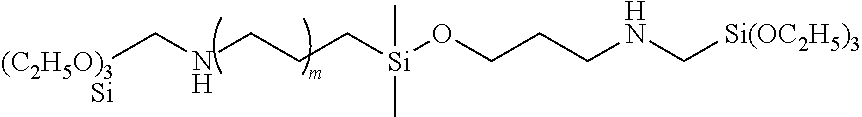 In some embodiments, which may be used in combination with any of the above aspects and embodiments, the α-aminomethylalkoxysilane groups may comprise pendant groups such as, for example, -L1-NH(—CH2—SiOR1iR23-i) groups, -L1-N(—CH2—SiOR1iR23-i)2groups, -L1-N+H(—CH2—SiOR1iR23-i)2groups, -L1-N+H2(—CH2—SiOR1iR23-i) groups, and/or -L1-N(—CH2—SiOR1iR23-i)3groups and/or in-chain groups such as, for example, -L1-N(—CH2—SiOR1iR23-i)-L2-groups, -L1-N+H(—CH2—SiOR1iR23-i)-L2- groups and/or -L1-N+(—CH2—SiOR1iR23-i)2-L2- groups, where R1, R2, R3and i are defined above and where L1and L2may be independently selected, for example, from a C1-C20-hydrocarbon, a polysiloxane, a poly(alkylene oxide), and a polysiloxane poly(alkylene oxide) copolymer among many other possibilities. In certain of these embodiments, R1=OCjH2j+1and R2=CkH2k+1, where j may range from 1 to 10, typically 1 or 2, and k may range from 1 to 10, typically, 1 or 2.