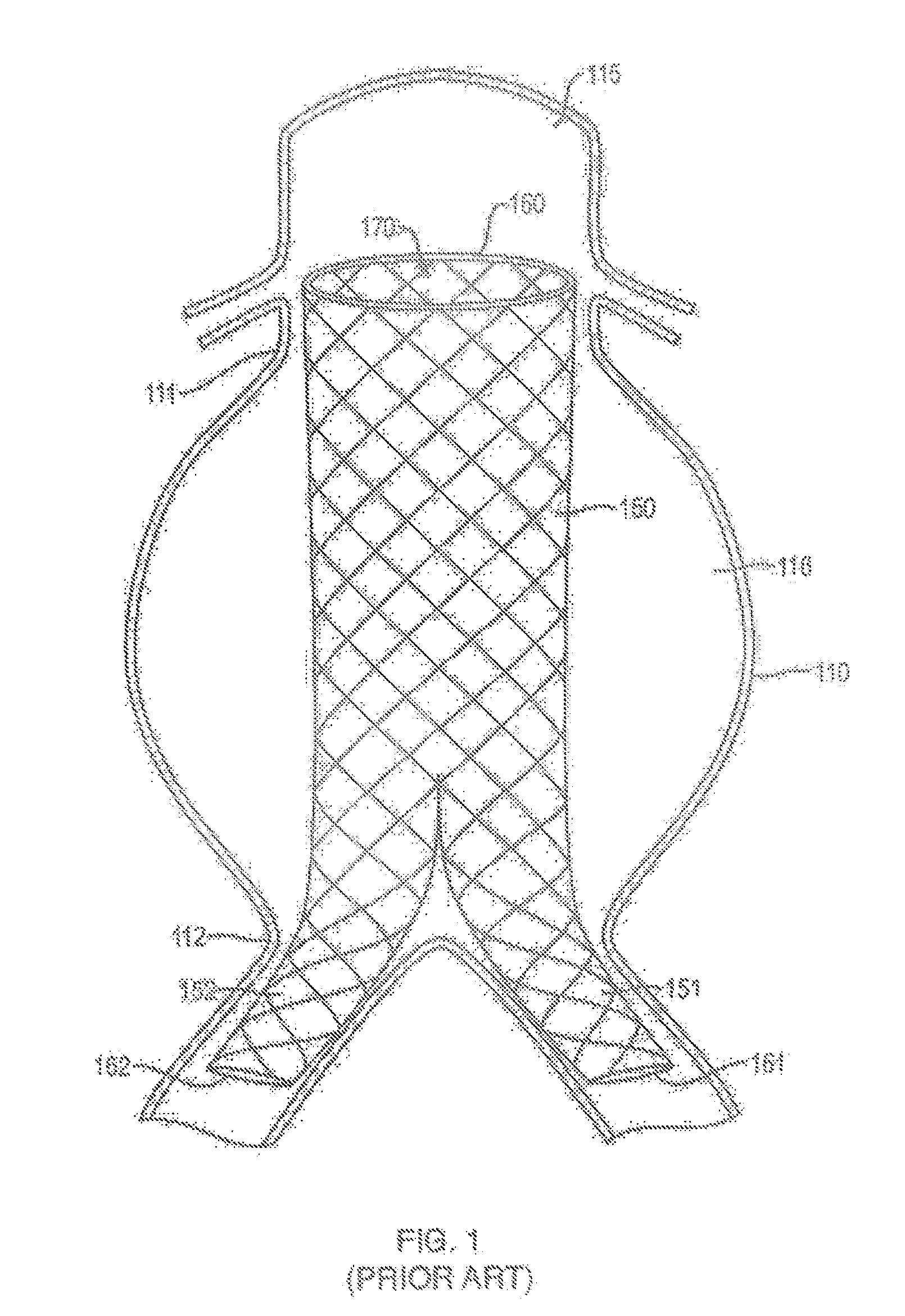 Regardless of whether a branched or unbranched stent-graft is used, the stent-graft will include a first end 160, second end 161 and/or 162, and a lumen 170 extending there between. The first end 160 of stent-graft 150 is secured to a first end 111 of aneurysm 110. As used herein, a graft or stent-graft is said to be “secured” to the end of an aneurysm if it is held into contact with surrounding tissue, such as by friction fit without the use of any securing means or alternatively with the use of such securing means such as sutures, adhesives, or other suitable securing means. The second end 161 and/or 162 of stent-graft 150 is secured to a second end 112 of aneurysm 110 to span the aneurysm and form a stable channel for blood flow within abdominal aorta 115.