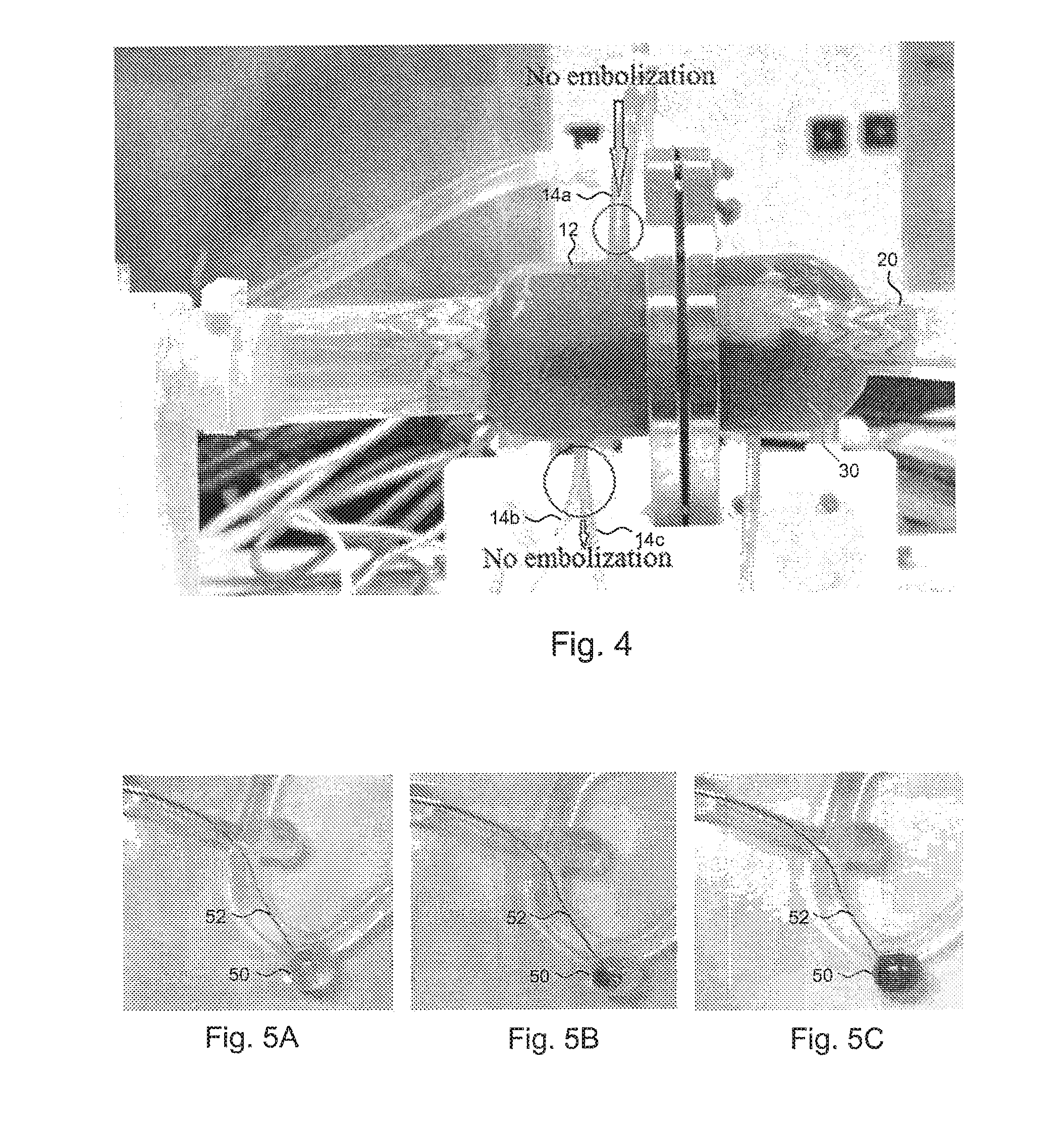 Referring now to FIGS. 5A-5C, a formulation comprising an α-aminomethylalkoxysilane functionalized polydimethylsiloxane prepolymer with tantalum suspended as a visualization agent was loaded into a syringe and deployed into the aneurysm 50 of the model using a 0.021″ microcatheter 52. FIG. 5A shows the system prior to injection in which the microcatheter 52 is placed in the unfilled aneurysm; FIG. 5B shows the system at a time when filling of the aneurysm is in progress; and FIG. 5C shows the system after the aneurysm has been filled. The formulation was easily deployed by hand to fill the aneurysm. The formulation filled 100% of the aneurysm space with a very small projection into the parent vessel. No breakaways or pieces of the formulation became dislodged during or after the deployment, with the final implant remaining as a single, intact material that made conformal contact with the aneurysm. This example demonstrates the usefulness of moisture curing α-aminomethylalkoxysilane functionalized prepolymer formulations as medical device to fill small aneurysms.