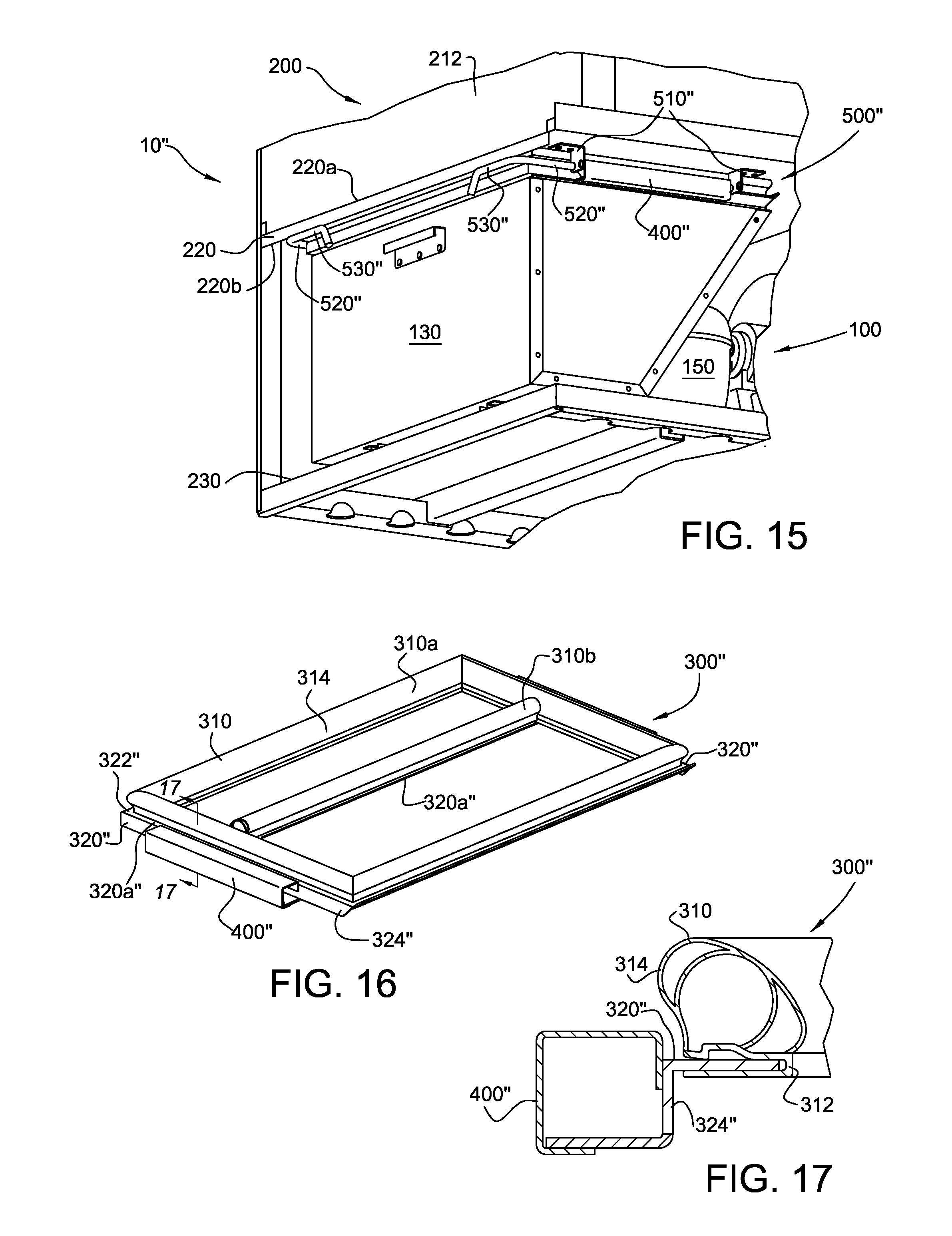 The construction of the gasket assembly 300″ is shown in greater detail in FIG. 16. As can be seen from FIG. 16, the gasket frame 320″ is similar to that of the first embodiment, with a rectangular perimeter having a horizontal portion 322″ extending outwardly of the lower perimeter of the upper gasket 310 on both sides and the front and back, and a vertical portion 324″ extending downwardly from the horizontal portion 322″ at both sides to define side flanges having an L-shaped cross-section. The upper gasket 310 is substantially identical to that of the first embodiment.