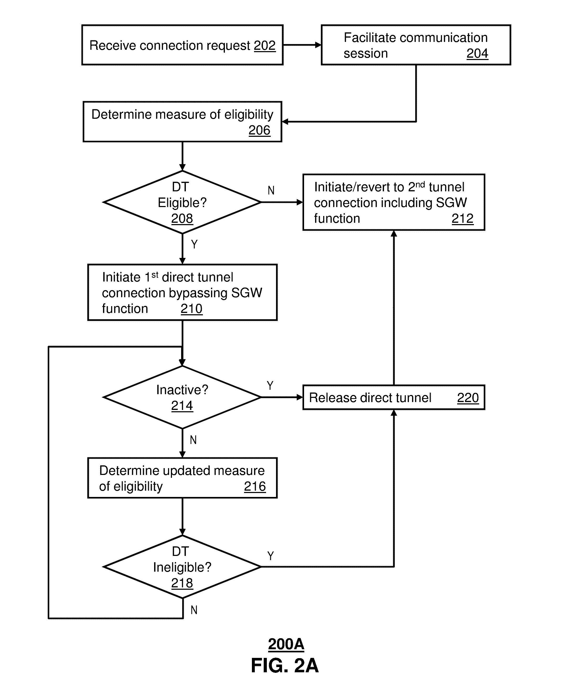 FIG. 4 depicts an illustrative embodiment of a first communication system 400 for delivering media content. The communication system 400 can represent an Internet Protocol Television (IPTV) media system. Communication system 400 can be overlaid or operably coupled with an LTE-EPS network, such as the example network depicted in FIG. 1, as another representative embodiment of communication system 400. In some embodiments, the LTE-EPS network 462, 460 facilitates a network connection between a wireless access node, e.g., eNB 462, and a packet data network, e.g., the ISP network 432 or the access network 418, in response to a request from a wireless device, e.g., UE 416, in communication with the wireless access node 462. Responsive to certain eligibility requirements being satisfied, a direct tunnel is established between the wireless access node and a packet gateway 430b in the EPS network 460. According to the direct tunnel, a serving gateway functions, e.g., implemented in a serving gateway 430a of the EPS network 460, typically used in connection with mobility is substantially bypassed.