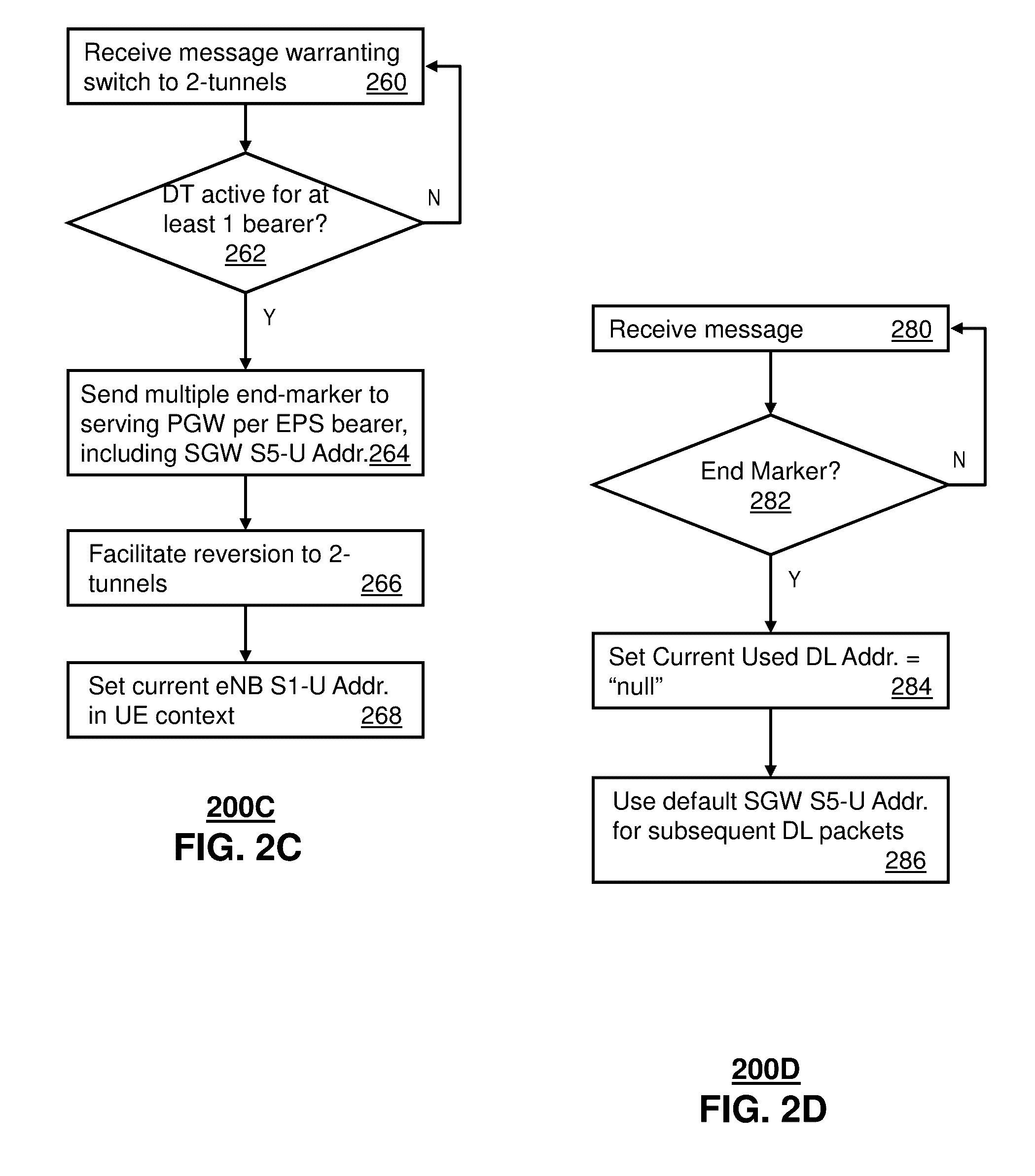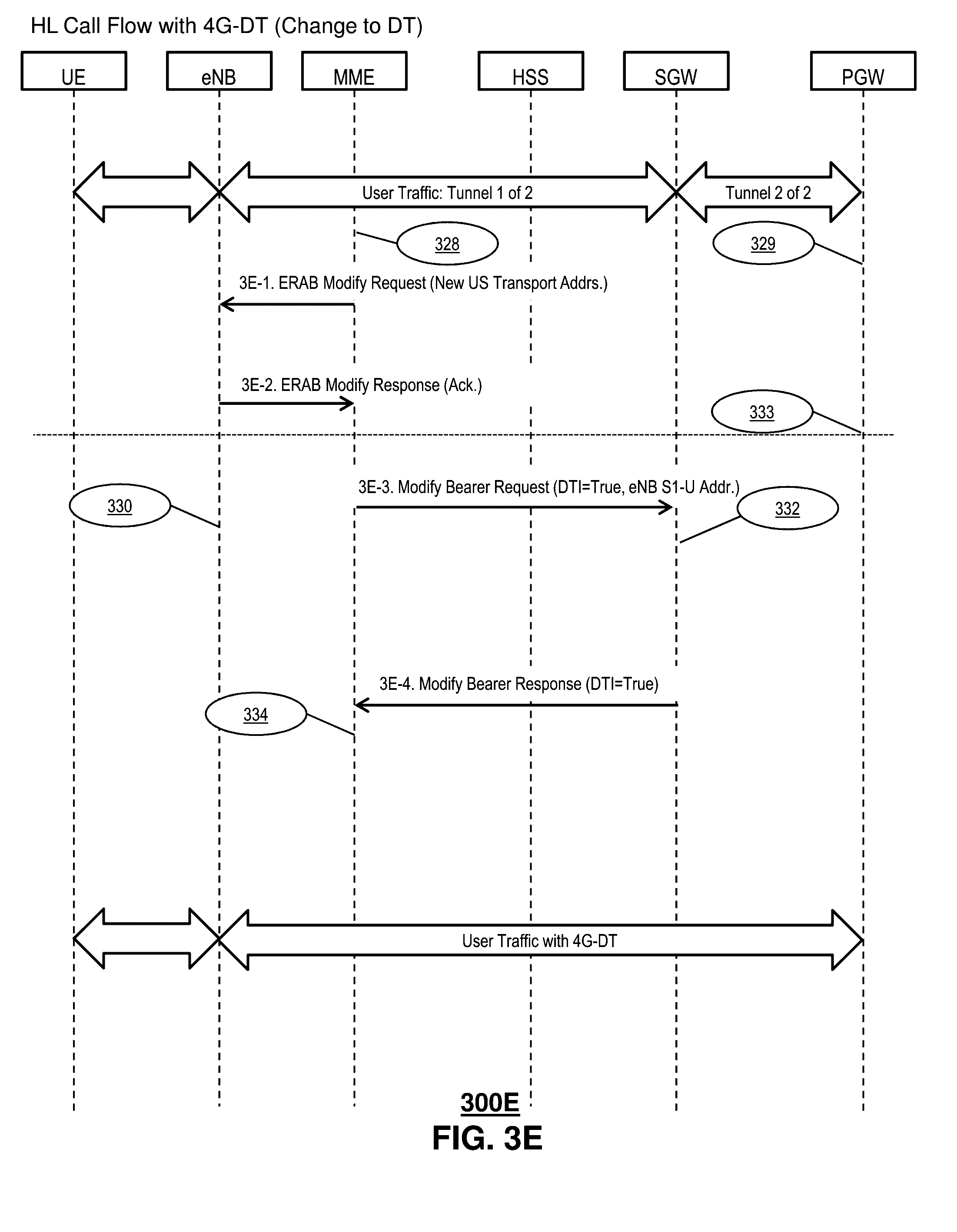High-level call flows can be identified for direct tunnel applications related to an inter RAT handoff into an LTE network. Due to complexity of the Inter-RAT handoff into the LTE network, the MME can establish an initial session with a two-tunnel solution. Once the IRAT handoff is completed and the MME has verified the subscription, the MME can trigger an active session to switch from a two-tunnel solution to a direct tunnel architecture. An example of such a procedure is shown in the high-level call flow of FIG. 3E.