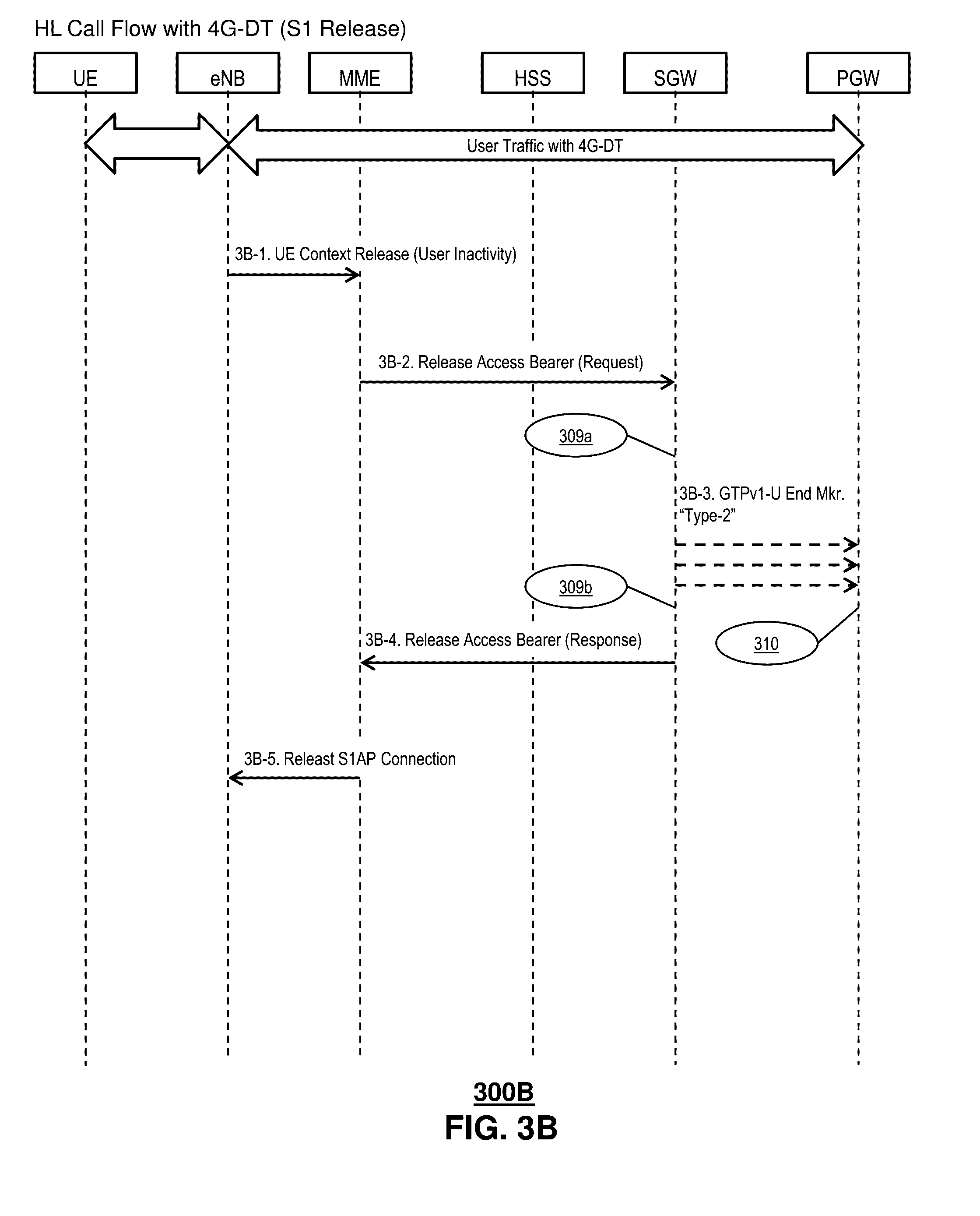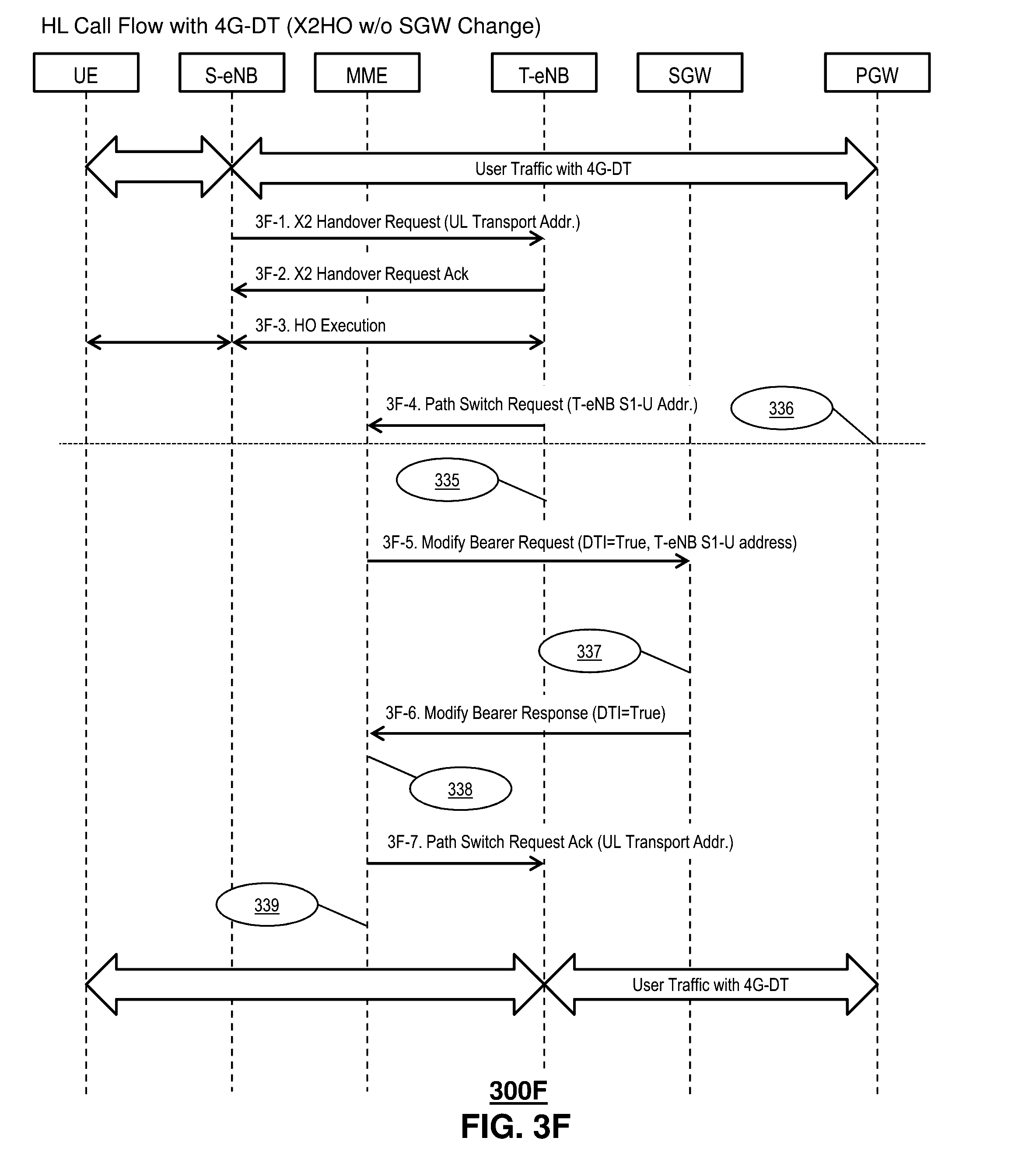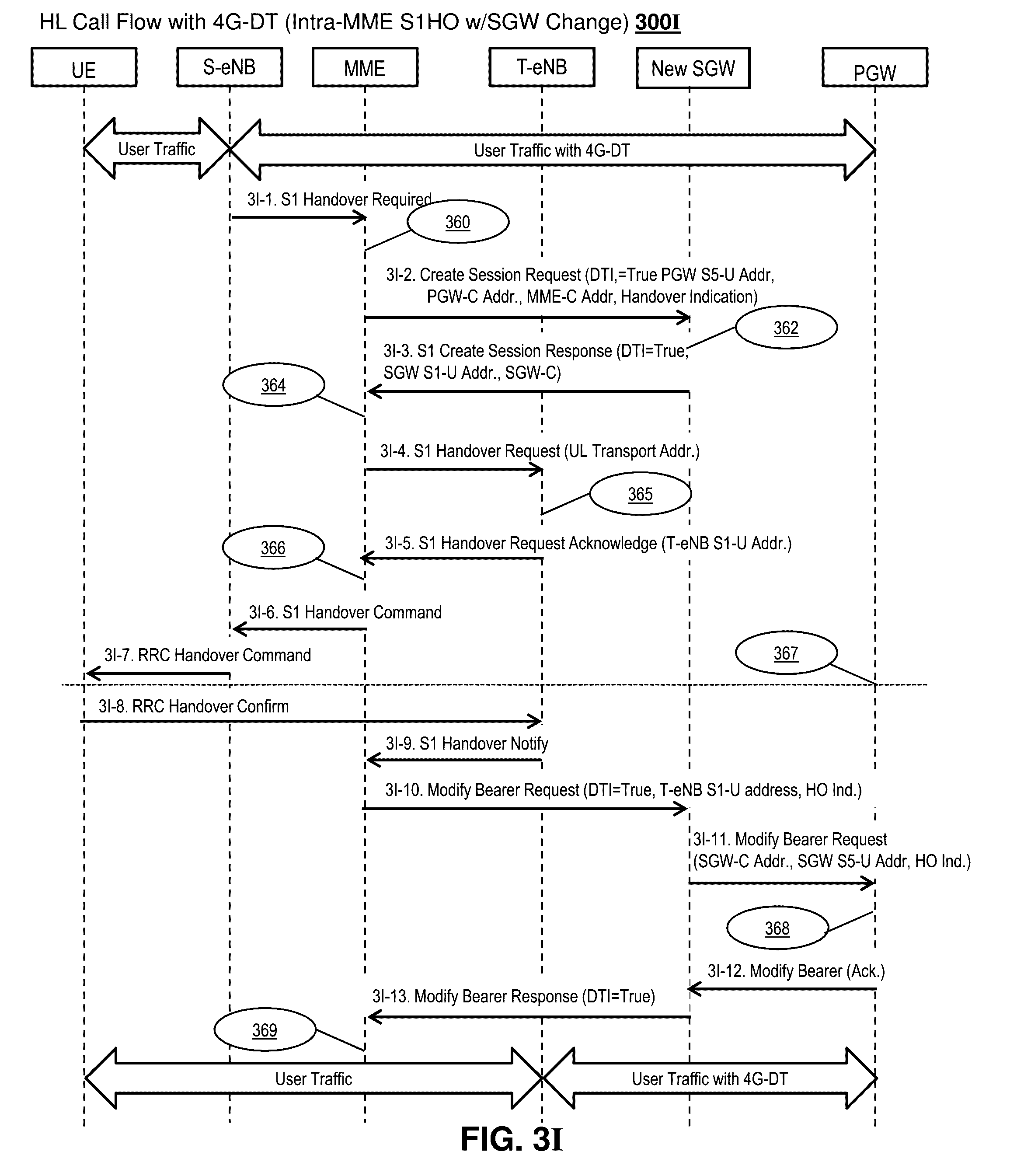 The new SGW sends a modify bearer request message to the PGW 120 at step 3K-13. The message includes the SGW-C address, the SGW S5-U addresses, and a handover indication. It is worth noting at 387 that the PGW recognizes that the SGW is relocated and saves the SGW S5-U address as the Default Downlink address. At step 3K-14, the PGW 120 sends a modify bearer response acknowledgement message to the new SGW. At step 3K-15, the new SGW sends a modify bearer response message to the T-MME with a direct tunnel indicator. At 389, the S-MME 112 cleans up the resources in the S-eNB 110a and in the former SGW for the former or old call leg. User traffic is processed between the T-eNB and the PGW 120 according to a direct tunnel.