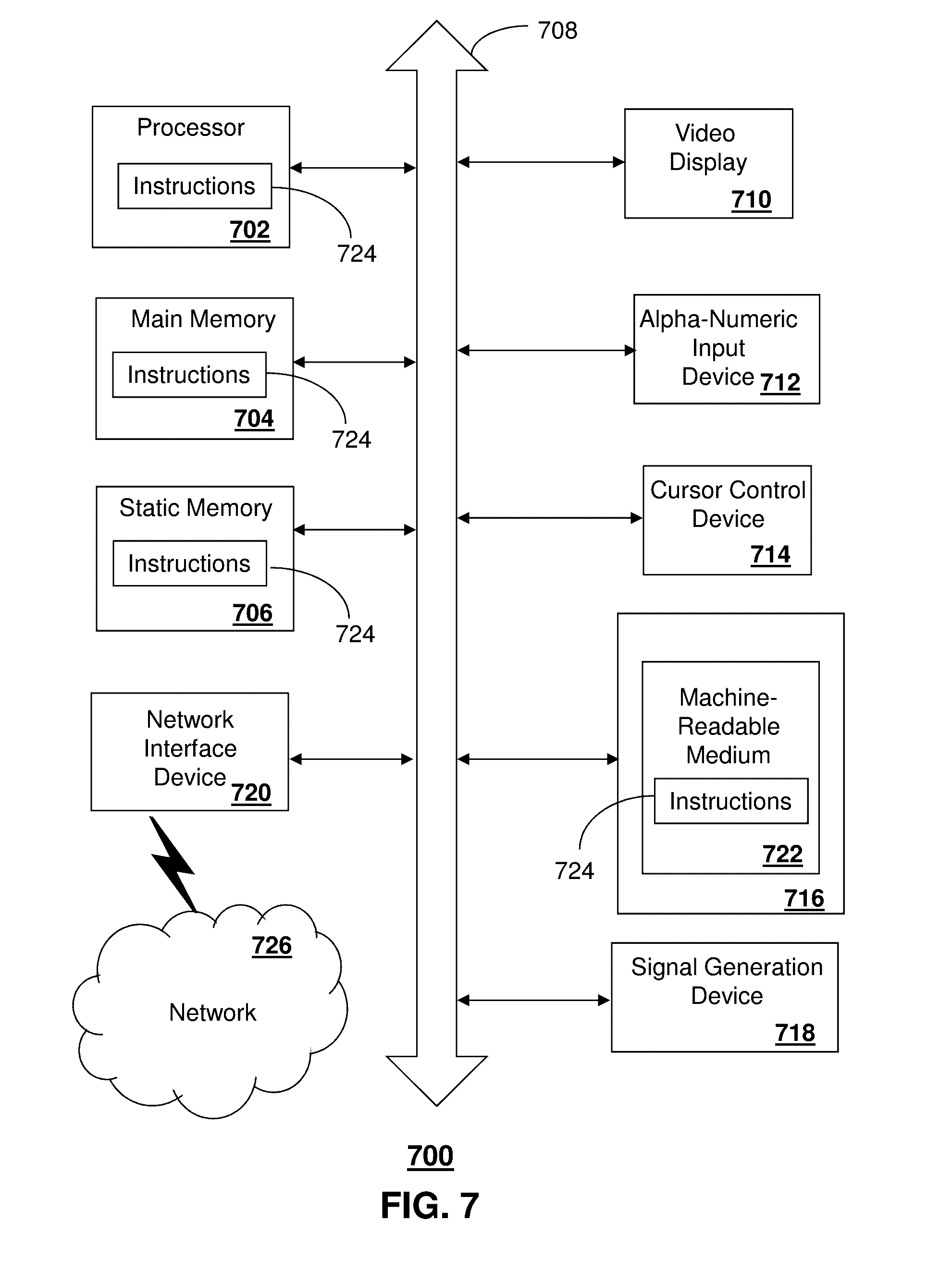The disk drive unit 716 may include a tangible computer-readable storage medium 722 on which is stored one or more sets of instructions (e.g., software 724) embodying any one or more of the methods or functions described herein, including those methods illustrated above. The instructions 724 may also reside, completely or at least partially, within the main memory 704, the static memory 706, and/or within the processor 702 during execution thereof by the computer system 700. The main memory 704 and the processor 702 also may constitute tangible computer-readable storage media.