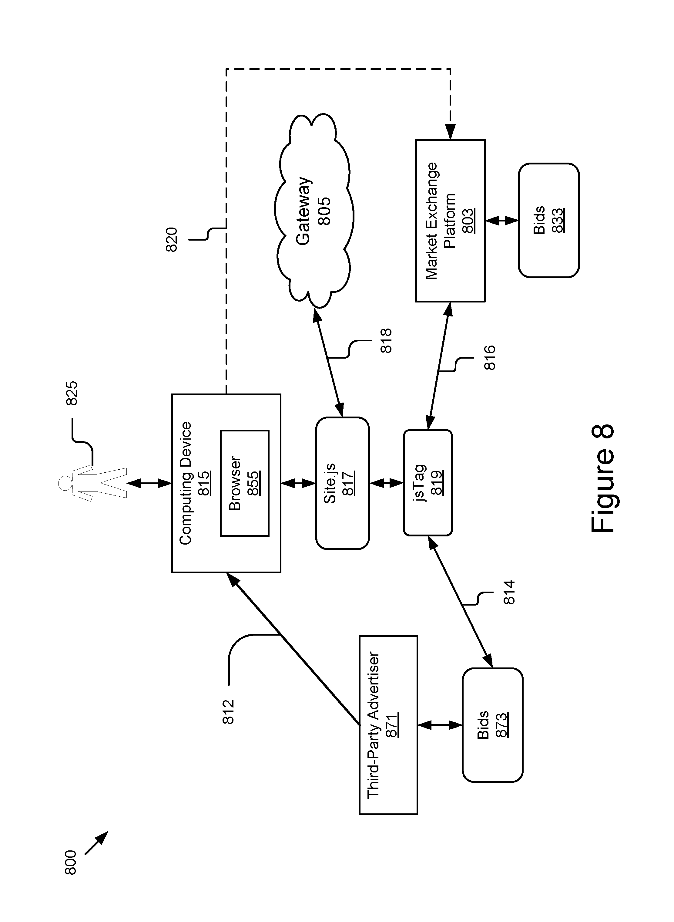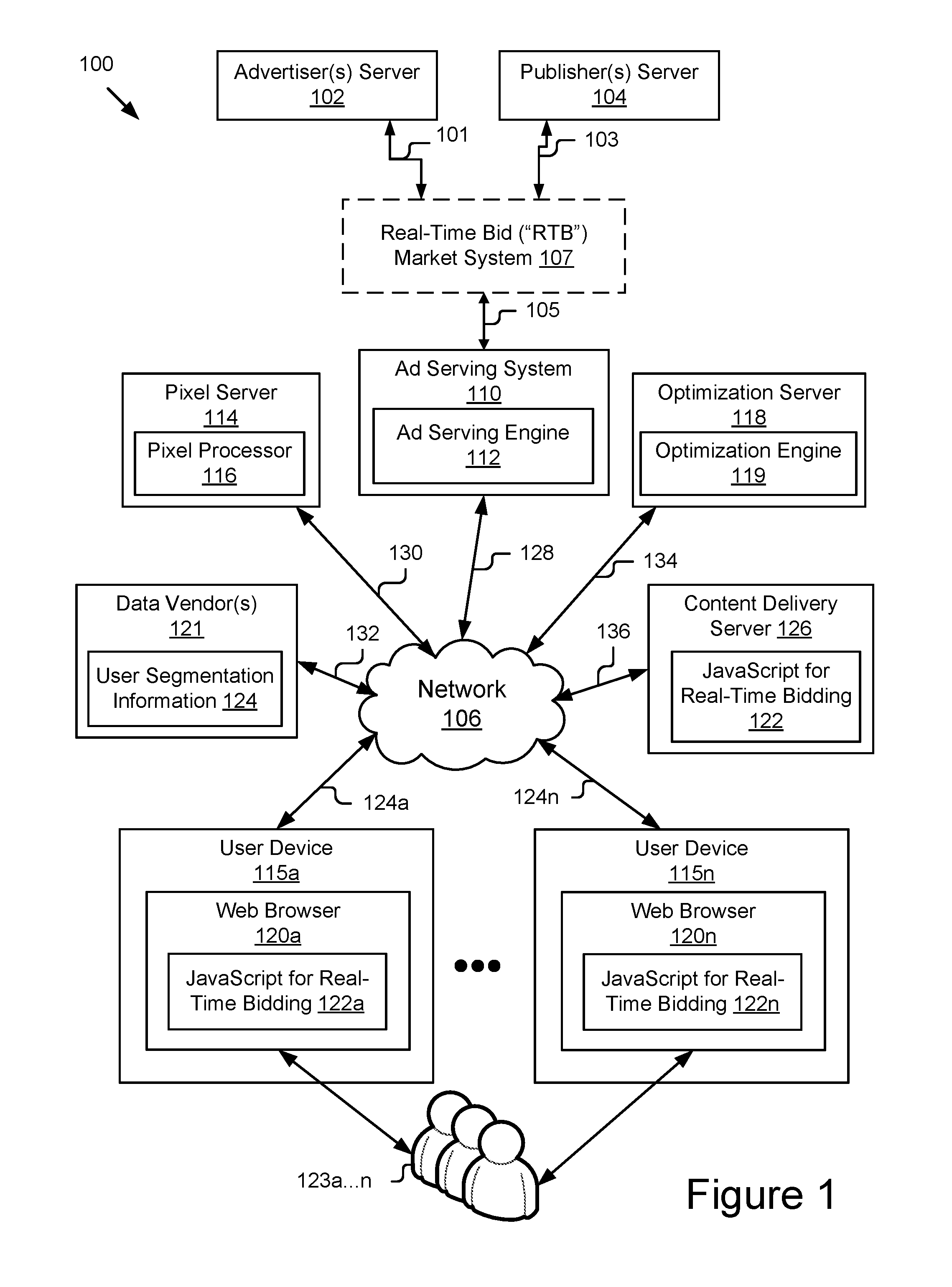 In some implementations, a new web worker or iframe may be created for each RTB URL. The web worker 214 asynchronously retrieves the bid and advertisement from the bidder and returns it to the main thread. In the event the browser does not support the web workers 214, the system is configured to use iframes to make each individual call. This is accomplished by programmatically creating an iframe for each RTB call and writing a script tag to the iframe. The information is retrieved by calling a javascript function in the main page from the iframe. In some implementations during the period in which bid requests are being made to bidders, the system makes requests to data providers (e.g., Data Vendor(s) 121) to return detailed segmentation data on the user (e.g. User Segmentation Information 124). This information is stored in a cookie so that in future requests for this user there is no need to make an additional call to the data provider. In some implementations, the main thread waits until it has received a response from each worker or iframe. After the main thread has either received a response or reached the max time, it determines the maximum bid response received. The maximum bid response value is measured against the value for the data segment and a decision is made whether to pass the bid to the adserver or not. The data segmentation information is retrieved and updated in JSON format. The system determines segment pricing using an algorithm that looks at mean prices by user segment. If the bid received is a set percentage below the average bids received for the user's segmentation than the bid is rejected. The data is gathered by writing a pixel along with the winning ad with bid & segment information. In some implementations, a set of campaigns are created in the Ad Server(s) 102 for each bidder associated to the key/value pairs. The system creates one or more keys for the maximum number of advertisements of a specific size for placement on a single page of the web site. By way of example, if a site has a maximum of five ads on one page then the system generates five unique keys. In some instances, only one key may be required. The system then traffics/creates campaigns in the Ad Server(s) 102 for each bidder and assigns them to each key. In the above example, the Ad Server(s) 102 key would be KEY1 and the value would be rtb113size_order_bid where rtb1 is the name of the real-time bidder, size is the size of the ad slot, and order is the numerical position of the ad on the page and bid represents the nominal value of the rtb1's returned bid. The numerical position is necessary because a page might contain more than one ad of the same size. In some implementations, for each campaign set-up in the system, the system traffics a “creative” (or a group of “creative”) that calls the associated URL stored in the web page. In the above example, the system sets the returned URL from the bid request in the web page as ad[rtb1_size_order]. In the associated “creative” (or group of “creative”) the system renders this to the page using javascript that renders the stored variable in the page. The system also appends another script to the “creative” (or a group of “creative”) that renders a pixel in the browser and makes a request to the system's servers. The winning bid and any information from data providers are sent as a pixel request to the system's server. The system utilizes this information to make intelligent decisions regarding the value of different user segments and for reporting purposes. The value of each user segment is the calculated mean of all the requests made to the server. The system then calculates a standard deviation of the requests and this value is used to determine the threshold minimum value for specific user requests. The present invention is described above with reference to exemplary embodiments. It will be apparent to those skilled in the art that various modifications may be made and other embodiments can be used without departing from the broader scope of the present invention. Therefore, these and other variations upon the exemplary embodiments are intended to be covered by the present invention. Referring now to Referring now to Referring now to Referring now to If the answer at block 613 is negative, the process 600 proceeds to the next block 614 including one or more operations for determining real-time advertisements for advertisement units. The process 600 continues to the next block 616 including one or more operations for sending real-time advertisements for rendering to bidders associated with the winning bid. From there, the process proceeds to the end. Referring now to Referring now to In some implementations, these large platforms may be configured with all non-guaranteed campaigns set to compete based on a price threshold. Publishers may use page implementation operations that include replacing tags or code placed by conventional third-party ad serving platforms on their webpages (on Site.js 817), with new tags or code 819, for example, referred to as a “LiftTag.” This permits any particular third-party platform utilizing the present technology to interrupt the ad request before sending it to other third-party ad serving platforms. For page implementation, publishers may replace their conventional page tags with a “LiftTag.” This is to divert a particular “ad request” before sending it to a conventional platform. The present technology uses key value targeting to pass the “Market bid” price from a particular third-party platform into another third-party platform. An appropriate number of key values should be used to target to make sure that all the information is properly forwarded. In some implementations, eight out of twenty may be used. In some instances, in the event publishers are migrated from conventional platforms, they have customized multi-part zones that may require customization in order to work pr