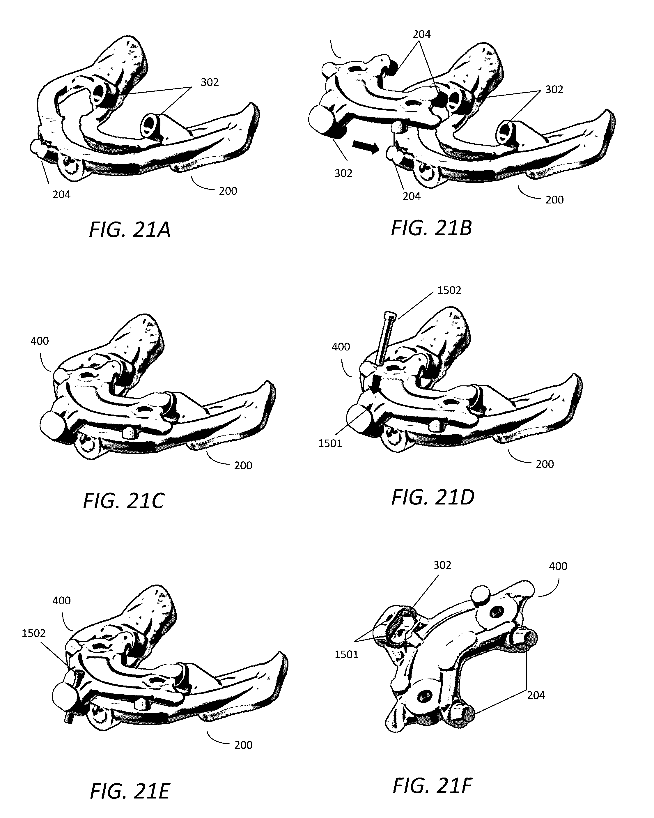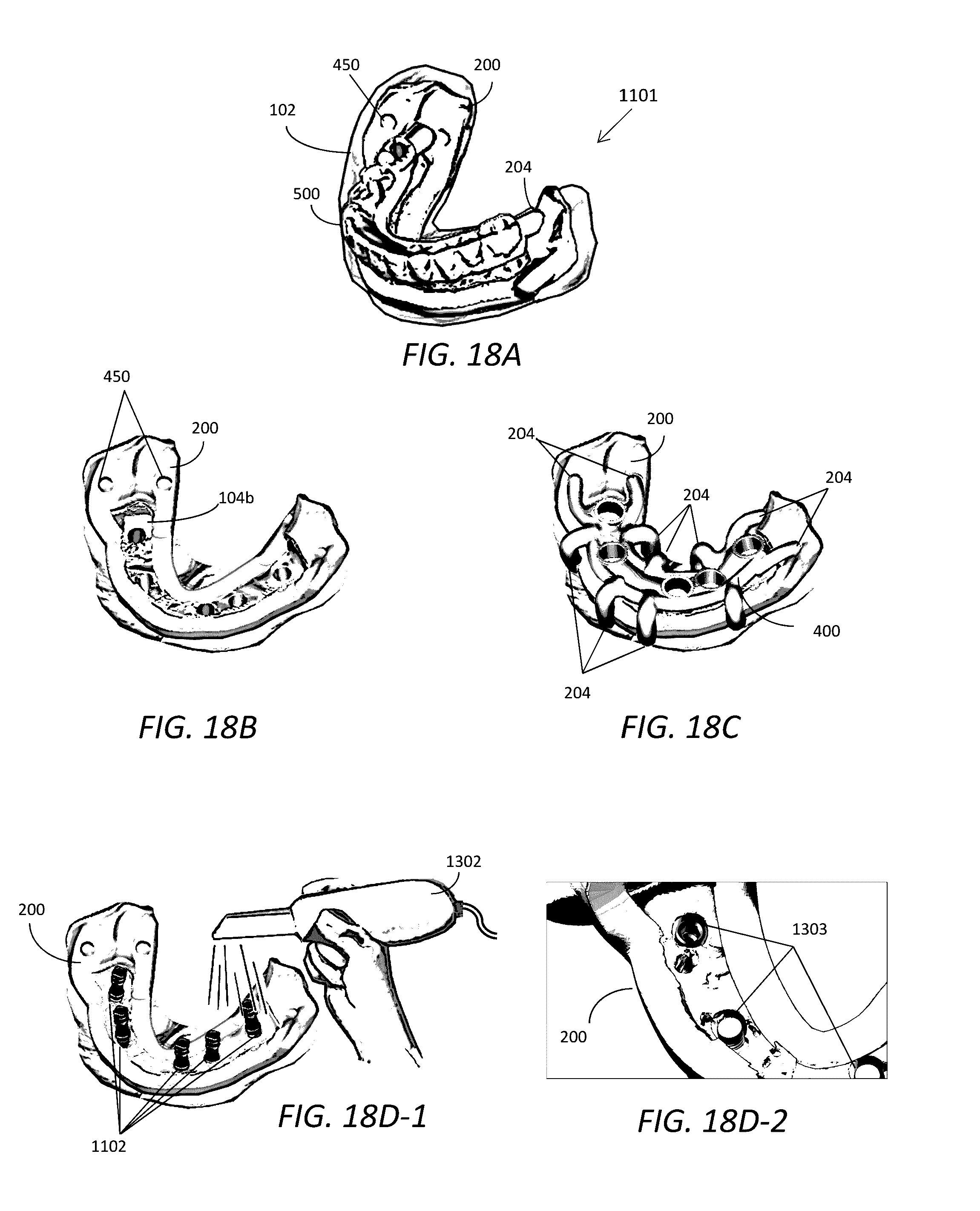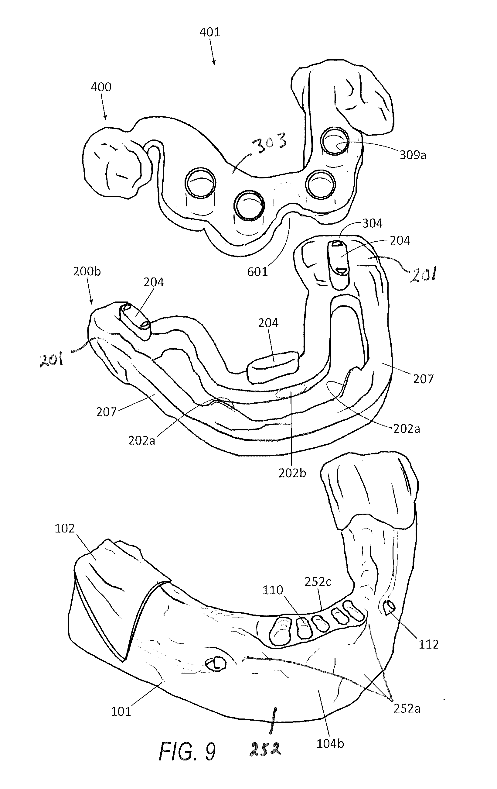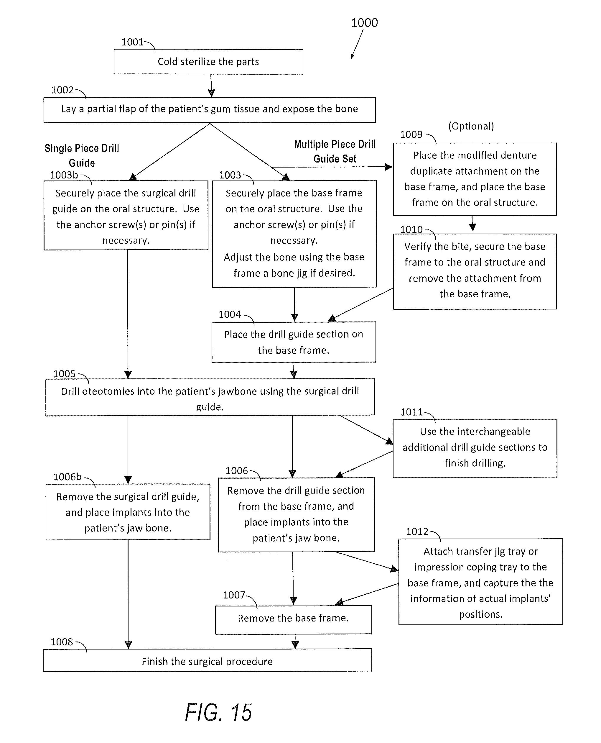 This application is a continuation in part application of U.S. patent application Ser. No. 15/359,167, filed on Nov. 22, 2016, which is a continuation application of U.S. patent application Ser. No. 13/621,146, filed on Sep. 15, 2012, which claims priority to U.S. Provisional Application No. 61/535,698, filed on Sep. 16, 2011. This application also claims priority to U.S. Provisional Patent Application No. 62/276,083, filed on Jan. 7, 2016. The contents of all of these applications is hereby incorporated by reference in their entirety. An improved dental implant method and apparatus is disclosed, and, more particularly, a surgical guide that can be fit to a patient's jawbone. Dental implants are commonly used in today's dental practices to support various prostheses. Challenges to the successful placement of dental implants include poor bone quality and various hidden anatomical features such as nerves, roots, and sinus cavities. Surgical preplanning methods and drill guide apparatuses may be used to better address these challenges. With edentulous cases, surgical drill guide apparatuses can be divided into two categories: bone borne surgical drill guides and gum tissue borne surgical guides. Bone borne surgical drill guides are made to fit on a patient's jawbone, and can be made from either a digital jawbone model or rapid-prototyped physical jawbone model of the patient. The primary problem with bone borne surgical guides is the invasiveness of the amount of flapping of the gum tissue that the surgeon has to create in order for the guide to fit correctly on the patient jawbone. The amount of flapping required increases the likelihood of surgical risks and complications, including blood loss, infection, healing problems, and overall pain experienced by the patient. Flapping and suturing also requires a great deal of surgical time. In addition to the problems associated with the surgical procedure, difficulties may also arise when the jawbone has low density, which happens often with Maxilla bones in posterior region. Low bone density makes it difficult to define the contour of the bone in CT images, which may cause the bone borne surgical drill guide to fit poorly. Thus, the use of bone borne surgical drill guides has drawbacks and it would be preferred to overcome their associated problems. Gum tissue borne surgical drill guides are made to fit on top of a patient's gum tissue without the need for any surgical incisions to stabilize the guide. In order to create this type of surgical guide, the surface scan data of the gum tissue and the tomography data of the jawbone need to be accurately aligned and mapped. For this purpose, usually an imaging template is worn by the patient during tomography scanning, and the fiducial markers on the device are used for alignment of the different data sets. While this method is less surgically invasive than the bone borne method, gum tissue borne surgical guides lack stability. Gum tissue is in a constant state of movement and drift, and is also pliable with pressure. Moreover, certain health conditions and even the intake of certain foods make gum tissue more prone to swelling. These conditions may prevent the accurate positioning of the device in the mouth. Here, even if the surgeon uses anchor screws, they may be securing the device in the wrong position. This type of surgical drill guide sacrifices accuracy for convenience. Thus, it would be preferred to overcome these problems. Accordingly, it would be desirable to provide a stable and accurate surgical drill guide apparatus that requires only minimum flapping and fits to both gum tissue and one or multiple small areas of jawbone. Such apparatus may increase the stability of the surgical guide by clasping and/or contacting the jawbone, while improving the overall fit and minimizing the need of flapping by also clasping and/or contacting selected areas of the gum tissue at the same time. The apparatus may be configured to accurately place dental implants according to the planned positions. It would also be preferable to provide an apparatus that may be custom designed to suit the unique anatomical features of each individual. The device may be designed on a digital anatomical jawbone model with accurately mapped and aligned gum tissue information, and may be rapid prototyped or milled as a drill guide frame or frame set. Also, the apparatus may be made by hand on the rapid prototyped or CNC milled physical anatomical model that partially exposes the jawbone structure. Currently, the most common way of taking a positional index of installed implants is by taking a dental impression. Right after the placement of implants or after the integration of implants, impression copings are placed on the installed implants and a dental impression is taken using an impression tray and one or more dental impression materials. For more accuracy with fully edentulous cases with multiple implants, it is recommended that the impression copings are splinted with some rigid materials before the impression is taken. Then a new master dental model is created from the impression in a traditional way, using implant analogs. Because of the stress applied on the impression copings and material distortion by the impression materials and impression tray, a verification jig should be made to verify the model and, if the gum tissue contour is altered, a new impression will be taken after it is healed. Alternatively, instead of a physical impression, the positions of installed implants may be recorded by surface scanning the patient's mouth with an intraoral scanner, and a new master dental model can be produced by rapid prototyping. However, with either method, if the contour of the gum tissue is altered by dentition extraction, bone adjustment, or bone grafting, preoperative information such as the bite registration, existing prosthesis, and natural dentition before extraction, can no longer be used in order to articulate th