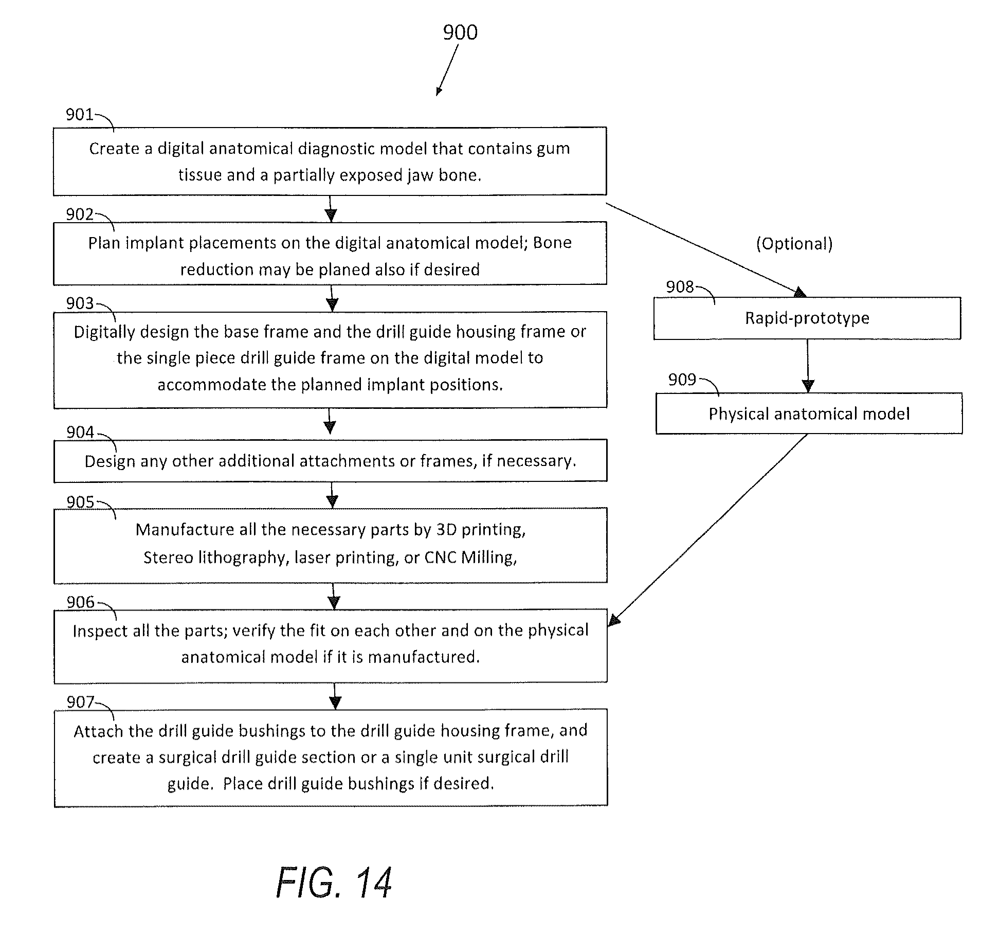 scanning as a preoperative scan at least one of a tomography of an oral structure of a patient, a topography of the oral structure, a dental impression of the oral structure, and a removable prosthesis of the patient as applied to the oral structure; storing digitally as preoperative scan coordinates in the form of a preoperative dental model the preoperative scan; designing digitally a guide appliance using the preoperative dental model, the guide appliance including a base frame and a superstructure including a transfer appliance indexed to the base frame, and comprising at least one opening view of a surgical site on the oral structure; storing the design coordinates of the guide appliance as part of the preoperative dental model; manufacturing the guide appliance using the design coordinates; applying the guide appliance to the oral structure; installing at least one implant at the surgical site;