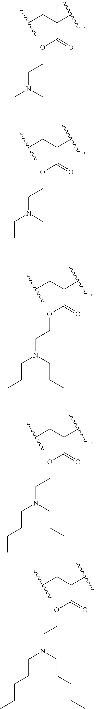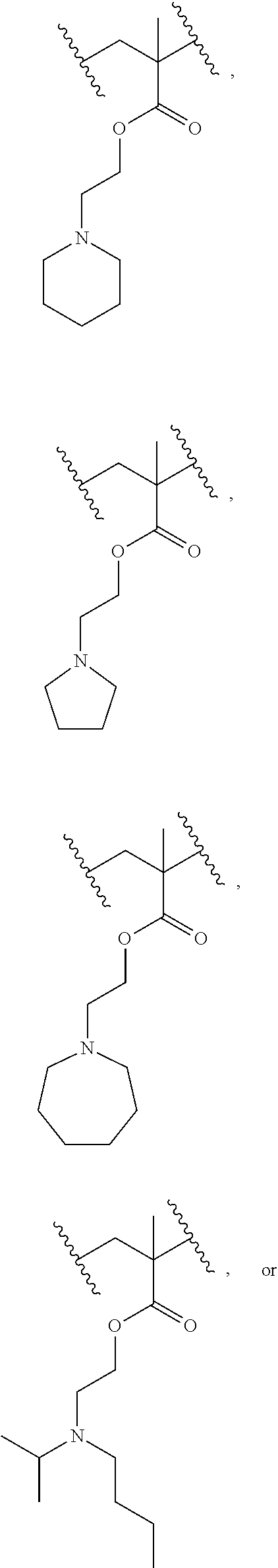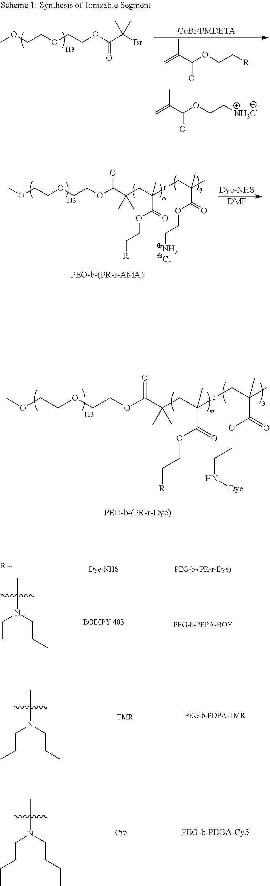 The PEG-b-PR copolymers were encoded with different fluorophores. Three exemplary PEPA-BDY493, PDPA-TMR, and PDBA-Cy5 fluorescent polymers were selected and characterized in terms of dye conjugation number and efficiency as well as quantum yield (Measurement of conjugation efficiency and quantum yields of dye-conjugated copolymers. Dye conjugation Quantum yield (ΦF)a Efficiency Free Conjugated PR-Dye Number (%) dyeb dye Mixtured PEPA-BDY493 2.2 73 0.90 0.05/0.68c 0.87 PDPA-TMR 2.1 70 0.68 0.26 0.65 PDBA-Cy5 2.2 73 0.28 0.24 0.27 aIn methanol unless noted otherwise. bObtained from literature. cIn methanol with 0.5% 1M HCl. dMixture of free dye with dye-free PDPA copolymer. Characterization of PEG-b-(PR-r-Dye) nanoprobes. Particle size RF Copolymer (nm) pHt ΔpH10-90% (Fon/Foff)a PEPA-BDY493 24.65 ± 1.55 6.95 0.22 30 PDPA-TMR 30.15 ± 2.15 6.20 0.18 91 PDBA-Cy5 35.49 ± 2.92 5.26 0.20 107 aDetermined by fluorescence emission intensity of different dyes. Cell lines and their gene mutation background Cell line KRAS status P53 status HCC44 Mutate (M) M H2009 M M H460 M Wild Type (WT) A549 M WT H2882 WT M H1993 WT M H1819 WT WT Example 15: Syntheses of Triblock Copolymer PEO-b-P(R1-b-R2)