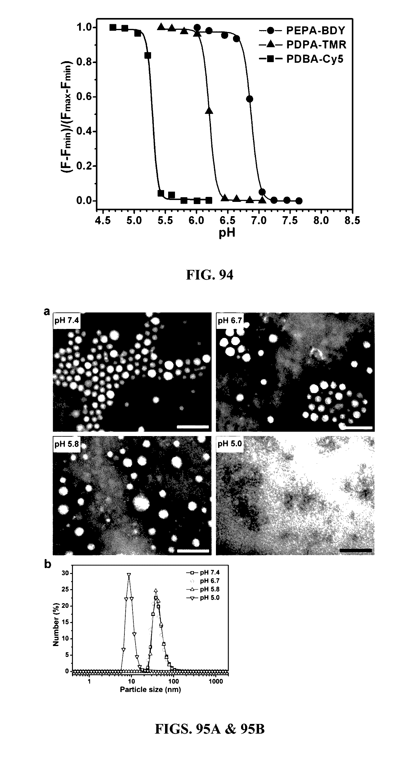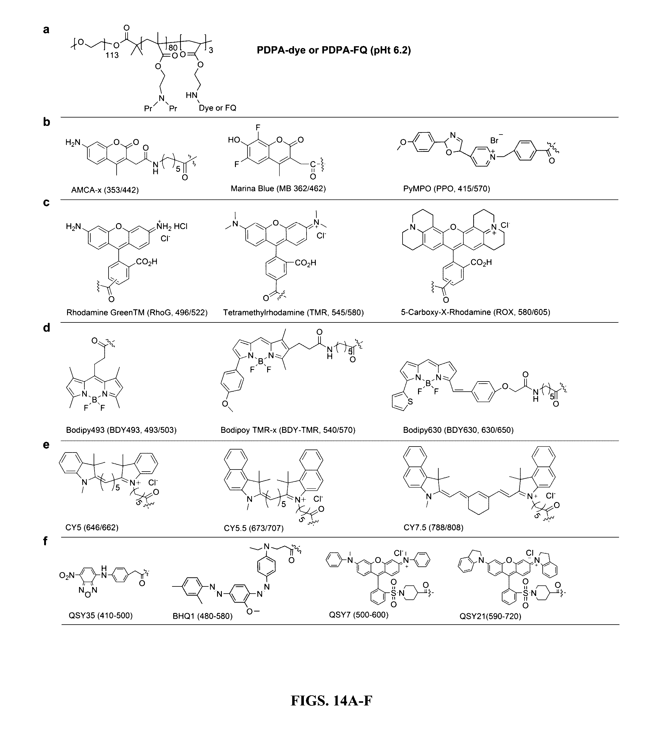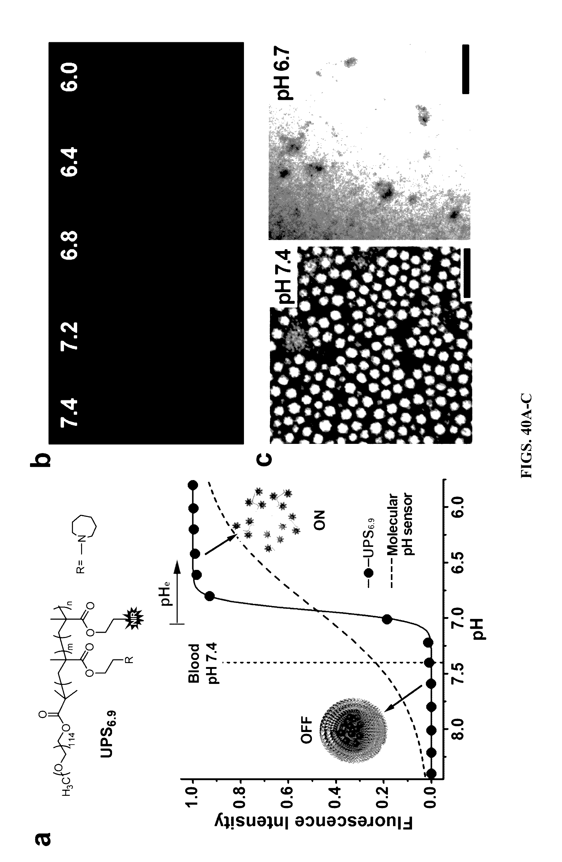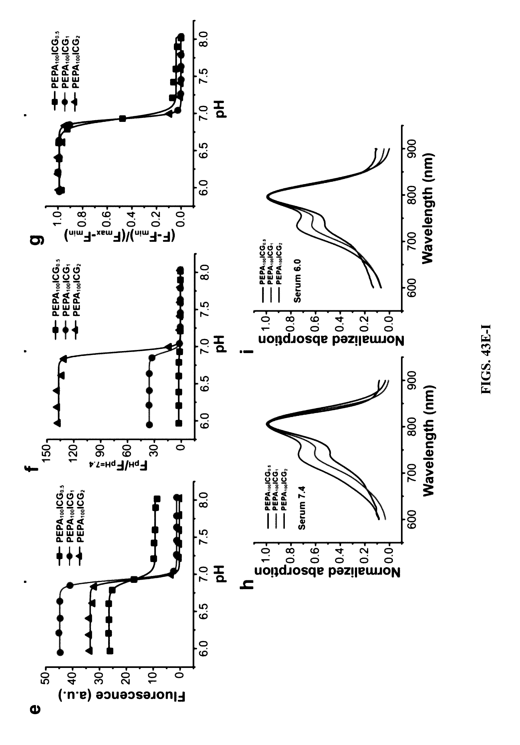 Mixed Alkyl Monomer Co-polymers Characteristics. Mn Mw Yield Polymers (kDa) (Da) PDI (%) pHta ΔpH10-90% P(DEA22- 20.7 26.4 1.28 86 7.10 0.15 EPA78) P(DEA11- 21.1 27.1 1.28 88 7.01 0.16 EPA89) PEPA100 21.2 26.6 1.25 87 6.92 0.15 P(DPA10- 20.5 24.8 1.21 83 6.82 0.14 EPA90) P(DPA21- 20.9 25.9 1.24 82 6.72 0.16 EPA79) apHtwas determined by the titration curve of Probe-ICG Characterization of PEPAx-ICG1copolymers with different repeating units of PEPA segment but the same ICG content and the resulting nanoprobe properties. Mn Repeat Particle size copolymer (kDa)a unitb (nm) pHt ΔpH10-90% FIHS6.0c PEPA40- 13.5 43 21.9 ± 1.7 6.96 0.30 32.3 ICG1 PEPA60- 16.8 62 24.8 ± 0.9 6.94 0.25 37.0 ICG1 PEPA80- 19.7 79 25.3 ± 0.8 6.92 0.18 45.3 ICG1 PEPA100- 25.1 102 26.0 ± 1.1 6.92 0.15 49.3 ICG1 PEPA120- 29.1 119 27.6 ± 1.0 6.91 0.13 51.6 ICG1 aNumber-averaged molecular weights (Mn) were determined by GPC using THF as the eluent; bRepeating unit was calculated based on integrations of —CH2—O— groups on PDPA to the methylene groups on PEG using1H NMR; cDetermined as ICG fluorescence emission intensity in 50% human serum. Log-rank p-values for pairwise treatment comparisons among different groups in survival surgery. Debulking White light TAGS Head and Control 0.347 <0.0001 <0.0001 neck surgery Debulking — <0.0001 <0.0001 White light — — <0.0001 Breast Control — 0.0501 <0.0001 surgery White light — — 0.0116 Tolerability and survival of C57BL/6 mice following bolus injection of PINS. 7 Days Morbidity reaction type and degreea mortality: Lack of Lack of Dose n death/total n Reduced mobility appetite (mg/kg) (% deaths) feces (<6 h) (<6 h) 150 0/5 (0%) − recovered soon recovered soon 200 0/10 (0%) + + + 250 0/15 (0%) ++ ++ ++ 300 4/5 (80%) +++ +++ +++ aReaction degree was recorded as: − no reaction; + mild reaction; ++ intermediate reaction; +++ strong reaction. Example 7: Use of Micelles to Evaluate Endocytic Organelles and their Use in Signaling and Proliferation