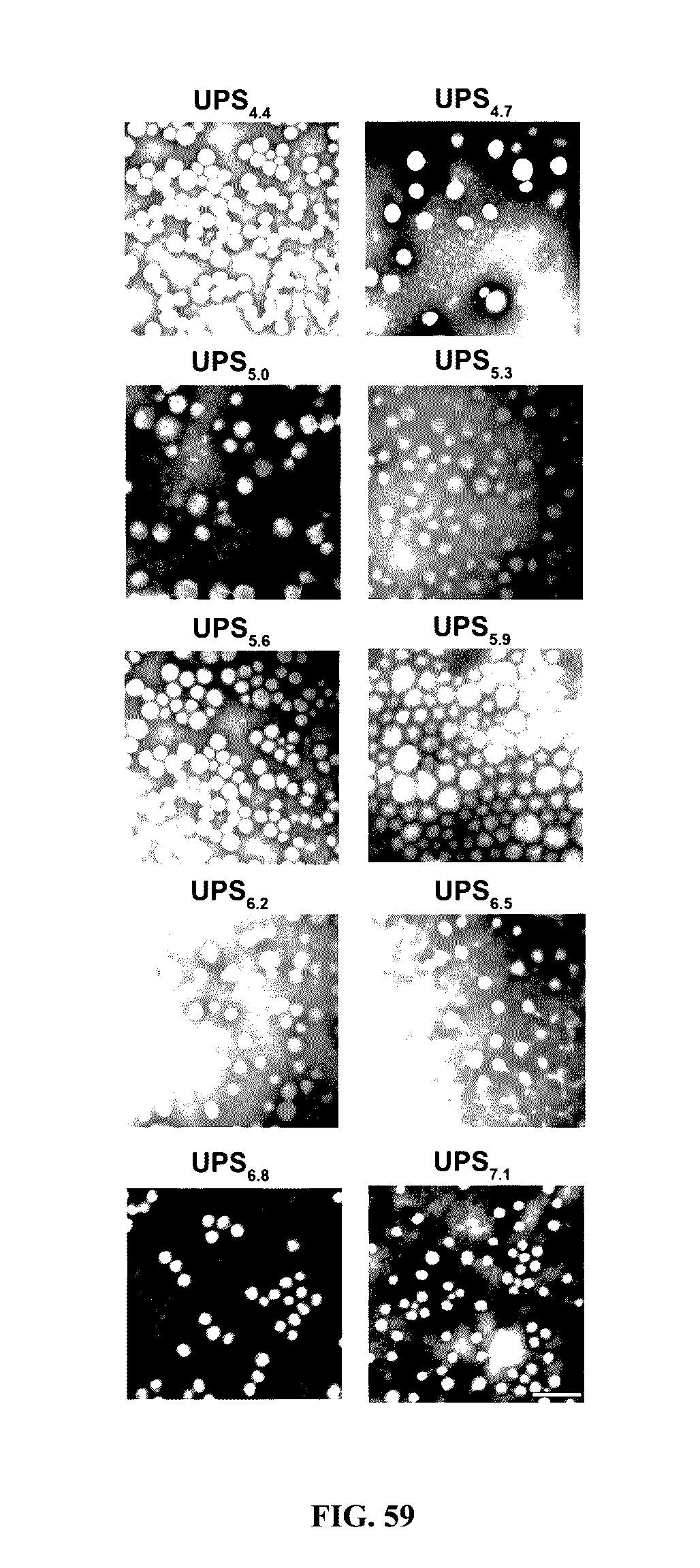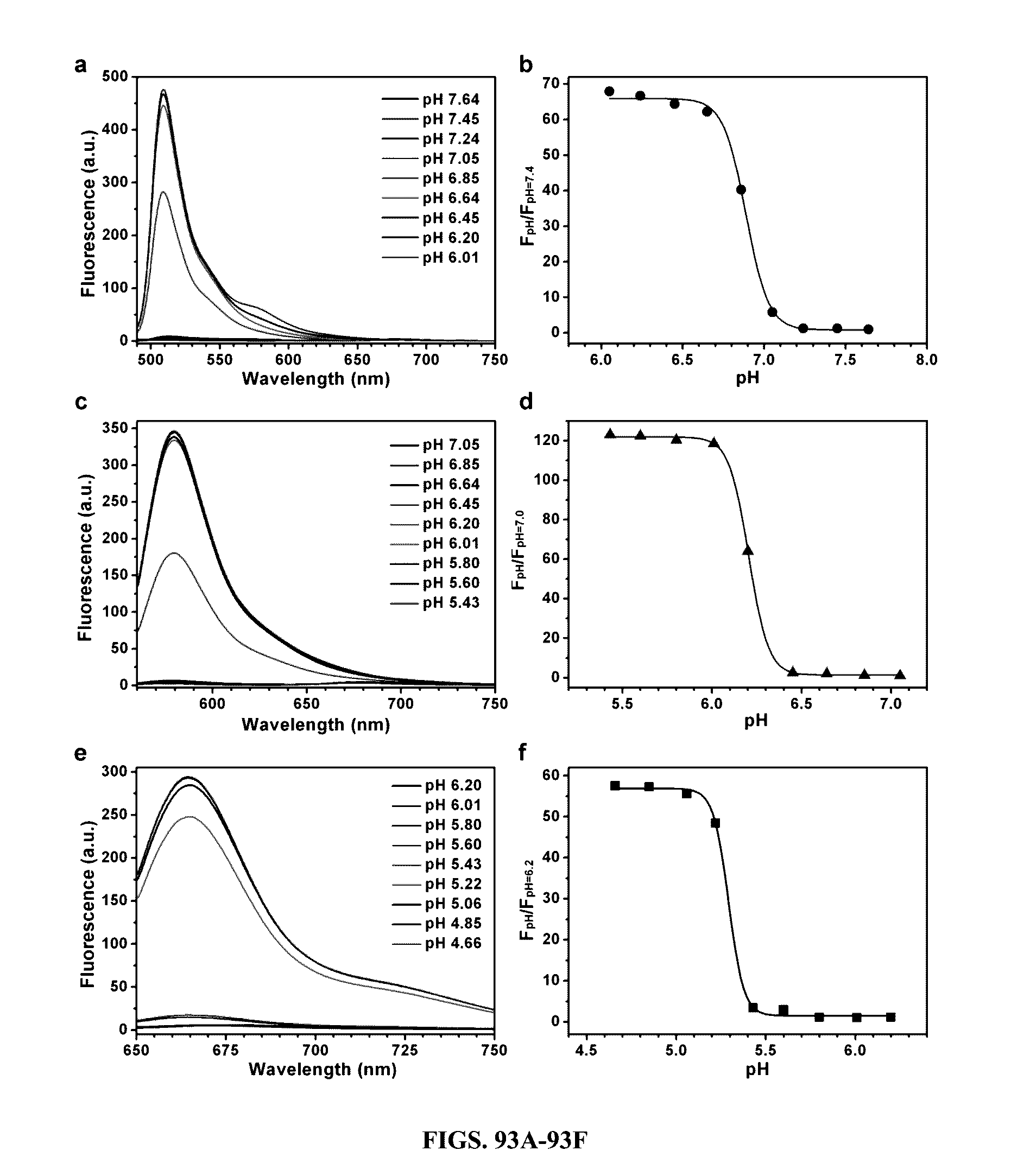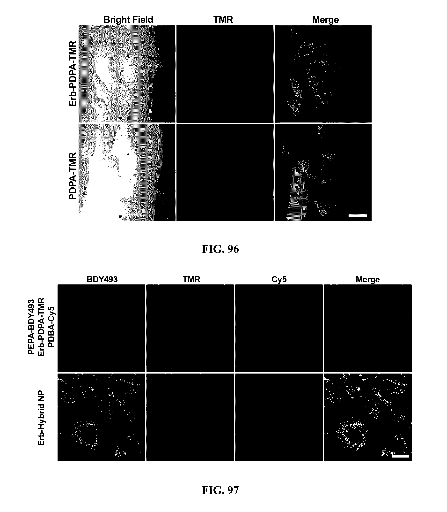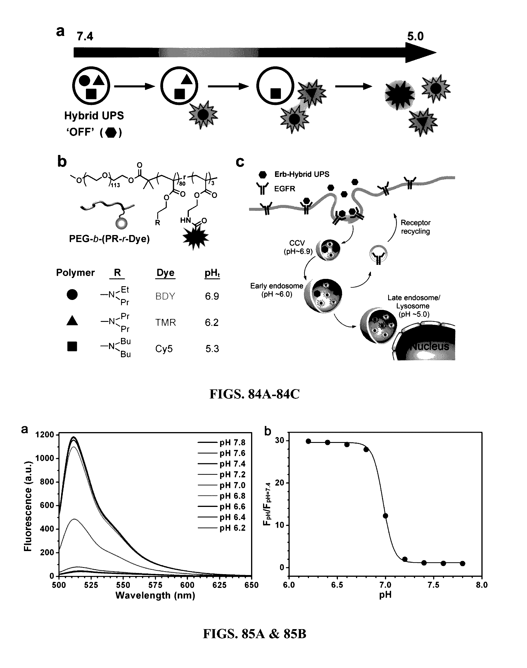 Mixed Alkyl Monomer Co-polymers Characteristics. Mn Mw Yield Polymers (kDa) (Da) PDI (%) pHta ΔpH10-90% P(DEA22- 20.7 26.4 1.28 86 7.10 0.15 EPA78) P(DEA11- 21.1 27.1 1.28 88 7.01 0.16 EPA89) PEPA100 21.2 26.6 1.25 87 6.92 0.15 P(DPA10- 20.5 24.8 1.21 83 6.82 0.14 EPA90) P(DPA21- 20.9 25.9 1.24 82 6.72 0.16 EPA79) apHtwas determined by the titration curve of Probe-ICG Characterization of PEPAx-ICG1copolymers with different repeating units of PEPA segment but the same ICG content and the resulting nanoprobe properties. Mn Repeat Particle size copolymer (kDa)a unitb (nm) pHt ΔpH10-90% FIHS6.0c PEPA40- 13.5 43 21.9 ± 1.7 6.96 0.30 32.3 ICG1 PEPA60- 16.8 62 24.8 ± 0.9 6.94 0.25 37.0 ICG1 PEPA80- 19.7 79 25.3 ± 0.8 6.92 0.18 45.3 ICG1 PEPA100- 25.1 102 26.0 ± 1.1 6.92 0.15 49.3 ICG1 PEPA120- 29.1 119 27.6 ± 1.0 6.91 0.13 51.6 ICG1 aNumber-averaged molecular weights (Mn) were determined by GPC using THF as the eluent; bRepeating unit was calculated based on integrations of —CH2—O— groups on PDPA to the methylene groups on PEG using1H NMR; cDetermined as ICG fluorescence emission intensity in 50% human serum. Log-rank p-values for pairwise treatment comparisons among different groups in survival surgery. Debulking White light TAGS Head and Control 0.347 <0.0001 <0.0001 neck surgery Debulking — <0.0001 <0.0001 White light — — <0.0001 Breast Control — 0.0501 <0.0001 surgery White light — — 0.0116 Tolerability and survival of C57BL/6 mice following bolus injection of PINS. 7 Days Morbidity reaction type and degreea mortality: Lack of Lack of Dose n death/total n Reduced mobility appetite (mg/kg) (% deaths) feces (<6 h) (<6 h) 150 0/5 (0%) − recovered soon recovered soon 200 0/10 (0%) + + + 250 0/15 (0%) ++ ++ ++ 300 4/5 (80%) +++ +++ +++ aReaction degree was recorded as: − no reaction; + mild reaction; ++ intermediate reaction; +++ strong reaction. Example 7: Use of Micelles to Evaluate Endocytic Organelles and their Use in Signaling and Proliferation