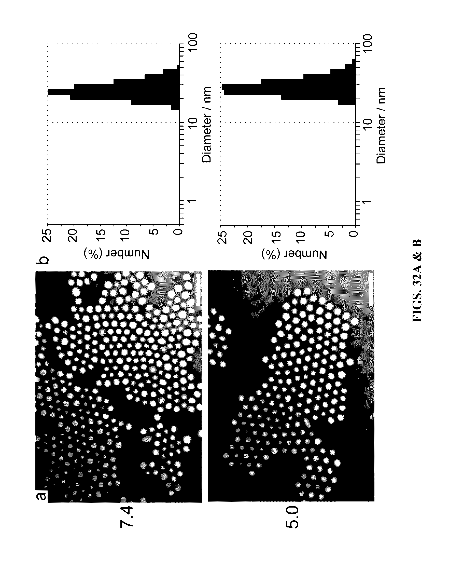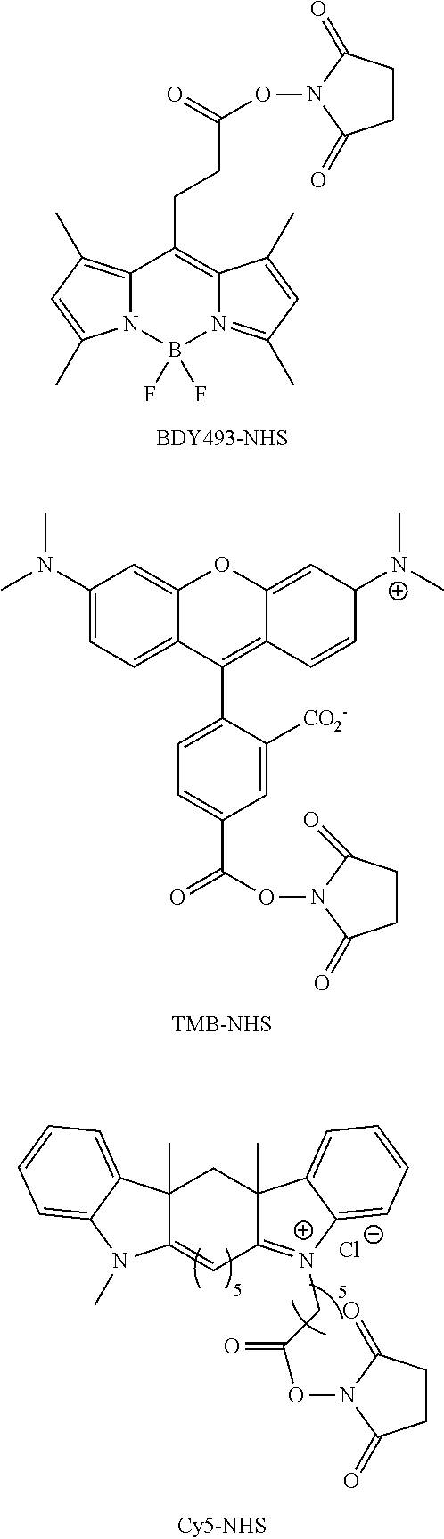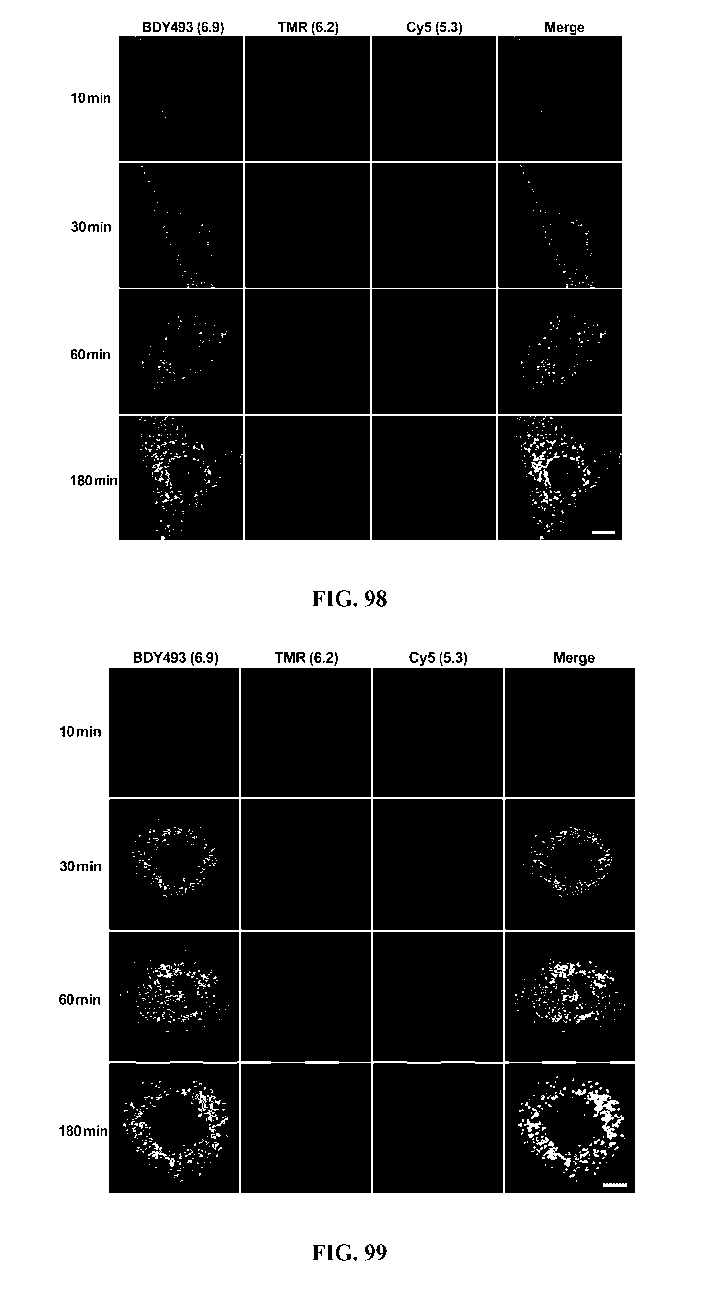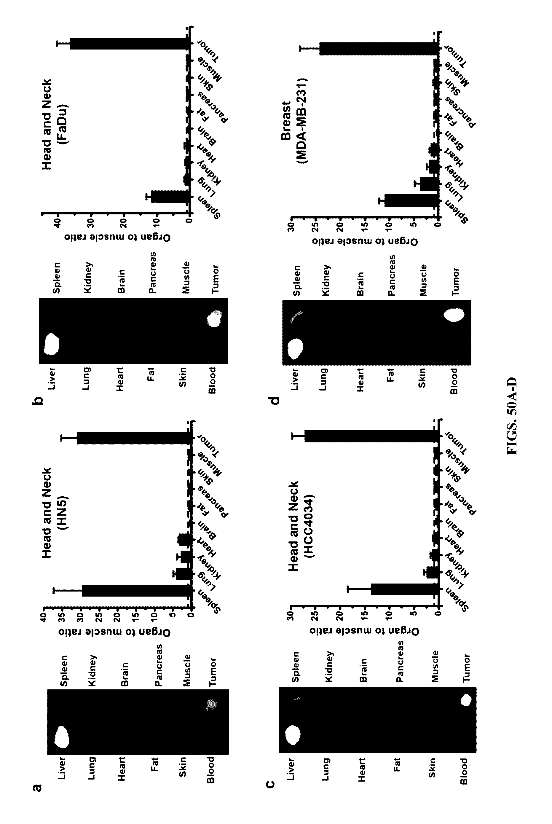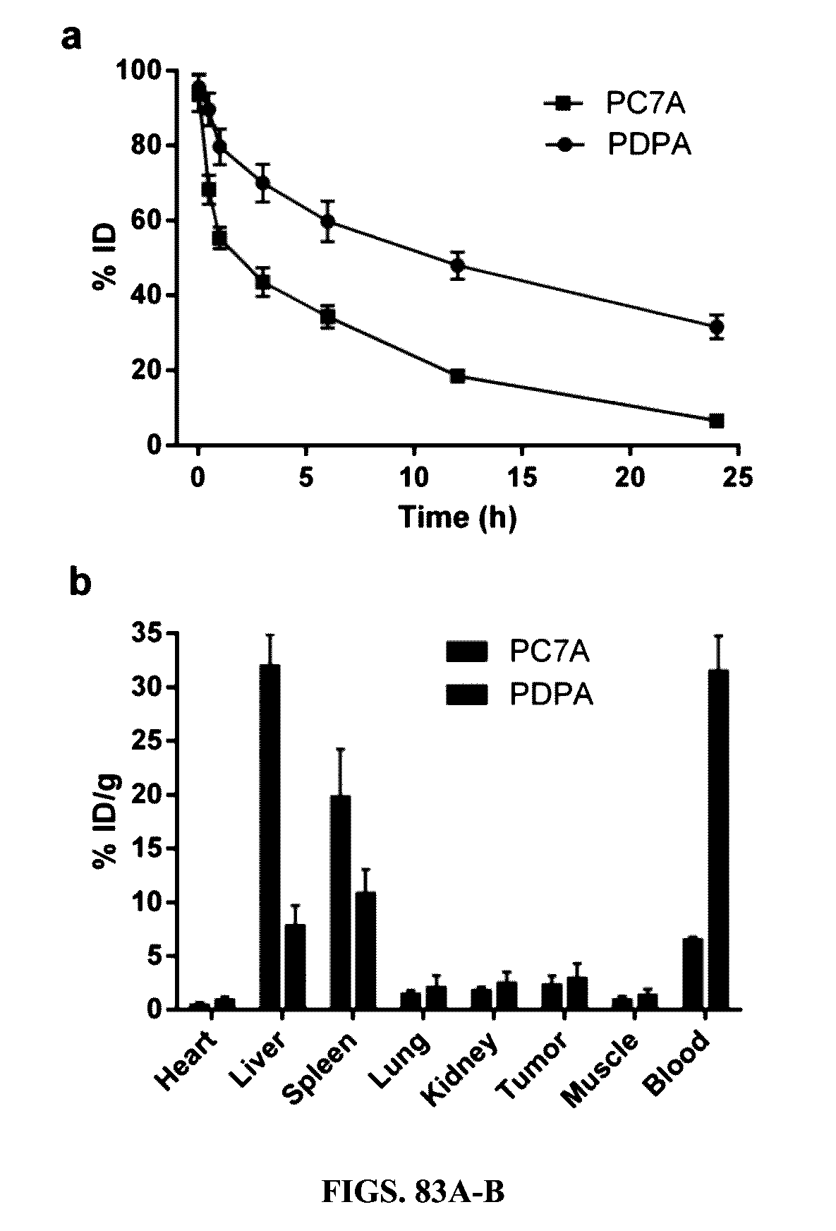 Mixed Alkyl Monomer Co-polymers Characteristics. Mn Mw Yield Polymers (kDa) (Da) PDI (%) pHta ΔpH10-90% P(DEA22- 20.7 26.4 1.28 86 7.10 0.15 EPA78) P(DEA11- 21.1 27.1 1.28 88 7.01 0.16 EPA89) PEPA100 21.2 26.6 1.25 87 6.92 0.15 P(DPA10- 20.5 24.8 1.21 83 6.82 0.14 EPA90) P(DPA21- 20.9 25.9 1.24 82 6.72 0.16 EPA79) apHtwas determined by the titration curve of Probe-ICG Characterization of PEPAx-ICG1copolymers with different repeating units of PEPA segment but the same ICG content and the resulting nanoprobe properties. Mn Repeat Particle size copolymer (kDa)a unitb (nm) pHt ΔpH10-90% FIHS6.0c PEPA40- 13.5 43 21.9 ± 1.7 6.96 0.30 32.3 ICG1 PEPA60- 16.8 62 24.8 ± 0.9 6.94 0.25 37.0 ICG1 PEPA80- 19.7 79 25.3 ± 0.8 6.92 0.18 45.3 ICG1 PEPA100- 25.1 102 26.0 ± 1.1 6.92 0.15 49.3 ICG1 PEPA120- 29.1 119 27.6 ± 1.0 6.91 0.13 51.6 ICG1 aNumber-averaged molecular weights (Mn) were determined by GPC using THF as the eluent; bRepeating unit was calculated based on integrations of —CH2—O— groups on PDPA to the methylene groups on PEG using1H NMR; cDetermined as ICG fluorescence emission intensity in 50% human serum. Log-rank p-values for pairwise treatment comparisons among different groups in survival surgery. Debulking White light TAGS Head and Control 0.347 <0.0001 <0.0001 neck surgery Debulking — <0.0001 <0.0001 White light — — <0.0001 Breast Control — 0.0501 <0.0001 surgery White light — — 0.0116 Tolerability and survival of C57BL/6 mice following bolus injection of PINS. 7 Days Morbidity reaction type and degreea mortality: Lack of Lack of Dose n death/total n Reduced mobility appetite (mg/kg) (% deaths) feces (<6 h) (<6 h) 150 0/5 (0%) − recovered soon recovered soon 200 0/10 (0%) + + + 250 0/15 (0%) ++ ++ ++ 300 4/5 (80%) +++ +++ +++ aReaction degree was recorded as: − no reaction; + mild reaction; ++ intermediate reaction; +++ strong reaction. Example 7: Use of Micelles to Evaluate Endocytic Organelles and their Use in Signaling and Proliferation