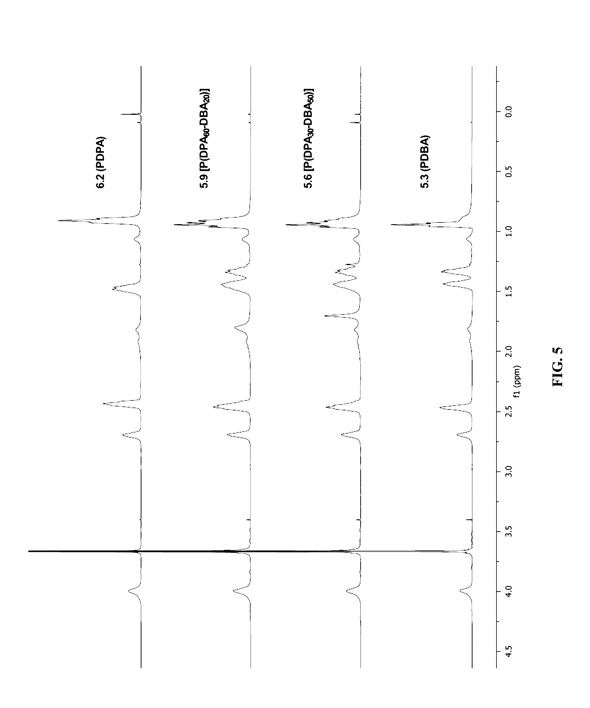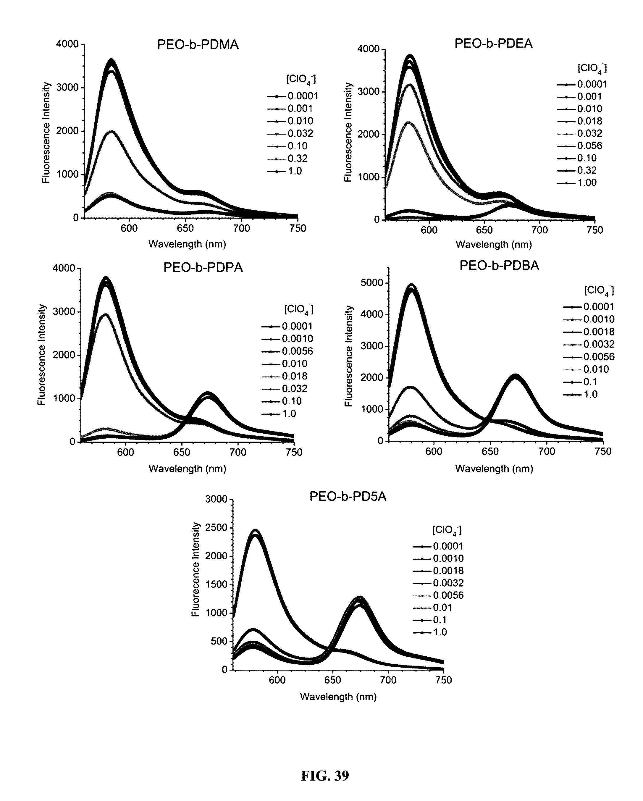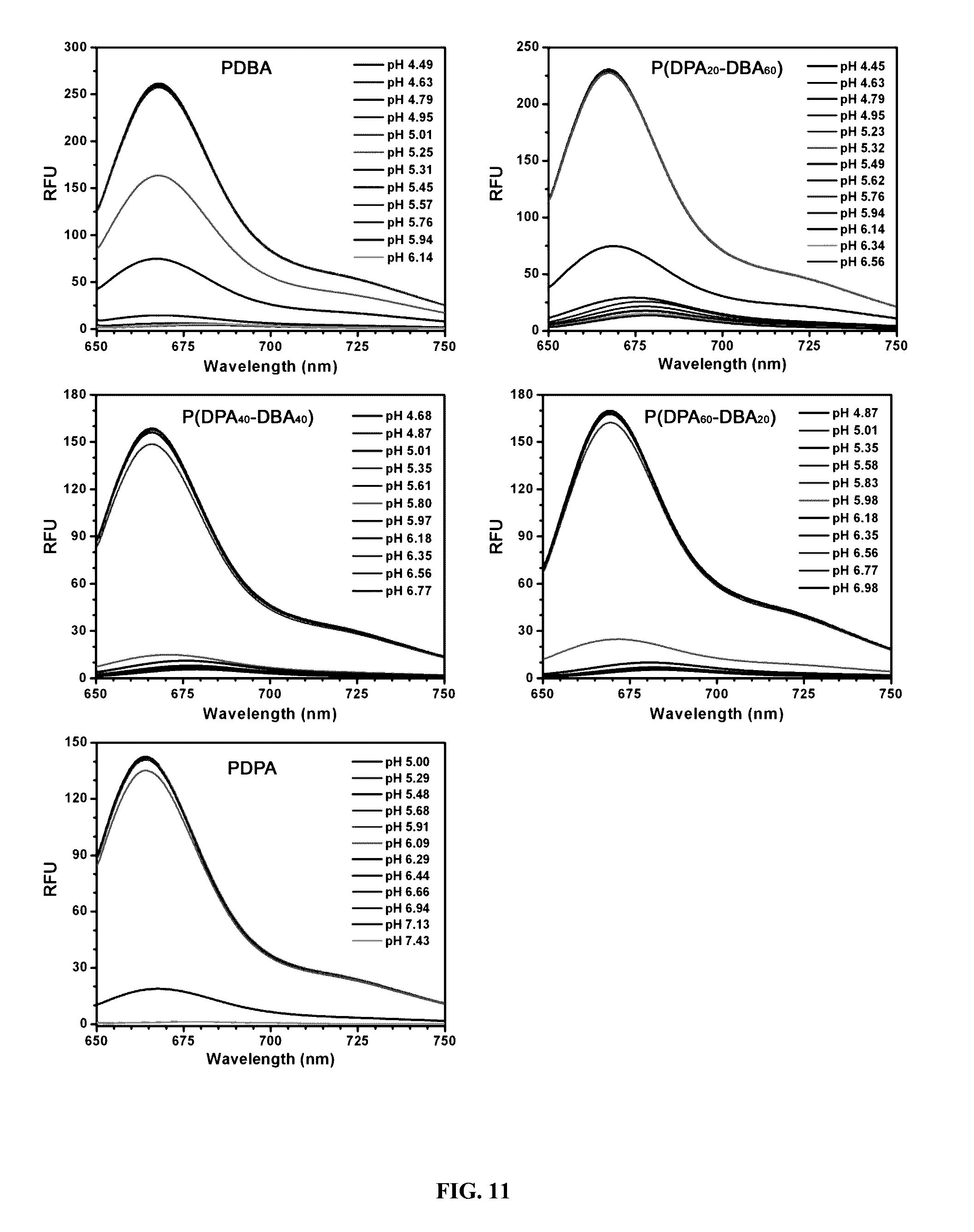 Coarse-tuned pH sensitive nanoprobes from Cy5-conjugated PEO-P(DEAx-D5Ay) copolymers. Mn Mw Yield Polymers (kDa) (Da) PDI (%) pHt ΔpH10-90% PD5A 26.9 32.6 1.21 85 4.38 0.19 P(DEA20- 21.3 26.3 1.23 90 5.19 0.65 D5A60) P(DEA40- 21.3 25.8 1.20 95 5.99 0.64 D5A40) P(DEA60- 22.3 26.4 1.19 90 6.88 0.47 D5A20) PDEA 22.6 26.6 1.18 91 7.83 0.14 Fine-tuned pH sensitive nanoprobes from Cy5- conjugated PEO-P(DPAx-DBAy) copolymers. Mn Mw Yield Polymers (kDa) (Da) PDI (%) pHt ΔpH10-90% PDBA 22.5 26.8 1.19 80 5.27 0.20 P(DPA20- 19.7 21.4 1.09 94 5.46 0.19 DBA60) P(DPA40- 21.7 24.7 1.14 78 5.70 0.20 DBA40) P(DPA60- 23.9 27.9 1.17 83 5.91 0.18 DBA20) PDPA 22.6 27.3 1.21 91 6.21 0.20 Composition of the UPS library spanning the pH range from 4.4 to 7.4. Mn Mw Yield Probe Composition (kDa) (Da) PDI (%) pHt ΔpH10-90% 4.4 PD5A 26.9 32.6 1.21 85 4.38 0.19 4.7 P(DBA28- 20.2 23.3 1.15 82 4.67 0.15 D5A52) 5.0 P(DBA56- 20.0 25.9 1.29 84 4.96 0.18 D5A24) 5.3 PDBA 22.5 26.8 1.19 80 5.27 0.20 5.6 P(DPA30- 20.4 24.9 1.22 89 5.63 0.19 DBA50) 5.9 P(DPA60- 23.9 27.9 1.17 83 5.91 0.18 DBA20) 6.2 PDPA 20.1 23.3 1.21 91 6.21 0.20 6.5 P(DEA21- 21.8 24.3 1.12 87 6.45 0.19 DPA79) 6.8 P(DEA39- 20.3 23.2 1.14 82 6.76 0.20 DPA61) 7.1 P(DEA58- 23.1 25.2 1.09 85 7.08 0.21 DPA42) 7.4 P(DEA76- 22.5 25.4 1.13 87 7.44 0.18 DPA24) Example 2 Synthesis and Characterization of a Library of pH Responsive Polymer Micelles