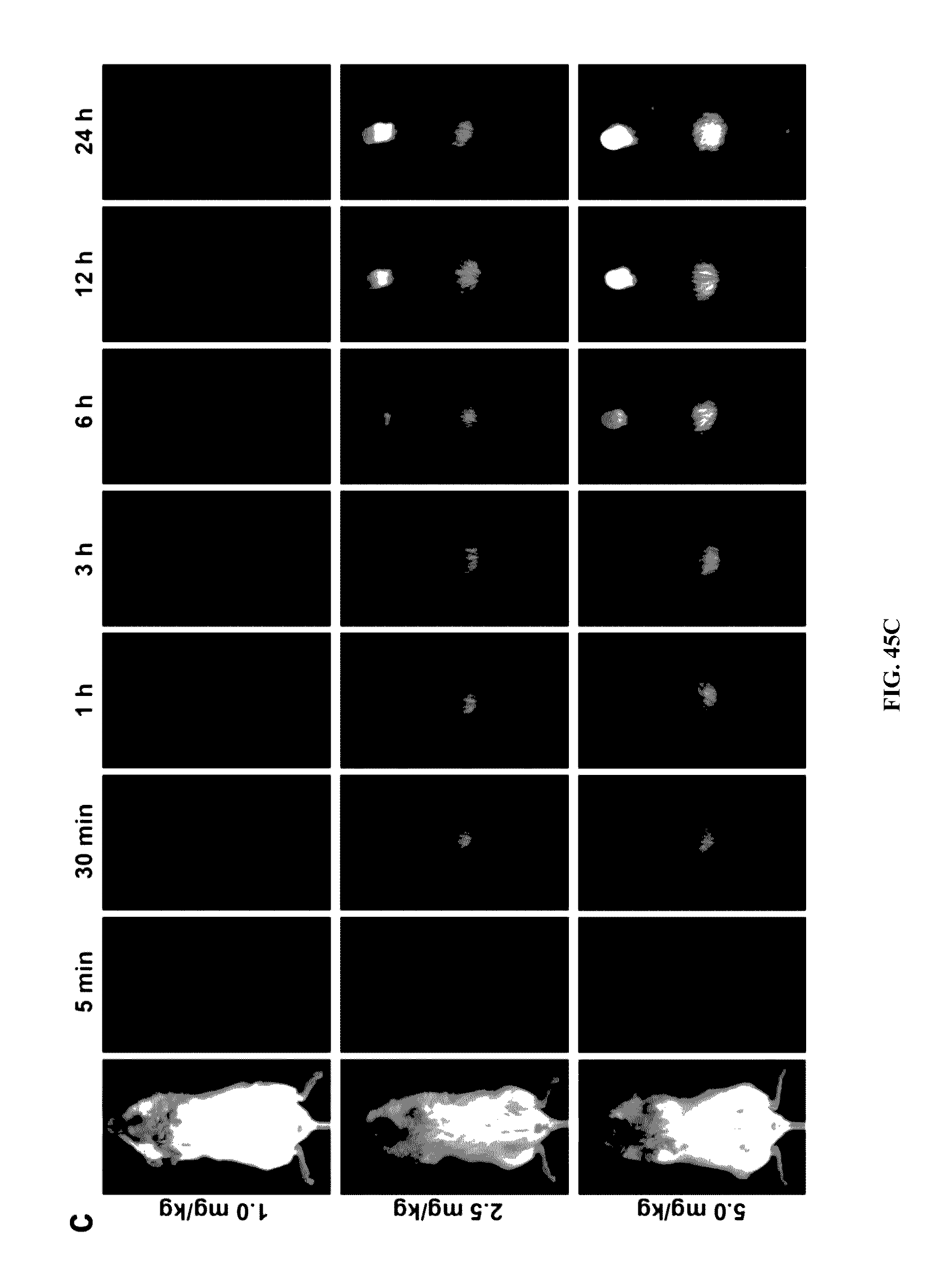 In some embodiments, the optical imaging scans are collected before the PET or SPECT imaging scans. In other embodiments, the optical imaging scans are collected after the PET or SPECT imaging scans. In other embodiments, the optical imaging scans are collected simultaneously with the PET or SPECT imaging scans. In some embodiments, the imaging scans are PET imaging scans. In other embodiments, the imaging scans are SPECT imaging scans. In some embodiments, the metal chelating group is bound to a64Cu ion. In some embodiments, the metal chelating group is a nitrogen containing macrocycle. In some embodiments, the nitrogen containing macrocycle is: wherein: R7, R5, R9, R10, R7′, R8′, R9′ a, b, c, d, a′, b′, and c′ are as defined above. In some embodiments, the nitrogen containing macrocycle is: In still yet another aspect, the present disclosure provides polymers of the formula: wherein:
