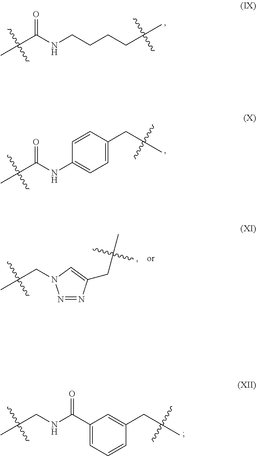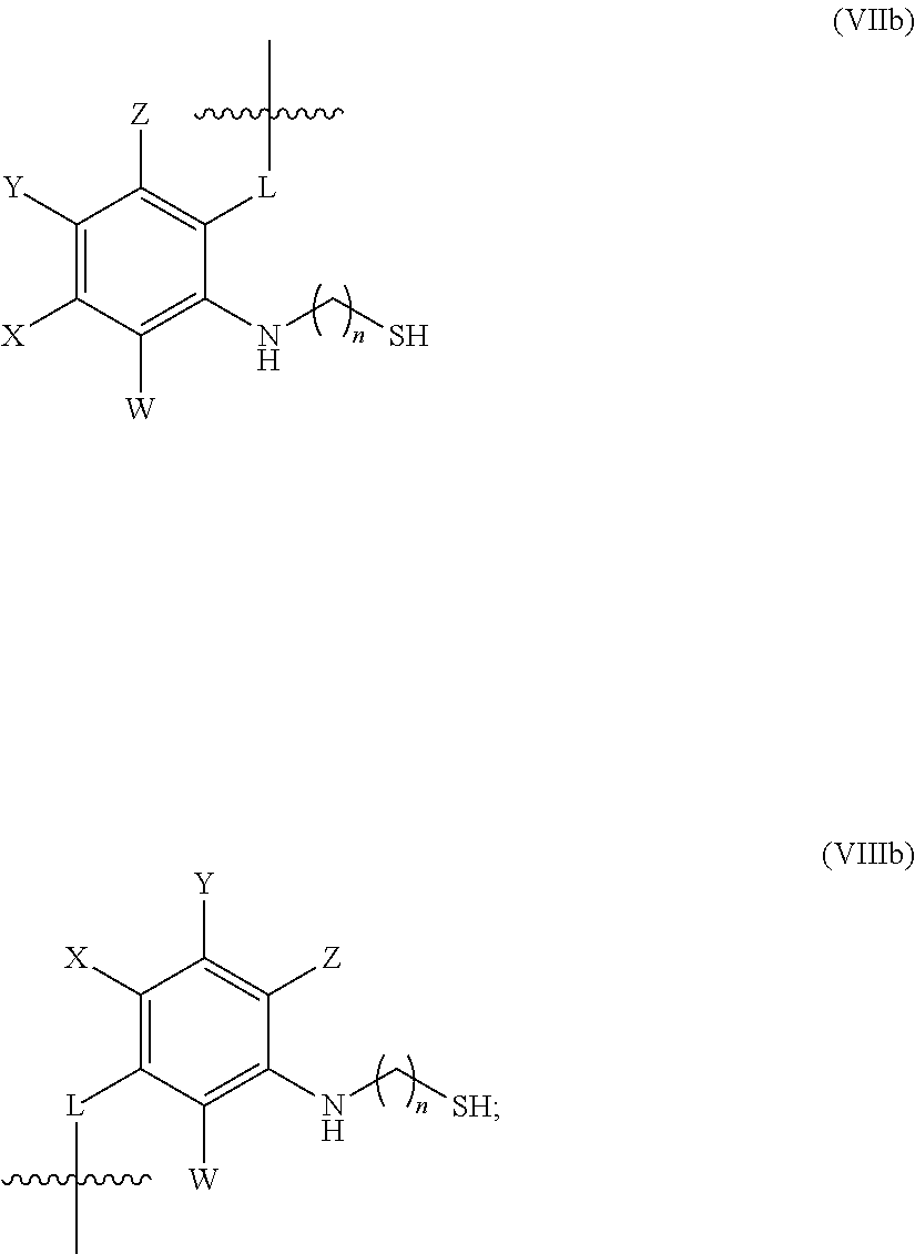 In one embodiment of the kit, the surface is a solid support. In another embodiment of the kit, the solid support is a resin, a nanoparticle, or the surface of a microarray. 5.3. Compounds and Compositions Compounds and compositions are also provided. These compounds and compositions can be used as reagents (also referred to herein as “chemical reagents”) according to the methods provided herein. Examples 1-4 set forth methods that can be used to synthesize the compounds and compositions. A compound (also referred to herein as a “reagent”, a “chemical reagent” or a “composition”) is provided having the formula (I), (II), (III), (IV), (V), (VI), (VII) or (VIII): or a salt thereof, wherein: