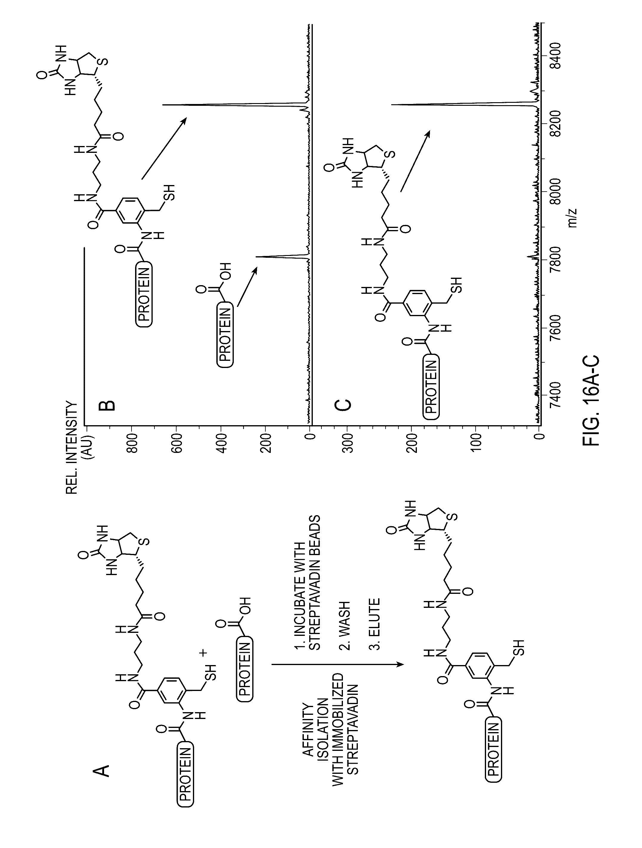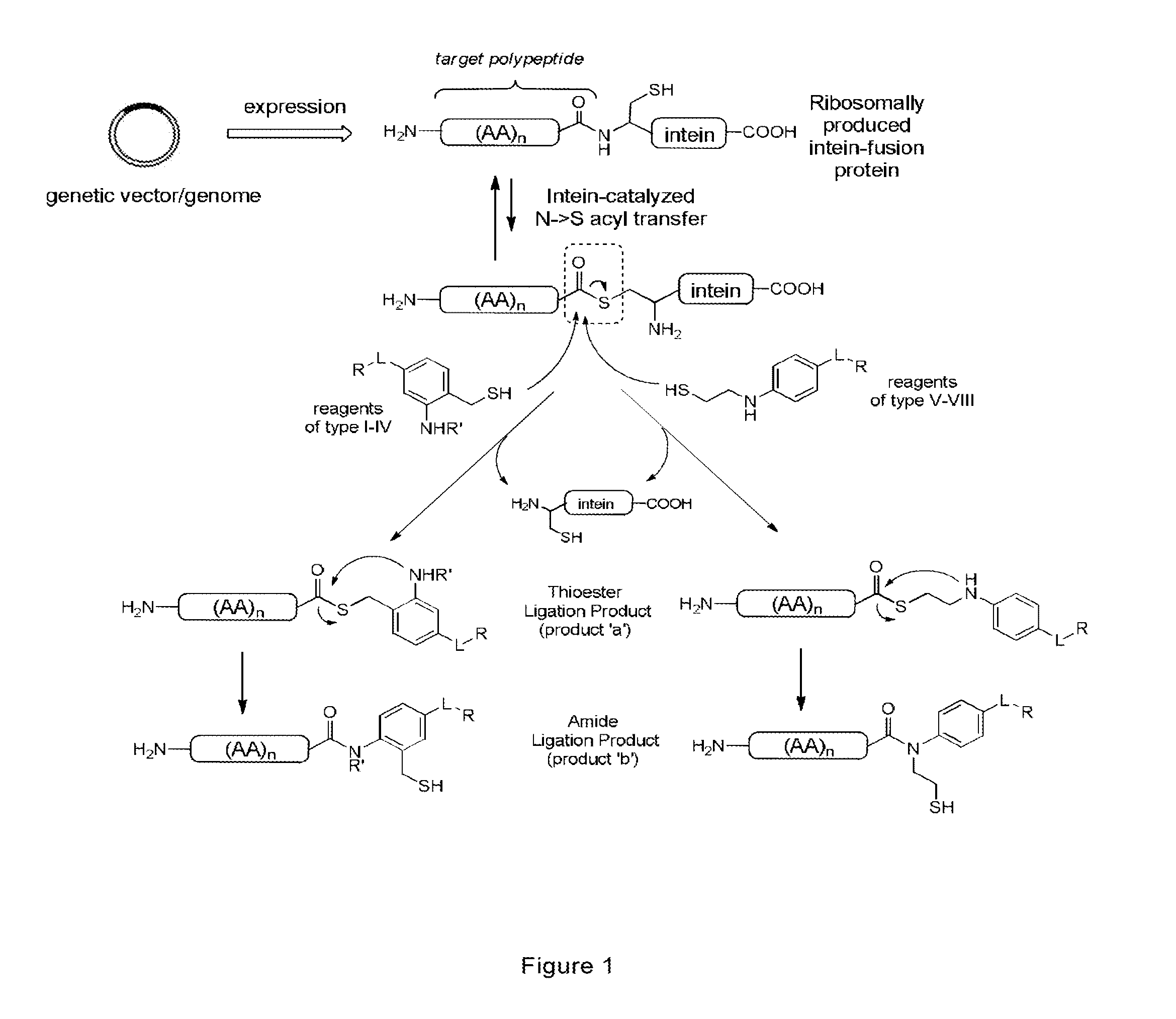 The reactivity of the reagents of formula (I) through (VIII) toward functionalization of a thioester-comprising polypeptide is conferred by the amino-thiol moiety comprised in these compounds (i.e., the 1-amino-2-(mercaptomethyl)-aryl moiety in compounds (I)-(IV) and the N-(2-mercaptoethyl)-amino-aryl moiety in compounds (V)-(VIII)) as discovered by the inventors. These amino-thiol moieties are able to efficiently promote a nucleophilic substitution at the C-terminal thioester group, thereby forming a covalent linkage between the target polypeptide and the reagent, and thus the between target polypeptide and the chemical entity or species comprised in the reagent. As described in The R1group in the reagents of formula (I), (II), (III), and (IV) can be hydrogen, an aliphatic, a substituted aliphatic, an aryl, or a substituted aryl group. The nature of the R1group can affect the rate of the intramolecular S→N acyl transfer process after the transthioesterification reaction, that is the conversion of product ‘a’ into product ‘b’ in L is a linker or a linker group that provides a spacer function between the R group and the thioester-reactive amino-thiol moiety in reagents (I) through (VIII). In one embodiment, L is a linker or a linker group selected from the group consisting of aliphatic, substituted aliphatic, aryl, substituted aryl, heteroatom-comprising aliphatic, substituted heteroatom-comprising aliphatic, heteroatom-comprising aryl, substituted heteroatom-comprising aryl, alkoxy, aryloxy groups. In particular, Y is a linker group selected from the group consisting of C1-C24alkyl, C1-C24substituted alkyl, C1-C24substituted heteroatom-comprising alkyl, C1-C24substituted heteroatom-comprising alkyl, C2-C24alkenyl, C2-C24substituted alkenyl, C2-C24substituted heteroatom-comprising alkenyl, C2-C24substituted heteroatom-comprising alkenyl, C2-C24alkynyl, C2-C24substituted alkynyl, C2-C24substituted heteroatom-comprising alkynyl, C2-C24substituted heteroatom-comprising alkynyl, C5-C24aryl, C5-C24substituted aryl, C5-C24substituted heteroatom-comprising aryl, C5-C24substituted heteroatom-comprising aryl, C1-C24alkoxy, C5-C24aryloxy, —O—, —S—, —NR′—, —C(O)—, —C(S)—, —C(O)NR′—, —C(S)NR′—, —N(R′)C(O)—, —S(O)k— where k is 1, 2, or 3, —S(O)kN(R′)—, —N(R′)C(O)N(R′)—, —N(R′)C(S)N(R′)—, —N(R′)S(O)kN(R′)—, —N(R′)—N═, —C(R′)═N—, —C(R′)═N—N(R′)—, —C(R′)═N—N═, —C(R′)2—N═N—, and —C(R′)2—N(R′)—N(R′)— group, where each R′ is independently an H, an aliphatic, a substituted aliphatic, an aryl, or a substituted aryl group. In some embodiments, L is an amino acid such as, for example, the α-amino acid glycine. In other embodiments, L is a polymer such as poly(ethyleneglycol). In still other embodiments, L is a polyether of formula —(CH2—CH2—O)n—, where n in an integer number between 1 and 15. The X, Y, W, and Z groups in the compounds of formula (I) through (VIII) can be hydrogen atoms or non-hydrogen substituents selected from the group consisting of alkyl, heteroatom-comprising alkyl, alkenyl, heteroatom-comprising alkenyl, alkynyl, heteroatom-comprising alkynyl, aryl, heteroatom-comprising aryl, alkoxy, heteroatom-comprising alkoxy, aryloxy, heteroatom-comprising aryloxy, halo, hydroxyl (—OH), ether (—OR′), thioether (—SR), carboxy (—COOH), ester (—COOR′), amide (—CONR′2), amino (—NR′2), nitro (—NO2), sulfo (—SO2—OH), sulfono (—SO2—OR′), sufonamide (—SO2NR2′), cyano (—C≡N), cyanato (—O—C≡N), thiocyanato (—S—C≡N), phosphono (—P(O)(OR′)2), phosphate (—O—P(O)(OR′)2) group, where each R′ is independently an H, an aliphatic, a substituted aliphatic, an aryl, or a substituted aryl group. In addition, any of the non-hydrogen substituent X, Y, W, and Z can be connected to one or more of the substituents to form a ring structure. For example, the substituent in X in compound of formula (III) can be connected to either Y or Z or both to form a ring structure. Non-limiting examples of ring structures include, for example, furan, thiophene, pyrrole, pyrroline, pyrrolidine, dioxolane, oxazole, thiazole, imidazole, imidazoline, imidazolidine, pyrazole, pyrazoline, pyrazolidine, isoxazole, isothiazole, oxadiazole, triazole, thiadiazole, pyran, pyridine, piperidine, dioxane, morpholine, dithiane, thiomorpholine, pyridazine, pyrimidine, pyrazine, piperazine, triazine, trithiane, indolizine, indole, isoindole, indoline, benzofuran, benzothiophene, indazole, benzimidazole, benzthiazole, purine, quinolizine, quinoline, isoquinoline, cinnoline, phthalazine, quinazoline, quinoxaline, naphthyridine, pteridine, quinuclidine, carbazole, acridine, phenazine, phenthiazine, phenoxazine, phenyl, indene, naphthalene, azulene, fluorene, anthracene, and phenanthracene groups. The use of non-hydrogen substituents as X, Y, W, or Z group can be useful to modulate the physico-chemical properties of the reagents (I)-(VIII), such as, for example, their water-solubility or cell permeability. At the same time, the replacement of these groups with sterically bulky substituents can affect the reactivity of the reagents toward functionalization of the target thioester-comprising polypeptide, in particular when the substituent is most proximal (i.e., in ortho position) to the thiol-comprising substituent (i.e., the methanethiol group in compounds (I)-(IV); the aminoalkylthiol group in compounds (V)-(VIII)). Accordingly, it is generally preferable that either none, one, or at most two groups among the X, Y, W, or Z groups are non-hydrogen substituents. In particular, it is generally preferred that the position in ortho to the thiol-comprising substituent is occupied by a hydrogen atom (e.g., X═H in compounds of general formula (I), (II), and (III)). With respect to the linker or linker group L comprised in the reagents of general f
