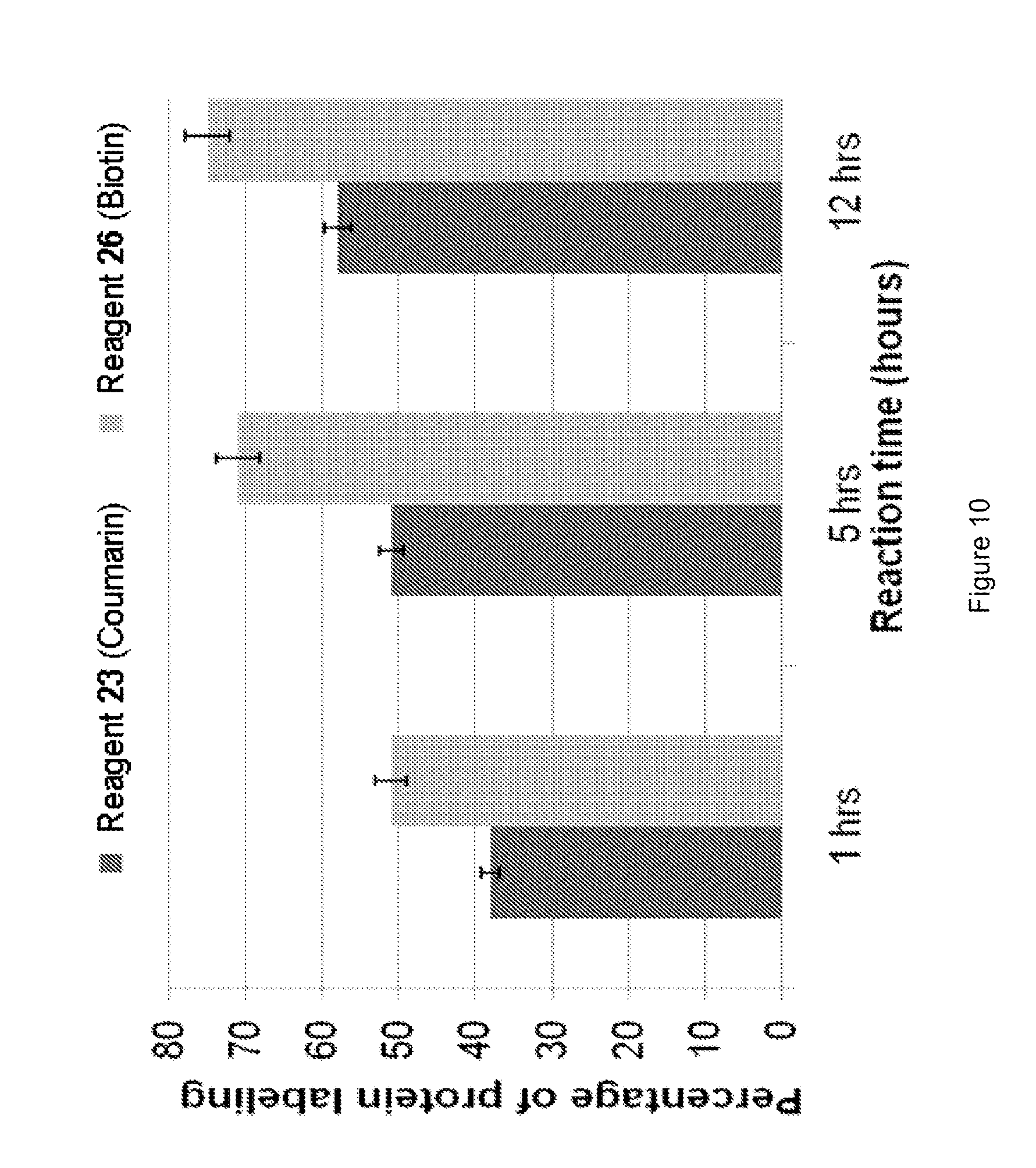 In another embodiment of the kit, R is a functional group, a label molecule, a tag molecule, an affinity label molecule, a photoaffinity label, a dye, a chromophore, a fluorescent molecule, a phosphorescent molecule, a chemiluminescent molecule, an energy transfer agent, a photocrosslinker molecule, a redox-active molecule, an isotopic label molecule, a spin label molecule, a metal chelator, a metal-comprising moiety, a heavy atom-comprising-moiety, a radioactive moiety, a contrast agent molecule, a MRI contrast agent, an isotopically labeled molecule, a PET agent, a photocaged moiety, a photoisomerizable moiety, a chemically cleavable group, a photocleavable group, an electron dense group, a magnetic group, an amino acid, a polypeptide, an antibody or antibody fragment, a carbohydrate, a monosaccharide, a polysaccharide, a nucleotide, a nucleoside, a DNA, a RNA, a siRNA, a polynucleotide, an antisense polynucleotide, a peptide nucleic acid (PNA), a fatty acid, a lipid, a cofactor, biotin, a biotin analogue, a biomaterial, a polymer, a water-soluble polymer, a polyethylene glycol derivative, a water-soluble dendrimer, a cyclodextrin, a small molecule, a protein-, nucleic acid-, or receptor-binding molecule, a biologically active molecule, a drug or drug candidate, a cytotoxic molecule, a solid support, a surface, a resin, a nanoparticle, or a quantum dot, or any combination thereof. In another embodiment of the kit, R is a bioorthogonal functional group selected from the group consisting of —NR′NR′2, —C(O)NR′NR′2, —ONH2, —N3, —C≡CR′, —CR′═CR′2, —PR′2, 2-cyanobenzothiazole, tetrazole, tetrazine, aziridine, dihydroazirine, norbornadiene groups, wherein each R′ is independently H, aliphatic, substituted aliphatic, aryl, or substituted aryl group. In another embodiment of the kit, R is a fluorescent molecule selected from the group consisting of a coumarin derivative, a naphthalene derivative, a pyrene derivative, a fluorescein derivative, a rhodamine derivative, a naphthoxanthene derivative, a phenanthridine derivative, a boron difluoride dipyrromethene (BODIPY) derivative, a cyanine derivatives, a phthalocyanine derivative, and a oxazine derivative. In another embodiment of the kit, R is biotin, a biotin analogue, or a perfluorinated alkyl chain CF3—(CF2)m— where m=3-15 In another embodiment of the kit, the at least one reagent comprises at least one compound selected from the group consisting of: