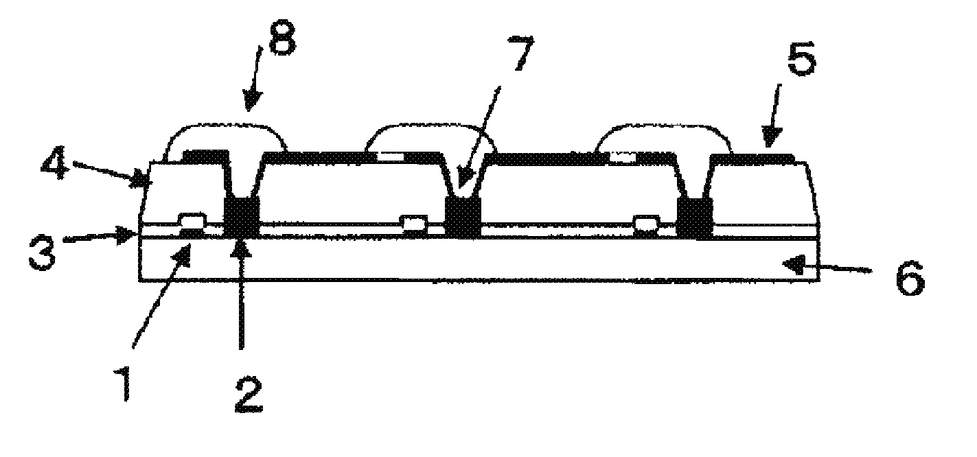 Compound having two or more Polymer A1 ethylenically Photopolymerization Acid unsaturated groups initiator anhydride Amount of Amount of value Amount of Particles Kind addition Kind addition Kind a1:a2 (mmol/g) addition Kind Examples 1 DPHA 60 B-1 2 SMA-3000P 3:1 2.54 5 PMA-ST 2 DPHA 60 B-1 2 SMA EF-40 4:1 2.04 5 PMA-ST 3 DPHA 60 B-1 2 SMA EF-60 6:1 1.48 5 PMA-ST 4 DPHA 60 B-1 2 SMA EF-60 6:1 2.01 2.5 PMA-ST SMA-3000P 3:1 2.5 5 DPHA 60 B-1 2 C-1 3:1 1.60 5 PMA-ST 6 DPHA 60 B-1 2 C-2 4:1 1.50 5 PMA-ST 7 DPHA 60 B-1 2 C-3 5:1 1.40 5 PMA-ST 8 DPHA 60 B-1 2 SMA-3000P 3:1 2.54 0.5 PMA-ST 9 DPHA 60 B-1 2 SMA-3000P 3:1 2.54 3 PMA-ST 10 DPHA 60 B-1 2 SMA-3000P 3:1 2.54 8 PMA-ST 11 DPHA 60 B-1 2 SMA-3000P 3:1 2.54 5 MIBK-ST-L 12 DPHA 60 B-1 2 SMA-3000P 3:1 2.54 5 E-3 13 DPHA 60 B-1 2 SMA-3000P 3:1 2.54 5 E-4 14 DPHA 60 B-1 2 SMA-3000P 3:1 2.54 5 E-5 15 DPHA 60 B-1 2 SMA-3000P 3:1 2.54 5 PMA-ST 16 DPHA 60 B-1 2 SMA-3000P 3:1 2.54 5 PMA-ST 17 DPHA 60 B-1 2 SMA-3000P 3:1 2.54 5 PMA-ST 18 DPHA 60 B-1 2 SMA-3000P 3:1 2.54 5 PMA-ST 19 DPHA 60 B-2 2 SMA-3000P 3:1 2.54 5 PMA-ST 20 DPHA 60 B-3 2 SMA-3000P 3:1 2.54 5 PMA-ST 21 A-TMMT 60 B-1 2 SMA-3000P 3:1 2.54 5 PMA-ST 22 M309 60 B-1 2 SMA-3000P 3:1 2.54 5 PMA-ST 23 A-2 60 B-1 2 SMA-3000P 3:1 2.54 5 PMA-ST 24 M-510 60 B-1 2 SMA-3000P 3:1 2.54 5 PMA-ST 25 M-520 60 B-1 2 SMA-3000P 3:1 2.54 5 PMA-ST 26 A-NOD-N 60 B-1 2 SMA-3000P 3:1 2.54 5 PMA-ST 27 DPHA 30 B-1 2 SMA-3000P 3:1 2.54 5 PMA-ST A-1 30 Particles Number average primary Polymerization inhibitor Alkoxysilane compound Surfactant particle size Amount of Amount of Amount of Amount of (nm) addition Kind addition Kind addition Kind addition Examples 1 10-15 30 Phenothiazine 0.2 KBM-5103 10 W-1 0.1 2 10-15 30 Phenothiazine 0.2 KBM-5103 10 W-1 0.1 3 10-15 30 Phenothiazine 0.2 KBM-5103 10 W-1 0.1 4 10-15 30 Phenothiazine 0.2 KBM-5103 10 W-1 0.1 5 10-15 30 Phenothiazine 0.2 KBM-5103 10 W-1 0.1 6 10-15 30 Phenothiazine 0.2 KBM-5103 10 W-1 0.1 7 10-15 30 Phenothiazine 0.2 KBM-5103 10 W-1 0.1 8 10-15 30 Phenothiazine 0.2 KBM-5103 10 W-1 0.1 9 10-15 30 Phenothiazine 0.2 KBM-5103 10 W-1 0.1 10 10-15 30 Phenothiazine 0.2 KBM-5103 10 W-1 0.1 11 40-50 30 Phenothiazine 0.2 KBM-5103 10 W-1 0.1 12 20 30 Phenothiazine 0.2 KBM-5103 10 W-1 0.1 13 200 30 Phenothiazine 0.2 KBM-5103 10 W-1 0.1 14 150 30 Phenothiazine 0.2 KBM-5103 10 W-1 0.1 15 10-15 10 Phenothiazine 0.2 KBM-5103 10 W-1 0.1 16 10-15 20 Phenothiazine 0.2 KBM-5103 10 W-1 0.1 17 10-15 30 Phenothiazine 0.2 KBM-5103 10 W-1 0.1 18 10-15 40 Phenothiazine 0.2 KBM-5103 10 W-1 0.1 19 10-15 30 Phenothiazine 0.2 KBM-5103 10 W-1 0.1 20 10-15 30 Phenothiazine 0.2 KBM-5103 10 W-1 0.1 21 10-15 30 Phenothiazine 0.2 KBM-5103 10 W-1 0.1 22 10-15 30 Phenothiazine 0.2 KBM-5103 10 W-1 0.1 23 10-15 30 Phenothiazine 0.2 KBM-5103 10 W-1 0.1 24 10-15 30 Phenothiazine 0.2 KBM-5103 10 W-1 0.1 25 10-15 30 Phenothiazine 0.2 KBM-5103 10 W-1 0.1 26 10-15 30 Phenothiazine 0.2 KBM-5103 10 W-1 0.1 27 10-15 30 Phenothiazine 0.2 KBM-5103 10 W-1 0.1 Compound having two or more Polymer A1 ethylenically Photopolymerization Acid unsaturated groups initiator anhydride Amount of Amount of value Amount of Particles Kind addition Kind addition Kind a1:a2 (mmol/g) addition Kind Examples 28 DPHA 50 B-1 2 SMA-3000P 3:1 2.54 5 PMA-ST A-1 10 29 DPHA 30 B-1 2 SMA-3000P 3:1 2.54 5 PMA-ST 30 DPHA 45 B-1 2 SMA-3000P 3:1 2.54 5 PMA-ST 31 DPHA 60 B-1 2 SMA-3000P 3:1 2.54 5 PMA-ST 32 DPHA 70 B-1 2 SMA-3000P 3:1 2.54 5 PMA-ST 33 DPHA 60 B-1 2 SMA-3000P 3:1 2.54 5 PMA-ST 34 DPHA 60 B-1 2 SMA-3000P 3:1 2.54 5 PMA-ST 35 DPHA 60 B-1 2 SMA-3000P 3:1 2.54 5 PMA-ST 36 DPHA 60 B-1 2 SMA-3000P 3:1 2.54 5 PMA-ST 37 DPHA 60 B-1 2 SMA-3000P 3:1 2.54 5 PMA-ST 38 DPHA 60 B-1 2 SMA-3000P 3:1 2.54 5 PMA-ST 39 DPHA 60 B-1 2 SMA-3000P 3:1 2.54 0.1 PMA-ST 40 DPHA 60 B-1 2 SMA-3000P 3:1 2.54 10 PMA-ST 41 DPHA 60 B-1 2 SMA-3000P 3:1 2.54 5 PGM-ST 42 DPHA 60 B-1 2 SMA-3000P 3:1 2.54 5 PGM-ST 43 DPHA 20 B-1 2 SMA-3000P 3:1 2.54 5 PGM-ST 44 DPHA 120 B-1 2 SMA-3000P 3:1 2.54 5 PMA-ST Comparative 1 DPHA 60 B-1 2 SMA-1000P 1:1 4.55 5 PMA-ST Examples 2 DPHA 60 B-1 2 SMA-2000P 2:1 3.06 5 PMA-ST 3 DPHA 60 B-1 2 SMA EF-80 8:1 1.17 5 PMA-ST 4 DPHA 60 B-1 2 SMA-2625 2:1 0.94 5 PMA-ST 5 DPHA 60 B-1 2 SMA-17352 1:1 1.21 5 PMA-ST 6 DPHA 60 B-1 2 Polystylene — 0 5 PMA-ST 7 DPHA 60 B-1 2 — — — — PMA-ST 8 DPHA 60 B-1 2 SMA-3000P 3:1 2.54 5 — 9 M-5300 60 B-1 2 SMA-3000P 3:1 2.54 5 PMA-ST 10 DPHA 60 B-1 2 SMA-3000P 3:1 2.54 5 E-6 Particles Number average primary Polymerization inhibitor Alkoxysilane compound Surfactant particle size Amount of Amount of Amount of Amount of (nm) addition Kind addition Kind addition Kind addition Examples 28 10-15 30 Phenothiazine 0.2 KBM-5103 10 W-1 0.1 29 10-15 30 Phenothiazine 0.2 KBM-5103 10 W-1 0.1 30 10-15 30 Phenothiazine 0.2 KBM-5103 10 W-1 0.1 31 10-15 30 Phenothiazine 0.2 KBM-5103 10 W-1 0.1 32 10-15 30 Phenothiazine 0.2 KBM-5103 10 W-1 0.1 33 10-15 30 Phenothiazine 0.1 KBM-5103 10 W-1 0.1 34 10-15 30 Phenoxazine 0.2 KBM-5103 10 W-1 0.1 35 10-15 30 Phenothiazine 0.2 KBM-5103 15 W-1 0.1 36 10-15 30 Phenothiazine 0.2 KBM-403 10 W-1 0.1 37 10-15 30 Phenothiazine 0.2 KBM-5103 10 W-1 0.2 38 10-15 30 Phenothiazine 0.2 KBM-5103 10 W-2 0.1 39 10-15 30 Phenothiazine 0.2 KBM-5103 10 W-1 0.1 40 10-15 30 Phenothiazine 0.2 KBM-5103 10 W-1 0.1 41 10-15 5 Phenothiazine 0.2 KBM-5103 10 W-1 0.1 42 10-15 55 Phenothiazine 0.2 KBM-5103 10 W-1 0.1 43 10-15 30 Phenothiazine 0.2 KBM-5103 10 W-1 0.1 44 10-15 30 Phenothiazine 0.2 KBM-5103 10 W-1 0.1 Comparative 1 10-15 30 Phenothiazine 0.2 KBM-5103 10 W-1 0.1 Examples 2 10-15 30 Phenothiazine 0.2 KBM-5103 10 W-1 0.1 3 10-15 30 Phenothiazine 0.2 KBM-5103 10 W-1 0.1 4 10-15 30 Phenothiazine 0.2 KBM-5103 10 W-1 0.1 5 10-15 30 Phenothiazine 0.2 KBM-5103 10 W-1 0.1 6 10-15 30 Phenothiazine 0.2 KBM-5103 10 W-1 0.1 7 10-15 30 Phenothiazine 0.2 KBM-5103 10 W-1 0.1 8 — — Phenothiazine 0.2 KBM-5103 10 W-1 0.1 9 10-15 30 Phenothiazine 0.2 KBM-5103 10 W-1 0.1 10 300 30 Phenothiazine 0.2