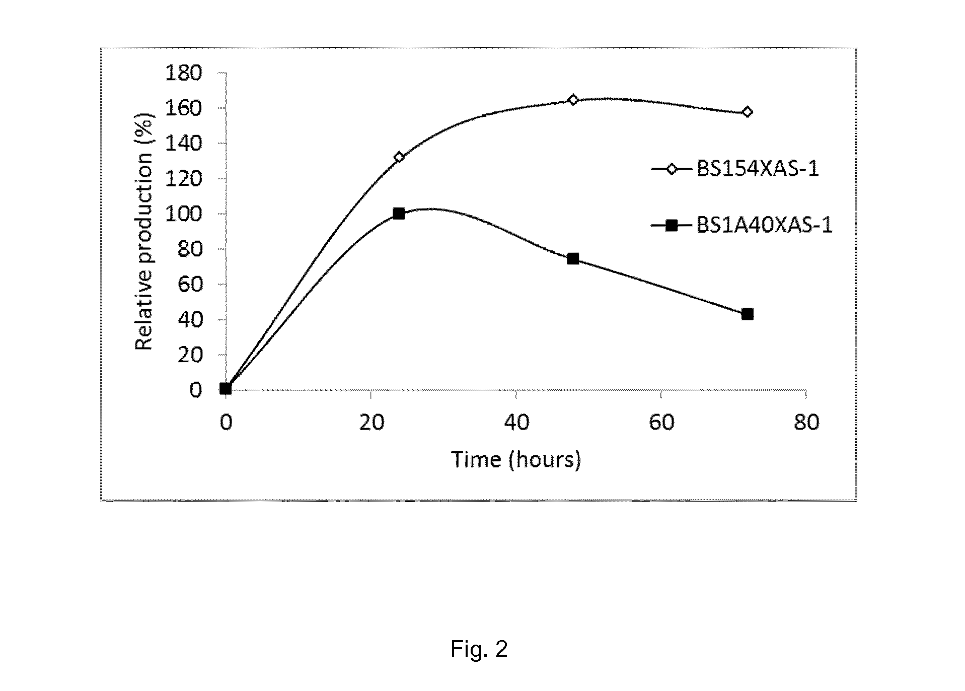5′-GGTTGCCGAAAACAAGCTAA-3′ (SEQ ID NO: 18) BS154G00XAS-1 BS154 pDBC1G00XAS-1 BS154G01XAS-1 BS154 pDBC1G01XAS-1 BS154G02XAS-1 BS154 pDBC1G02XAS-1 Example 5. Expression of endo-1,4-beta-xylanase in