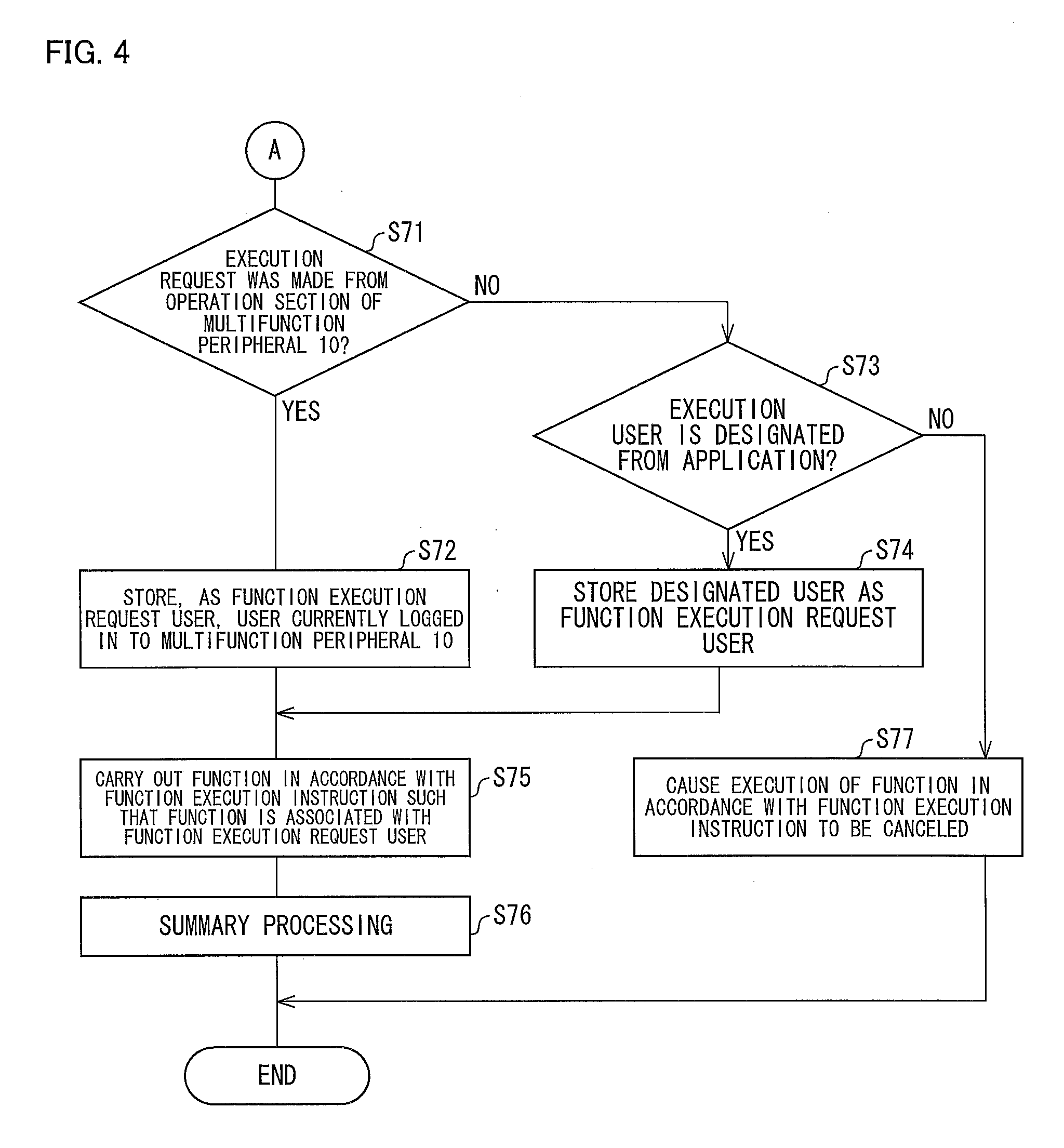 In a case of a first function of carrying out a cooperative processing in accordance with an instruction from a user of a multifunction peripheral (10), the user is set as an execution user. In a case of a second function of carrying out a cooperative processing in accordance with an instruction from an application, a user instructed by the application is set as an execution user. Further, in a case where an execution user of a cooperative processing carried out using the first function and an execution user of a cooperative processing carried out using the second function are identical, use history information of the execution user is managed as use history information of a single user. This makes it possible to appropriately manage use history information of a cooperative processing.