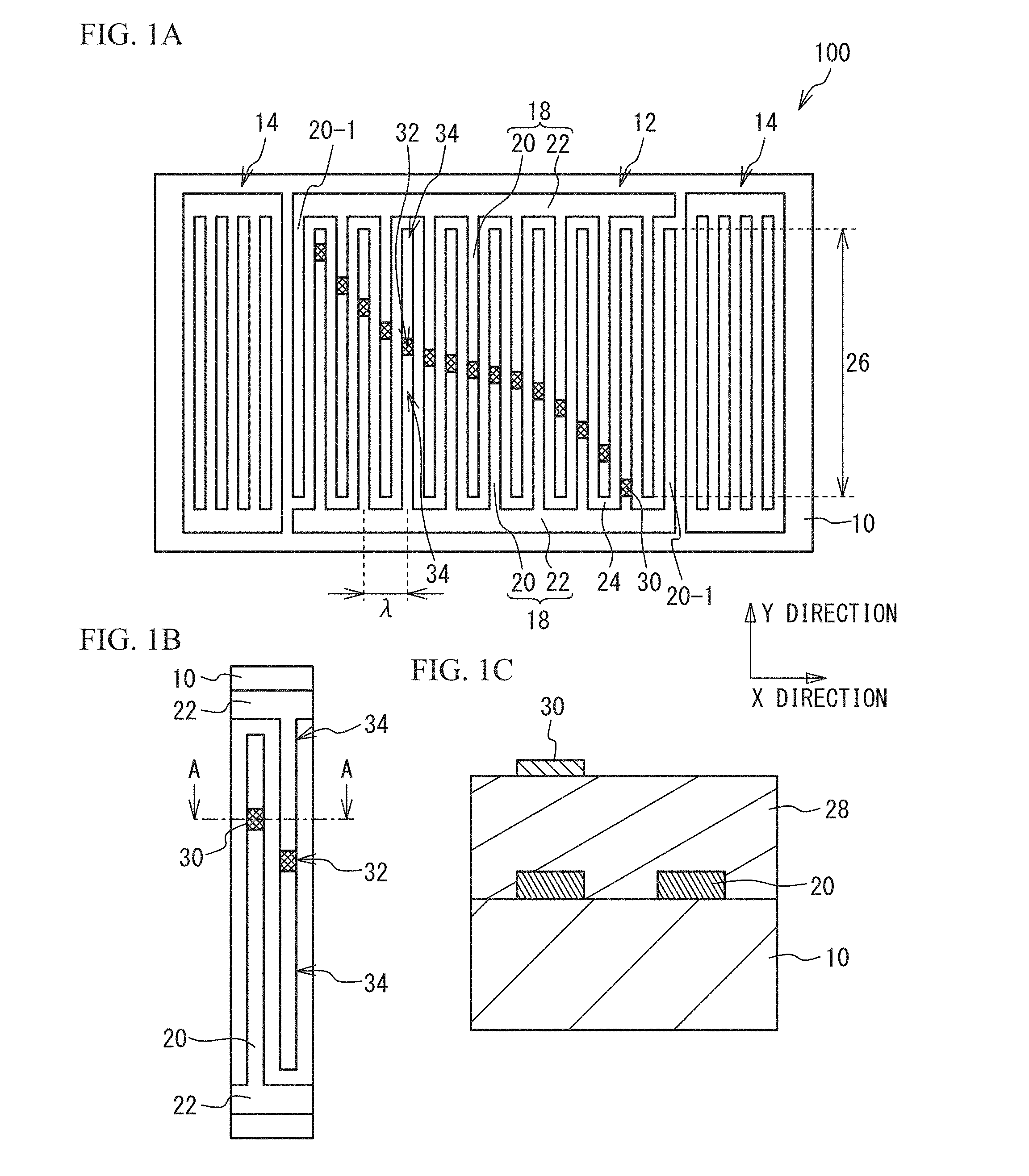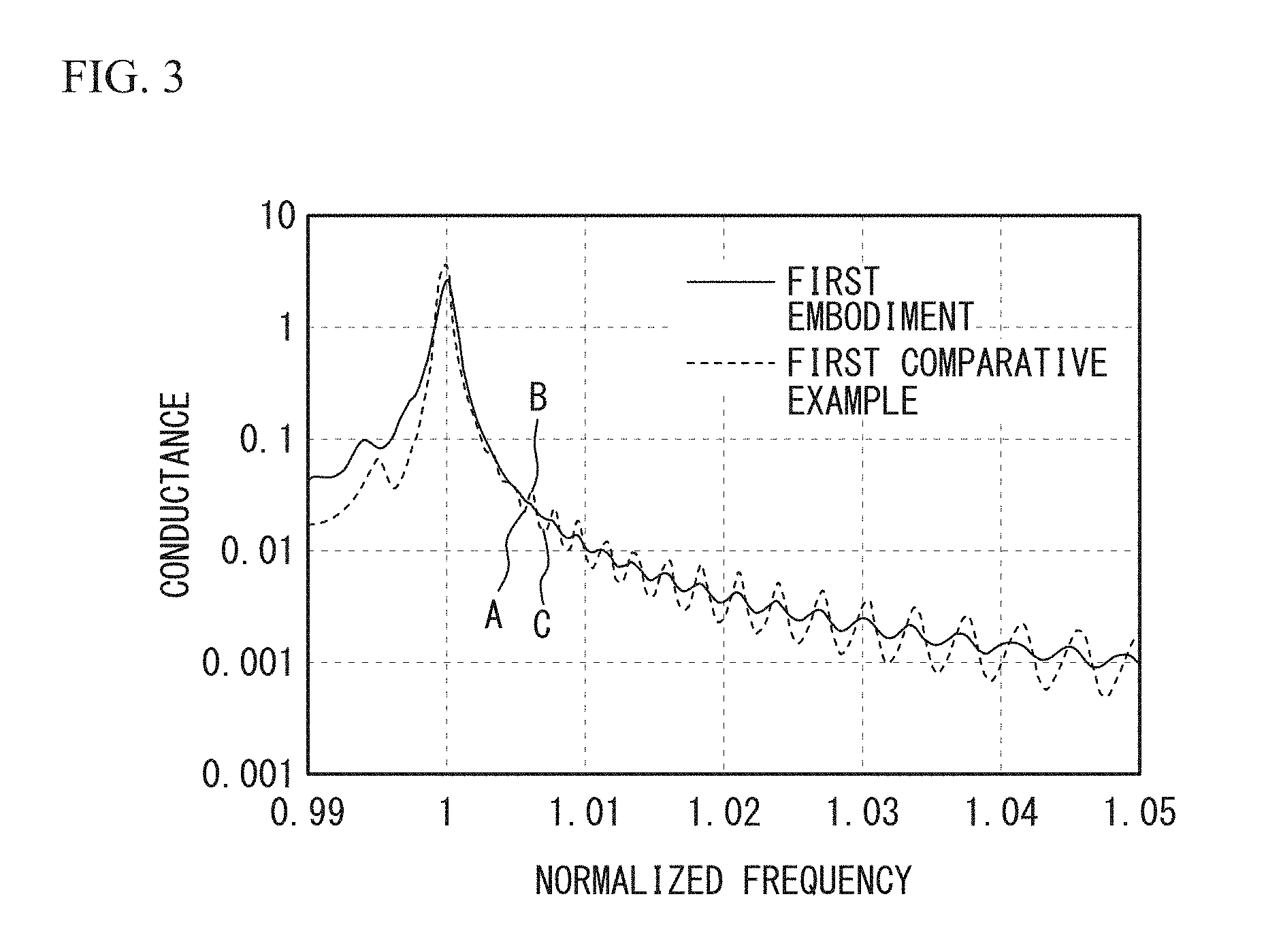 a first region that is located in the overlap region, in which a velocity of the acoustic wave is a first velocity, and of which a position in a first direction in which the plurality of electrode fingers extend changes with respect to a second direction intersecting the first direction; and second regions that are located in the overlap region, in which a velocity of the acoustic wave is a second velocity different from the first velocity, and that sandwich the first region in the first direction.