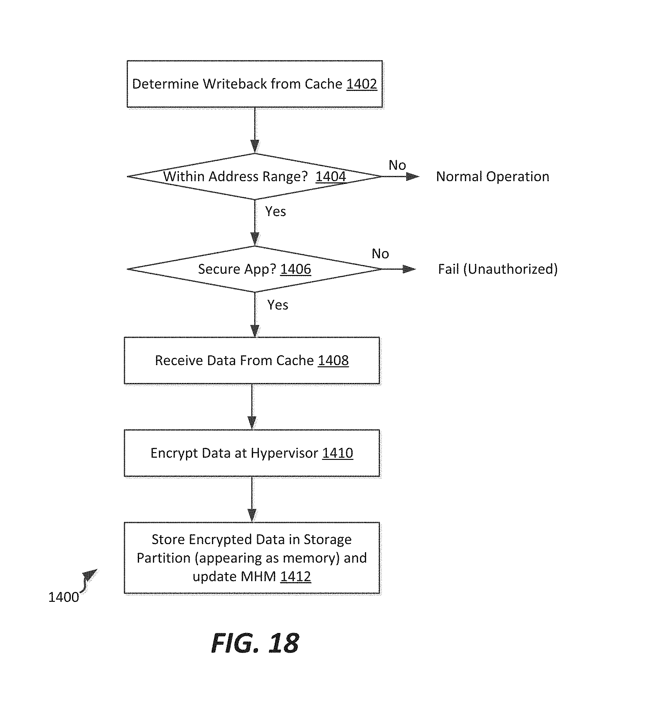 FIG. 17 illustrates a flowchart of a method 1300 for storing secured data in a hypervisor-enforced secured memory, according to an example embodiment. The method 1300 generally begins upon receipt, at the hypervisor, of a memory request (e.g., a write operation) from an application in a partition (step 1302). The method 1300 can be performed for example, in response to a write operation issued to an API published by a monitor of the hypervisor that hosts the partition including a secure application. The method includes a determination that the write operation is within a specific address range associated with encrypted memory (step 1304). If the address is not in a range associated with encrypted memory, operation proceeds as normal, since the address access is associated with unencrypted memory. However, if the address is within the range associated with encrypted memory, the hypervisor will also determine if the request is received from a secure application (step 1306). Such determinations can be performed, for example, based on an extended page table handler that manages operations based on the determination of a memory request addressing the specific memory range.