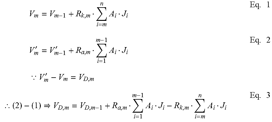 Vm=Vm-1+Rk,m·i=mnAi·JiEq.1Vm=Vm-1+Ra,m·i=1m-1Ai·JiEq.2Vm-Vm=VD,m(2)-(1)VD,m=VD,m-1+Ra,m·i=1m-1Ai·Ji-Rk,m·i=mnAi·JiEq.3