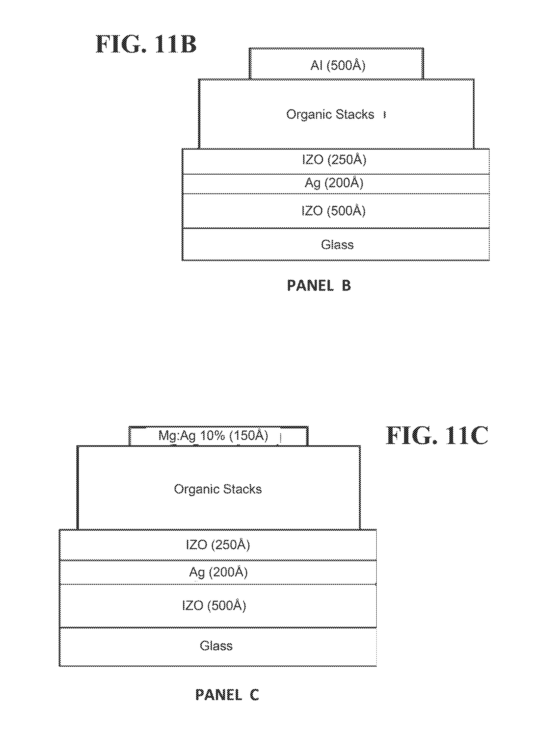 In a further test, three OLED panels with the layout shown in FIG. 10 were fabricated. The anode and cathode electrodes are placed on the opposite single edges of the panel. The dimension of the panel is 57 mm×126 mm, which yields an active area of 72.1 cm2. Device structures of the three panels are shown in FIGS. 11A-C. All three OLED panels include the same anode structure (500 Å ITO/250 Å Ag/200 Å ITO) and the same organic layer stack, but different cathodes. Panel A (FIG. 11A) includes a 1000 Å Al layer; Panel B (FIG. 11B) includes a 500 Å Al layer; and Panel C (FIG. 11C) includes a 150 Å layer of Mg doped with 10% Ag. The sheet resistances of these electrodes measured from four-point probe sheet resistance meter are summarized in Table 2. Both Panels A and C have one electrode that is more conductive than the other. Panel B has two electrodes with similar sheet resistances. Panel A has the most conductive cathode among all three panels.