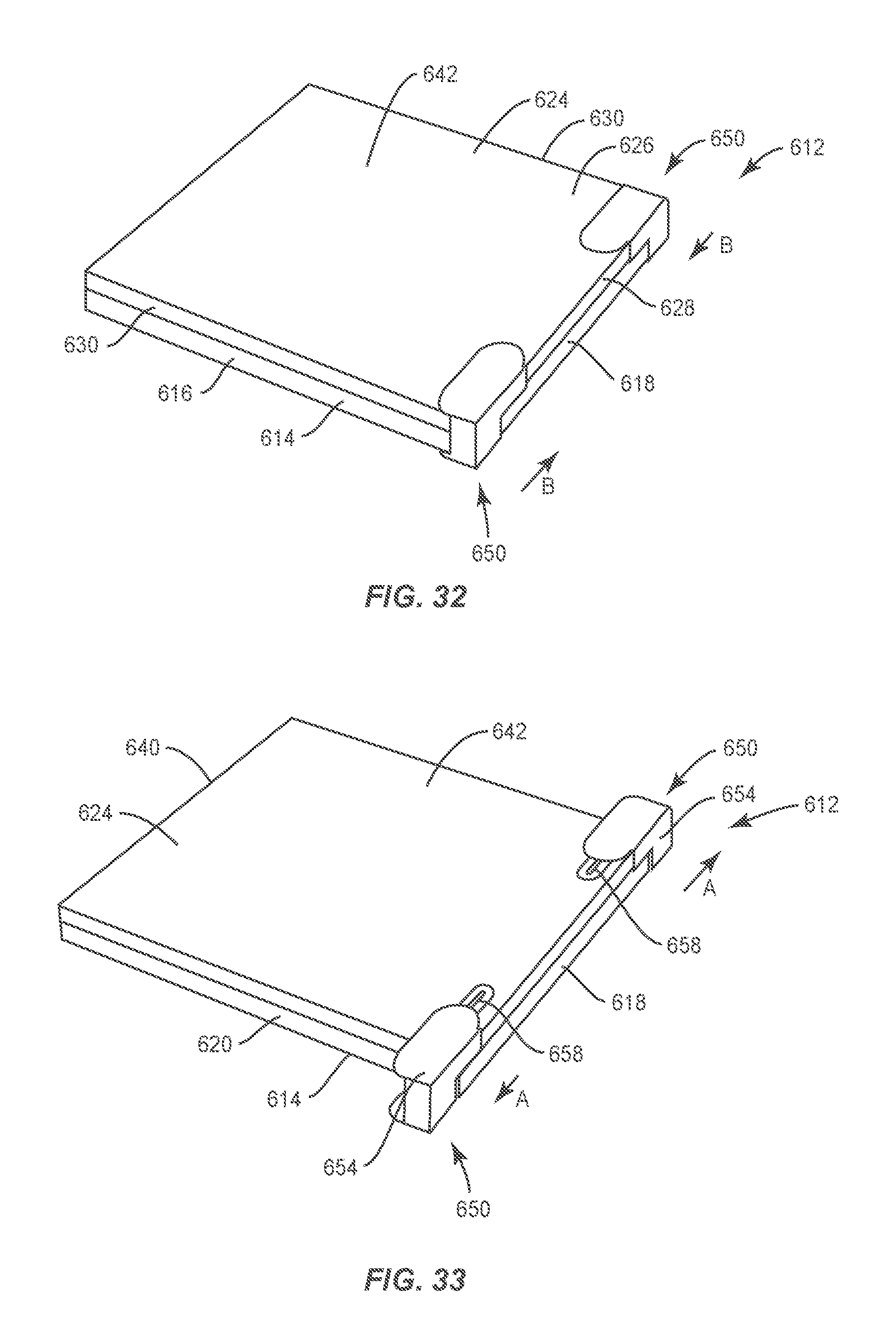 In some embodiments, pocket 624 is rotatable relative to pocket 614 through an angular range of 0 through 360 degrees. In a closed configuration, as shown in FIG. 32, spine 640, sidewalls 618, 620, 628, 630, and sections 616, 626 define a substantially enclosed cavity configured for disposal of unit dose pages 660 and/or information inserts 670 such that pocket 624 and pocket 614 prevent access to contents of medicament dispensing container 612. In some embodiments, in a closed configuration, pocket 624 and pocket 614 provide a child-resistant medicament dispensing container. In an open configuration, as shown in FIG. 34, pocket 614 is rotated relative to pocket 624 such that medicament dispensing container 612 rests flatly on a surface to facilitate ease of access to the contents of the cavity of medicament dispensing container 612.