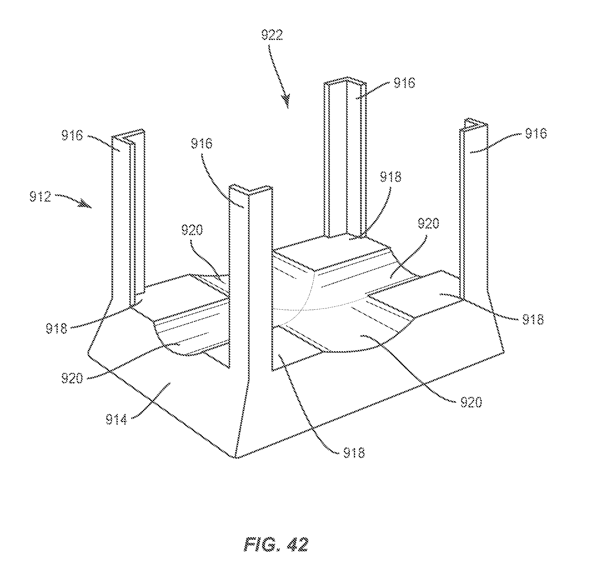 In one embodiment, base portion 914 includes flat surfaces 918. Surfaces 918 are positioned adjacent columns 916 and form a bottom surface to be disposed with a stack of containers 940. Base portion 914 includes a recess to allow a user to fit a finger under a container 940 disposed with surfaces 918 to remove one or more containers 940 from cavity 922. In one embodiment, as shown in FIG. 42, packaging 912 comprises two pairs of recesses 920 that extend between opposite sides of base portion 914. In other embodiments, recesses 920 may be variously configured. For example, in one embodiment, medication packaging 912 may comprise a single recess 920 or only one pair of oppositely positioned recesses 920.